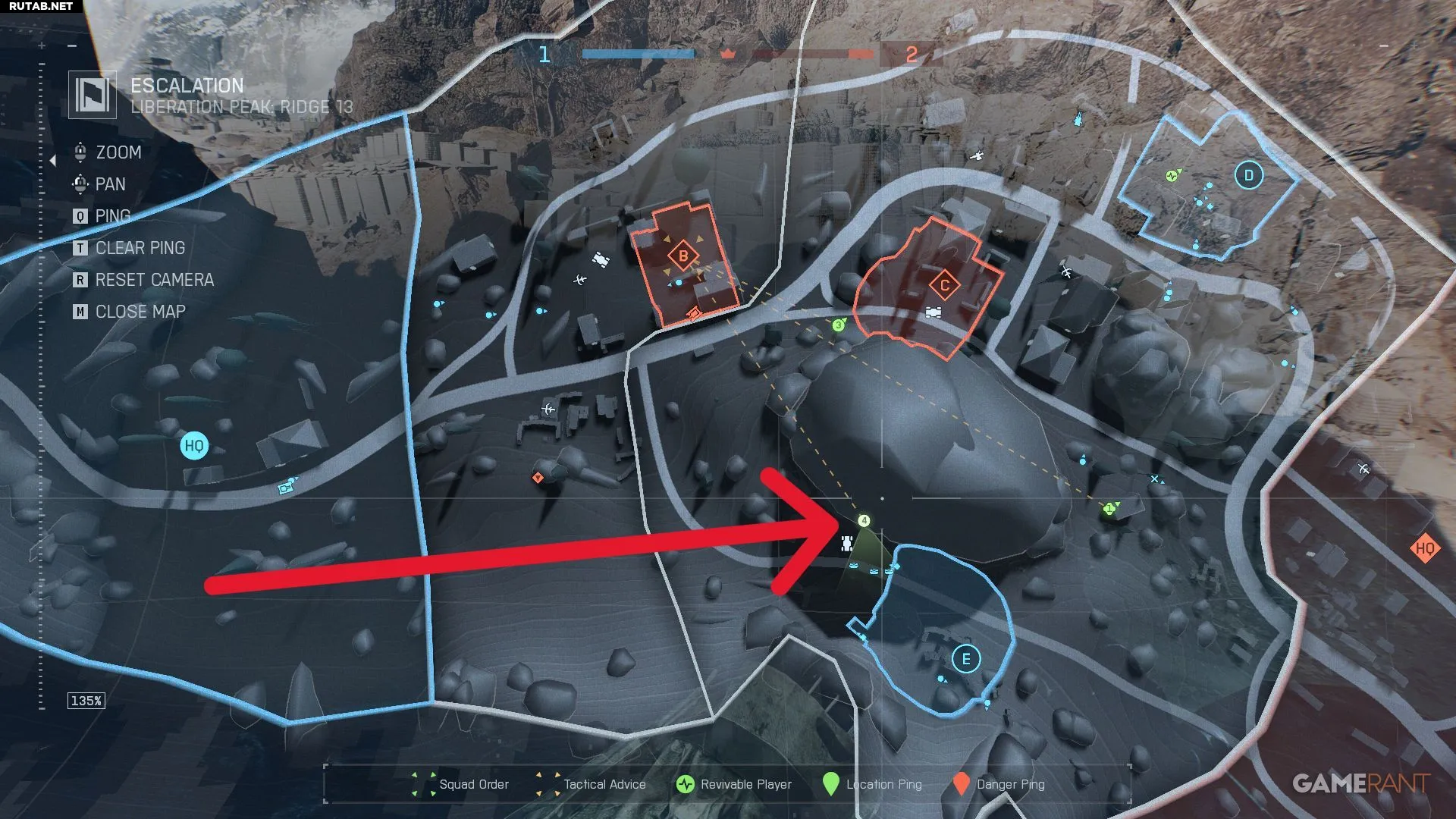 Цель F расположена у большого холма, что отлично подходит для снайперов, особенно если противник продвинется дальше центра карты.