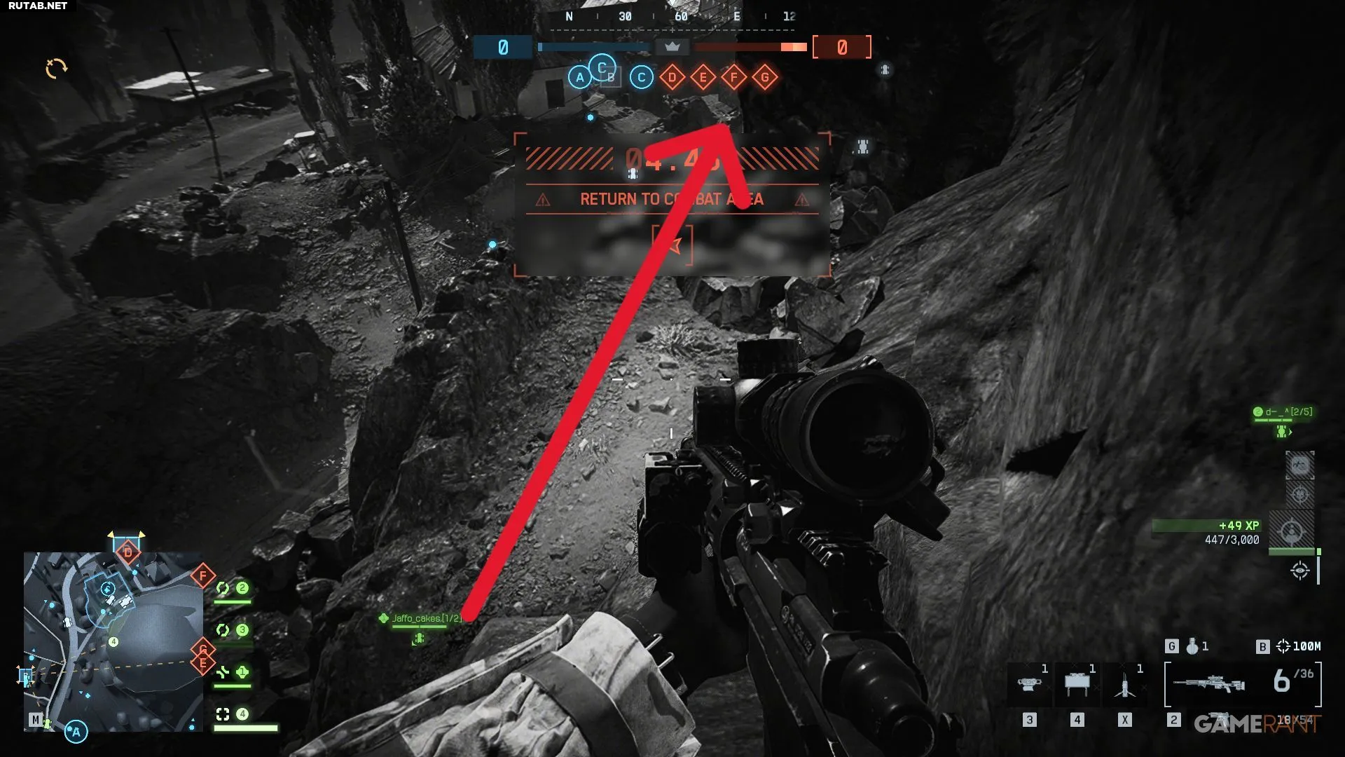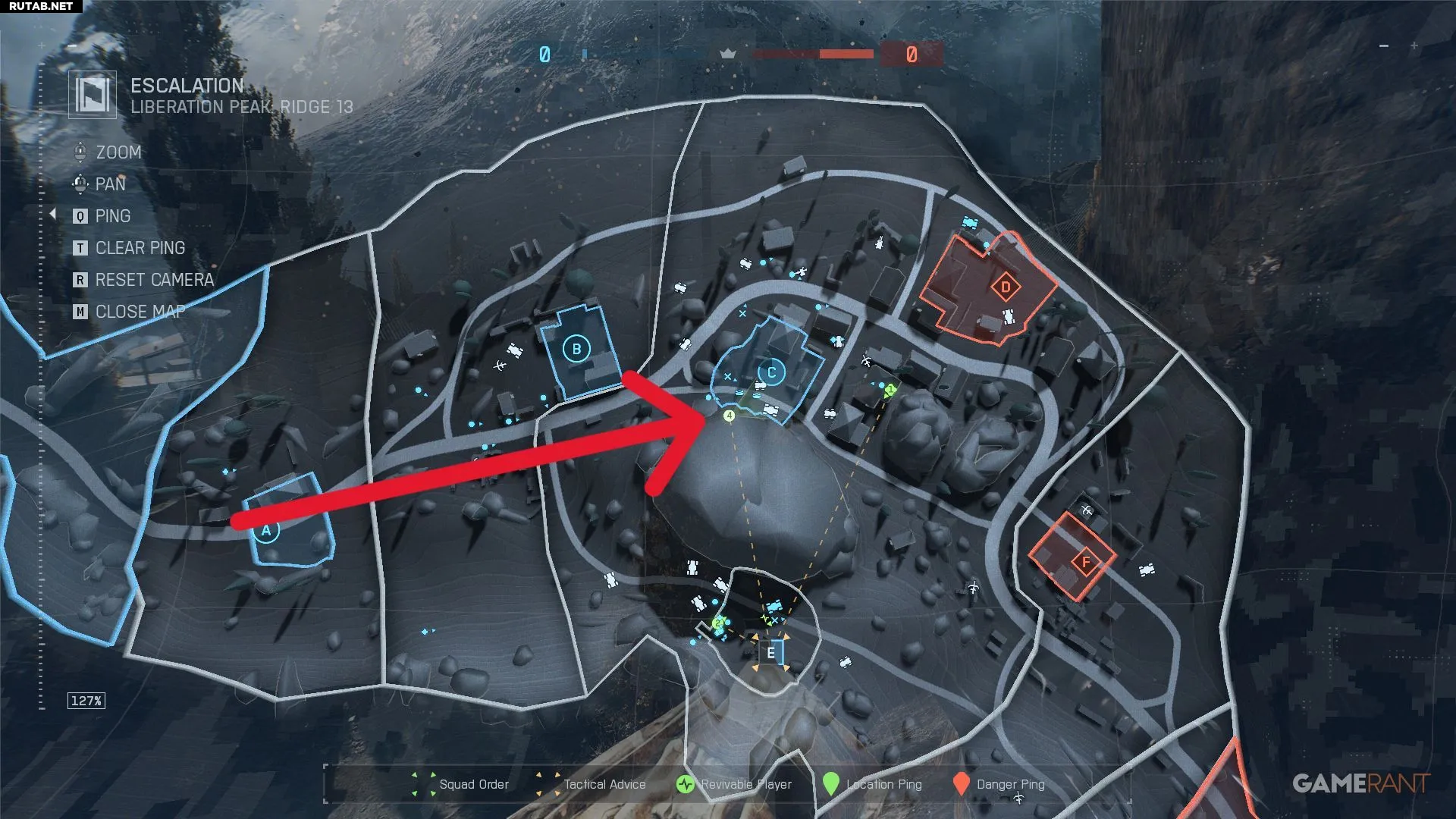 Для защиты узкого прохода у крупной скальной формации, где расположена цель C, снайперы Pax Armata могут взобраться на гребень слева. Чтобы занять показанную позицию, им придётся пробежать через участки, где появляется предупреждение о возвращении в боевую зону.