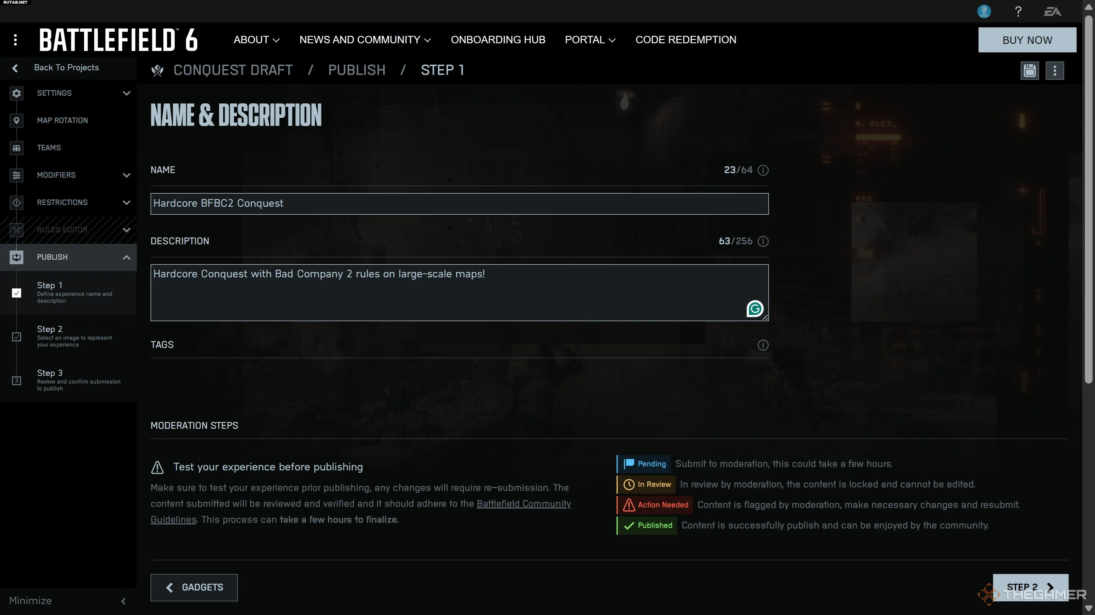 " alt=""> " alt=""> " alt="">На заключительном этапе вы попадёте на вкладку «Publish», где сможете дать название своему новому игровому режиму и серверу, а также написать для него описание. После выбора изображения останется только подтвердить создание — теперь вы и другие игроки сможете получить доступ к вашему творению в Battlefield 6!