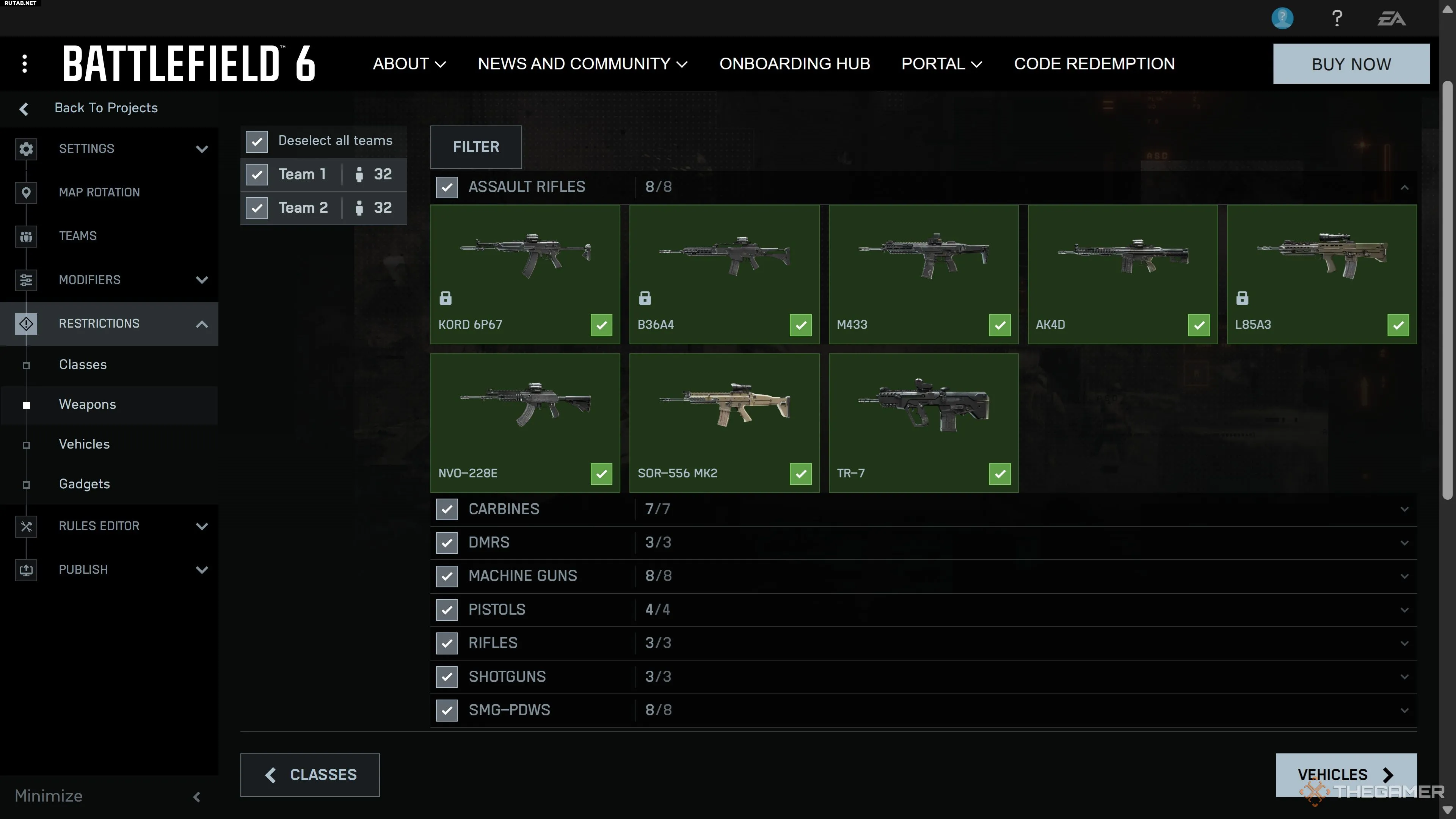 - Оружие: Штурмовые винтовки, ПП, пистолеты, снайперские винтовки — что угодно можно запретить. Хотите режим только для снайперов? Именно здесь вы запретите всё остальное оружие, чтобы этого добиться. Опять же, это в основном используется для создания узкоспециализированных режимов или нишевых плейлистов.
