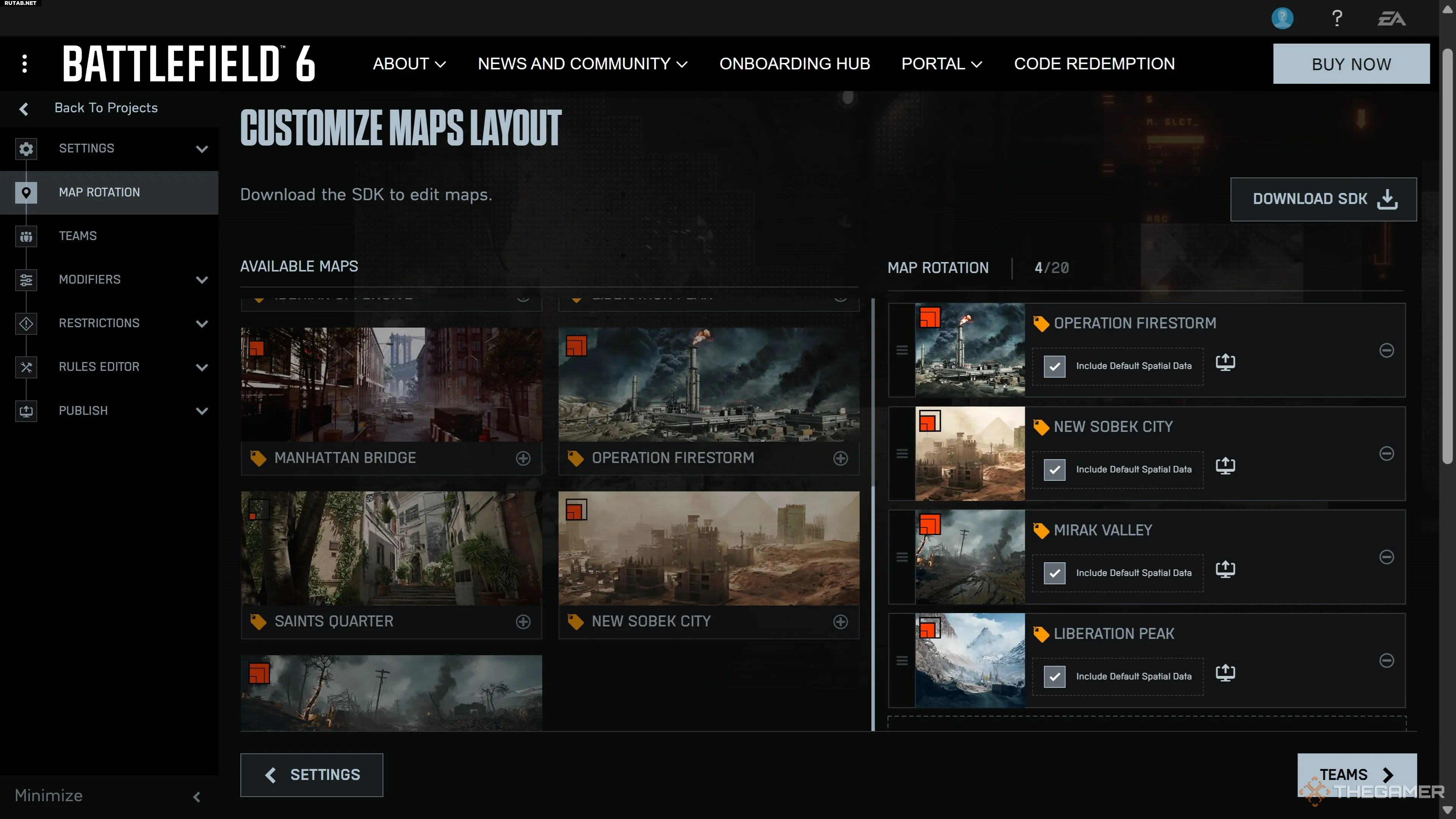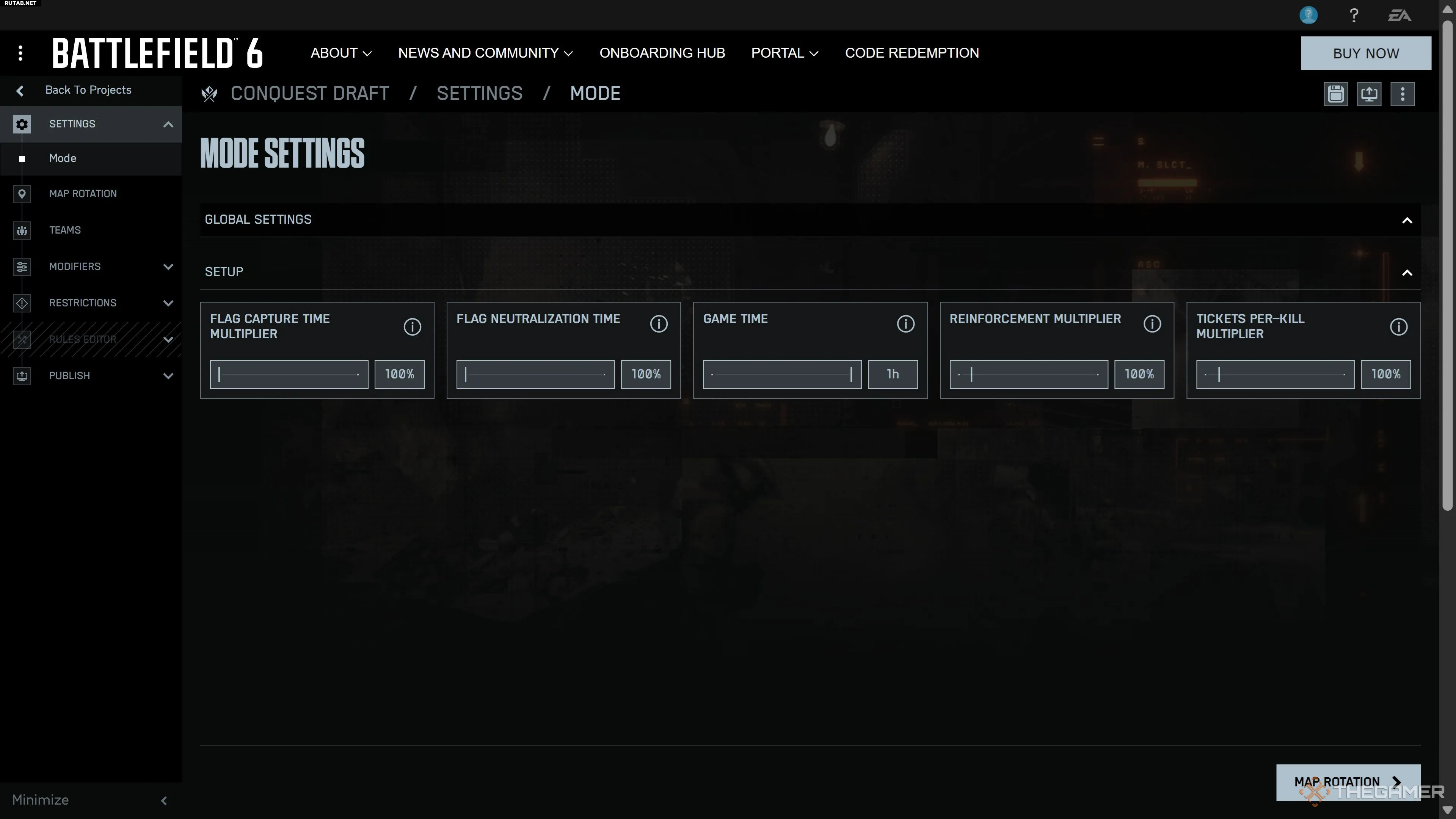 " alt="">Следующий простой, но важный раздел в Портале Battlefield 6 — «Ротация карт». Здесь вы можете выбрать конкретные карты для постоянной ротации на вашем сервере. Если вы создаёте пользовательский режим (Custom Mode), здесь же вы выбираете карты, созданные вами или другими игроками с помощью Gadot Creation Tool. В противном случае можно выбрать стандартные карты.