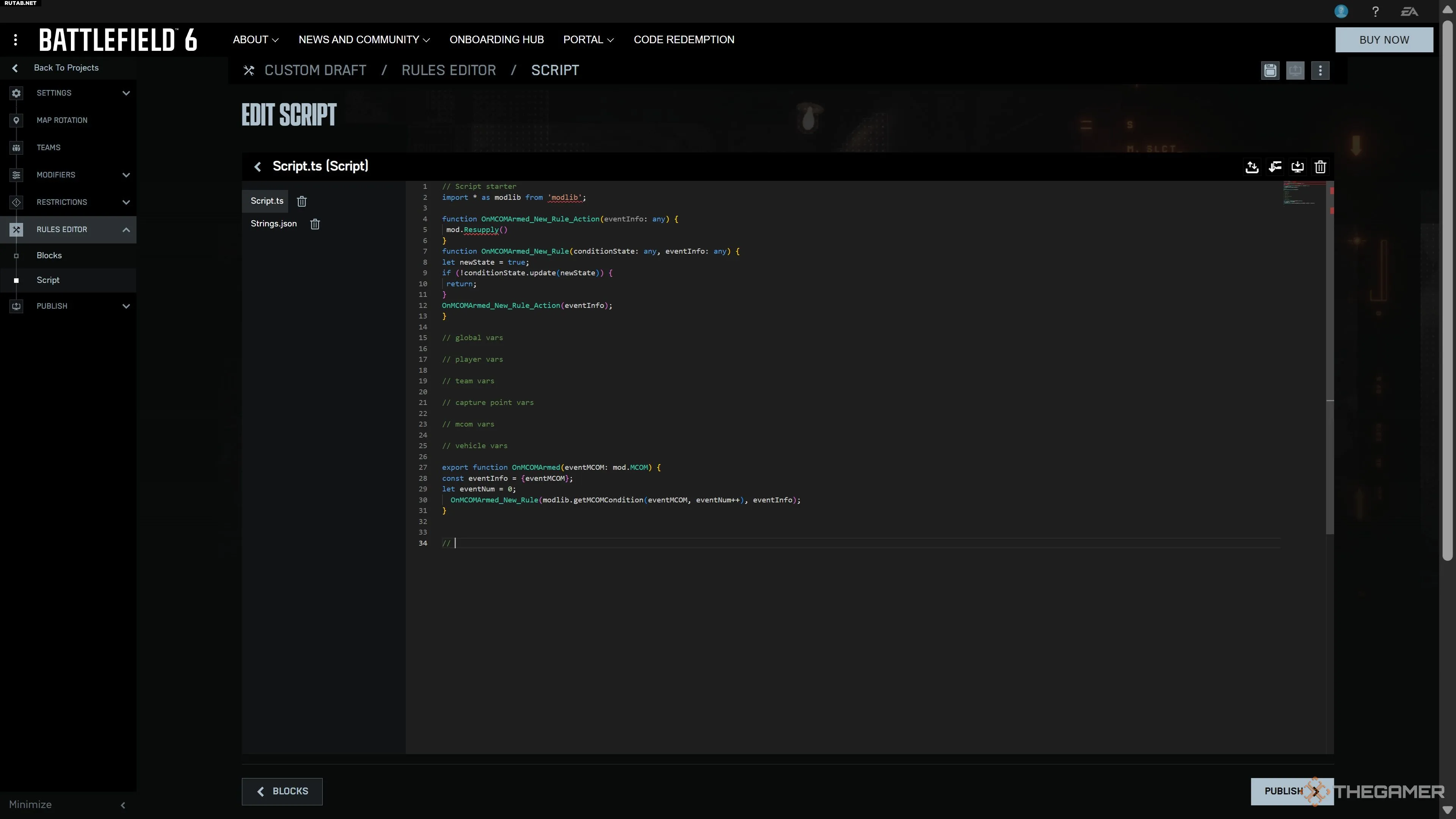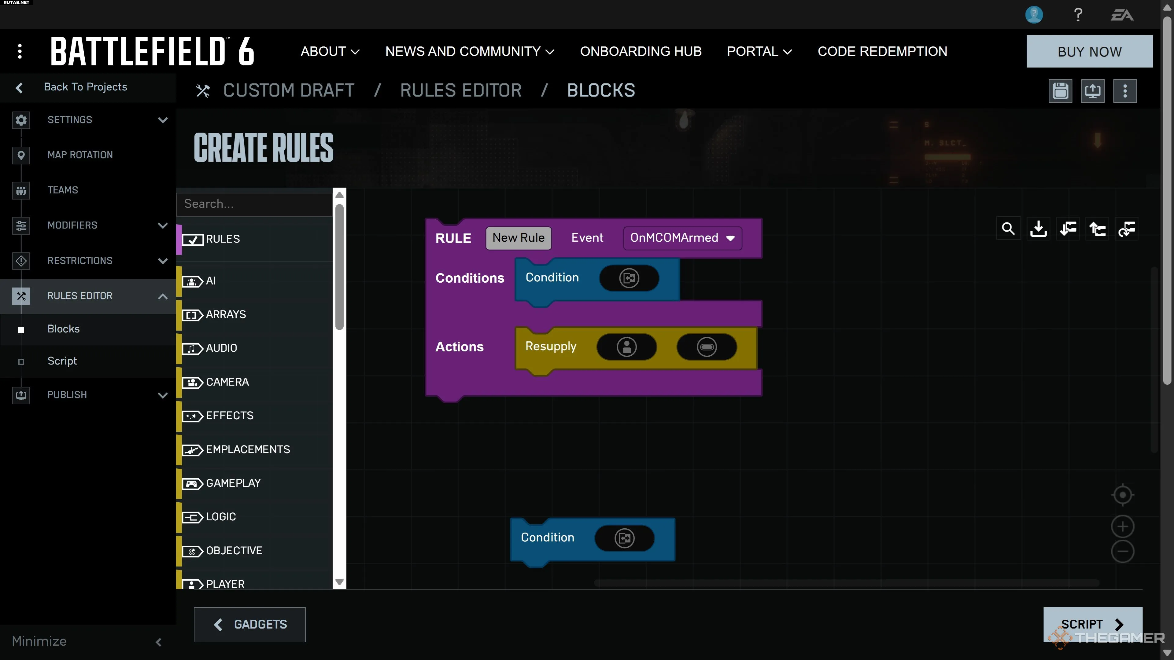 Затем вы можете перейти на вкладку «Edit Script» и скопировать и вставить свой новый скрипт. Например, мы создали правило, которое пополняет боезапас игрока каждый раз, когда он устанавливает заряд на M-COM станцию, и это лишь один из простейших примеров. Если у вас есть знания или желание разобраться в этой системе глубже, вы сможете создавать по-настоящему уникальные и продуманные игровые режимы!