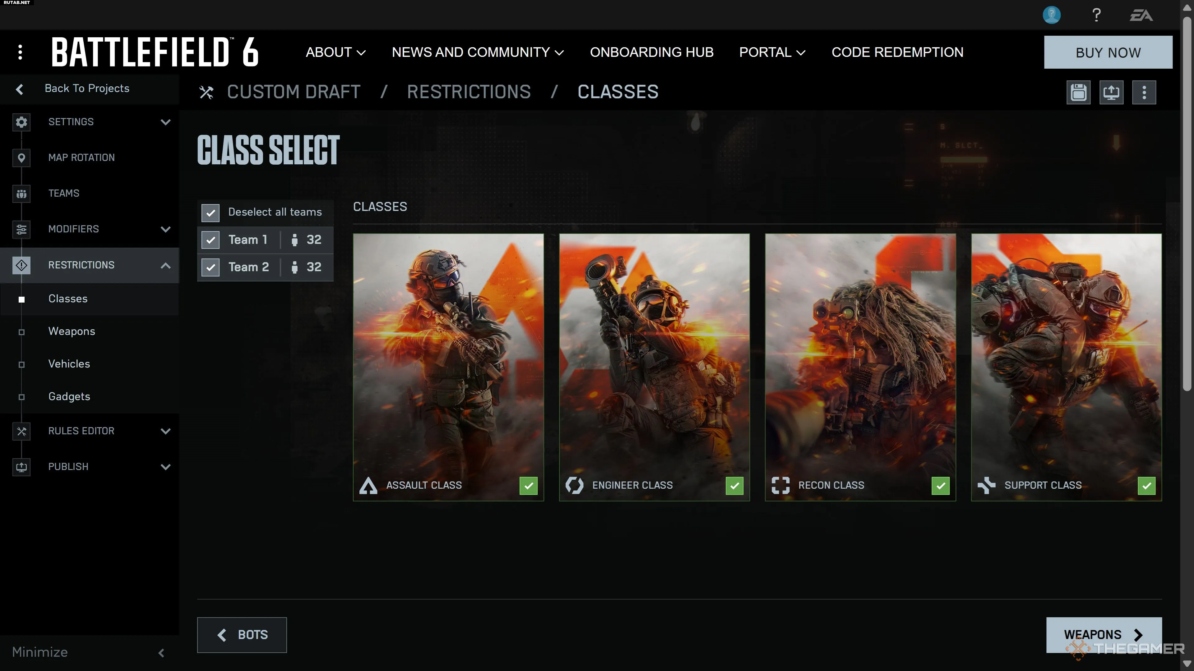 - Классы: Раздражает надоедливый класс «Штурмовик» и его сломанное дробовик? Забудьте о простом запрете оружия — вы можете отправить весь класс в небытие. Шутки в сторону, именно здесь вы выбираете, какие классы будут доступны на сервере. Если вы планируете создать особый игровой режим, этот раздел будет критически важен.