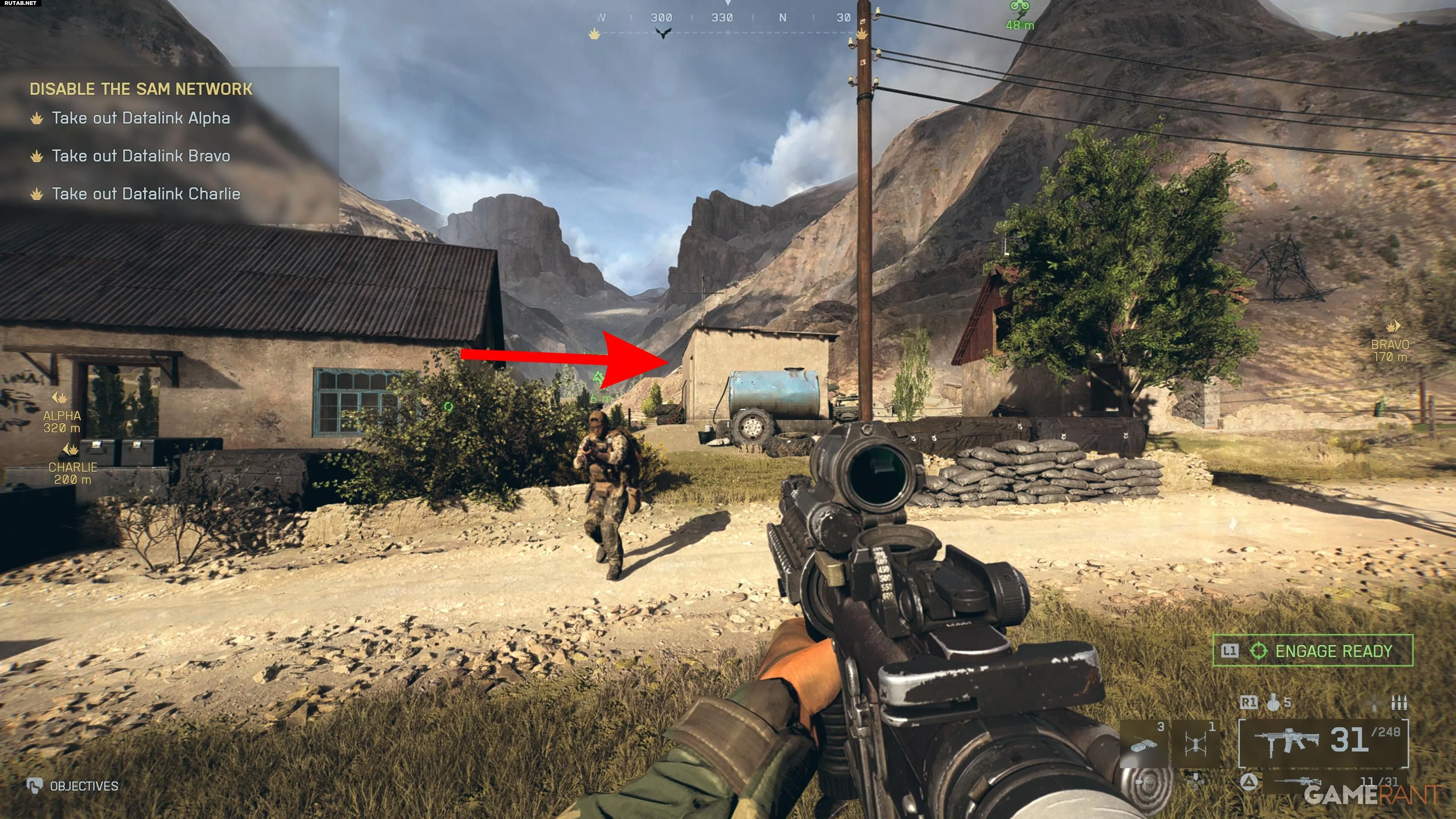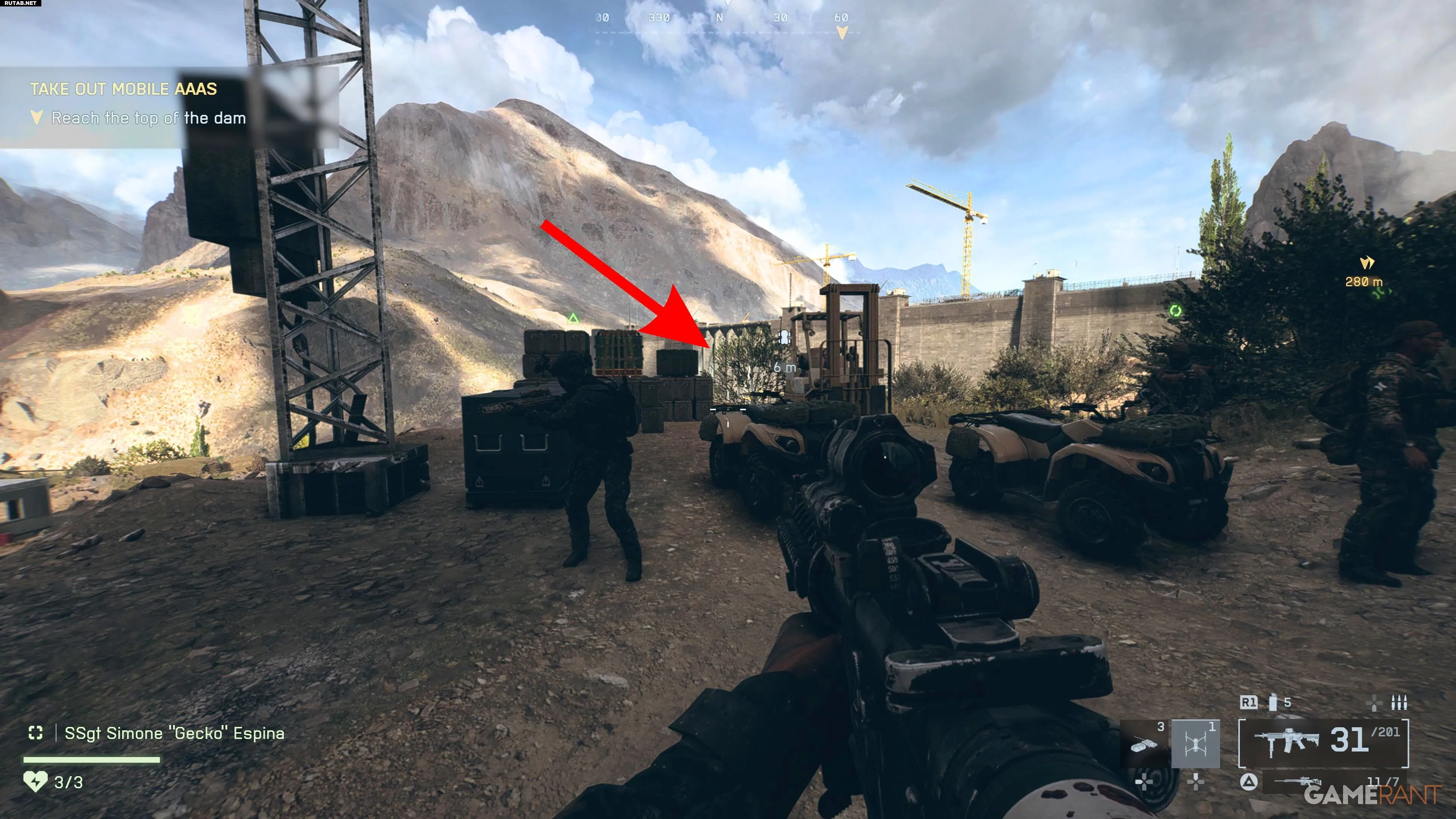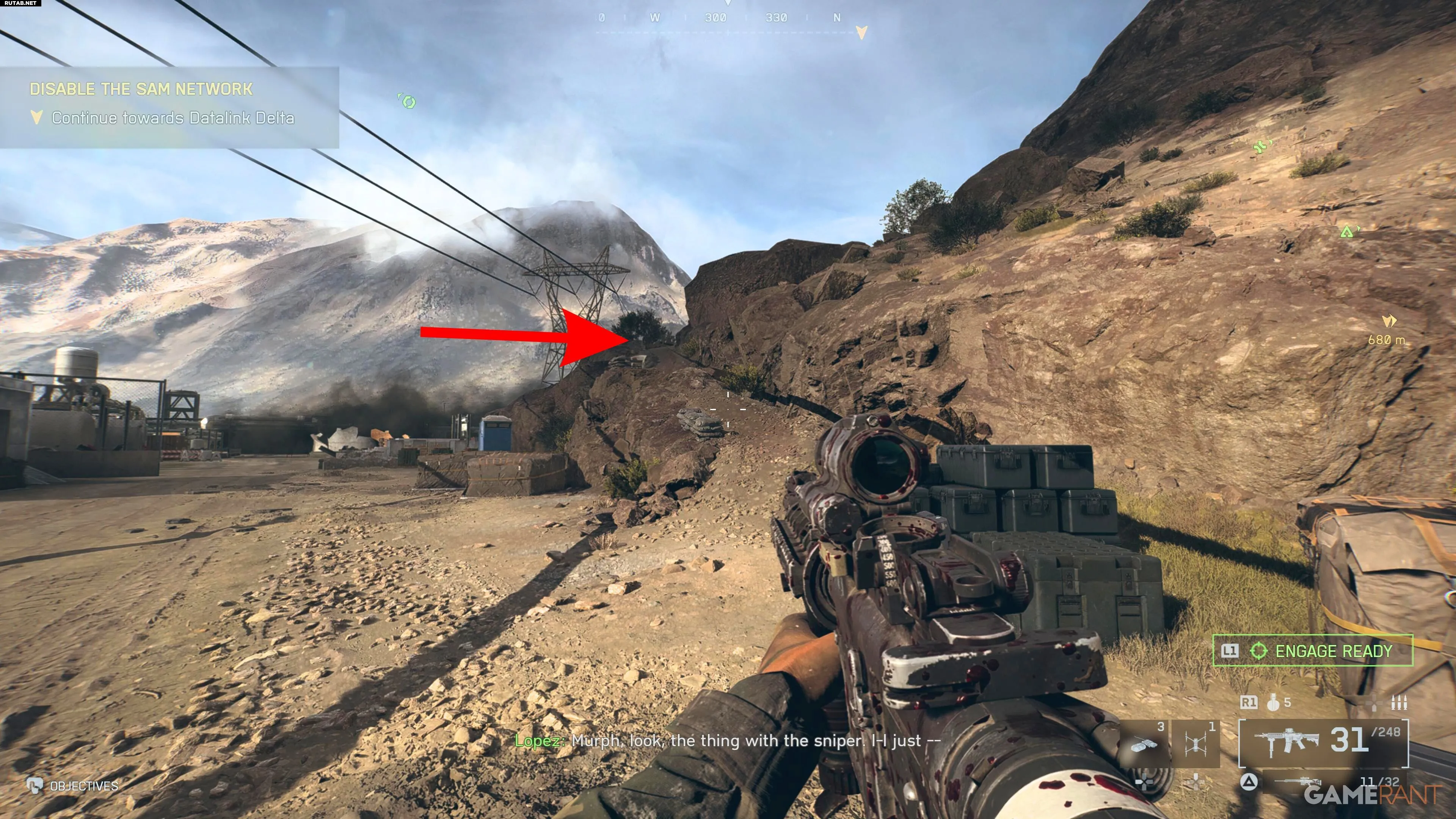 Продолжайте миссию до столкновения со снайпером. Следующей целью будет «Уничтожить подходящие подкрепления (Отключить сеть ЗРК)». Вам снова придётся использовать «Свитчблейд», чтобы справиться с двумя вертолётами и несколькими бронемашинами. После этого не идите по главной дороге. Вместо этого поверните налево и поднимитесь на холм, где находился снайпер, чтобы найти жетон.