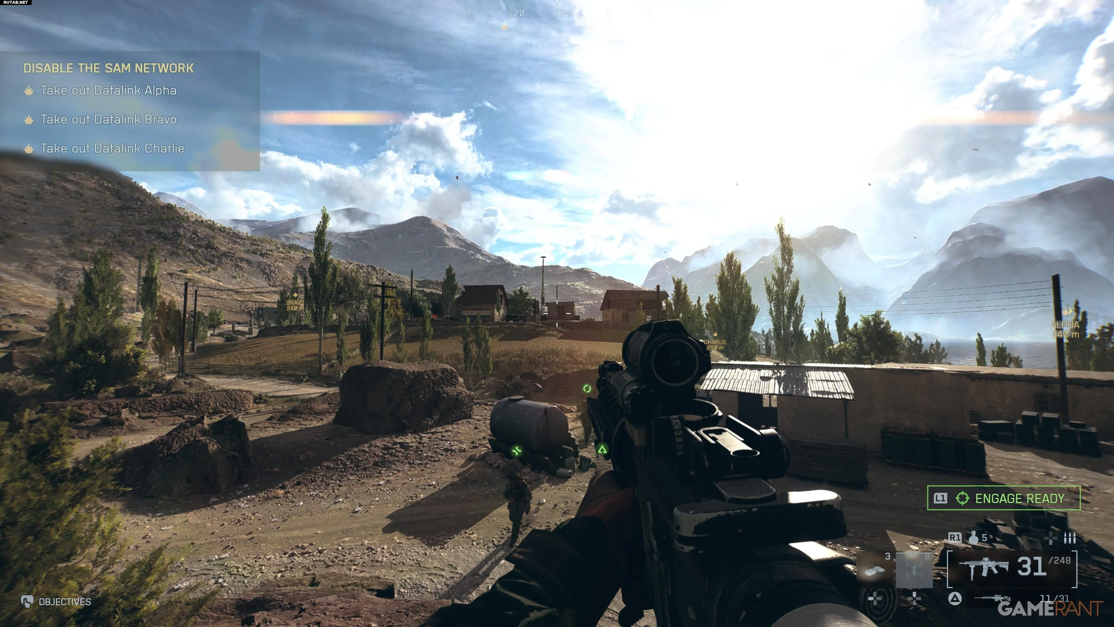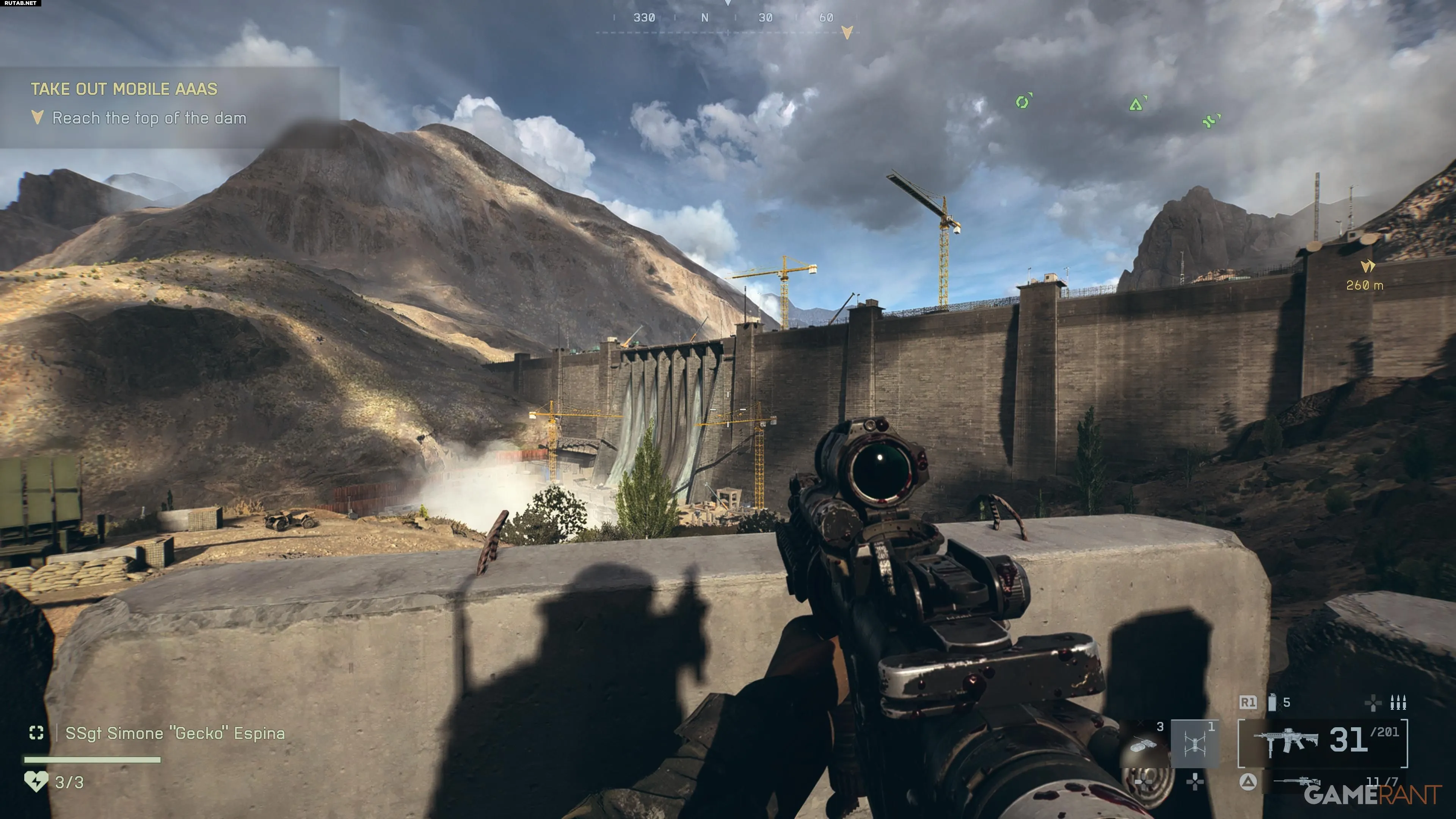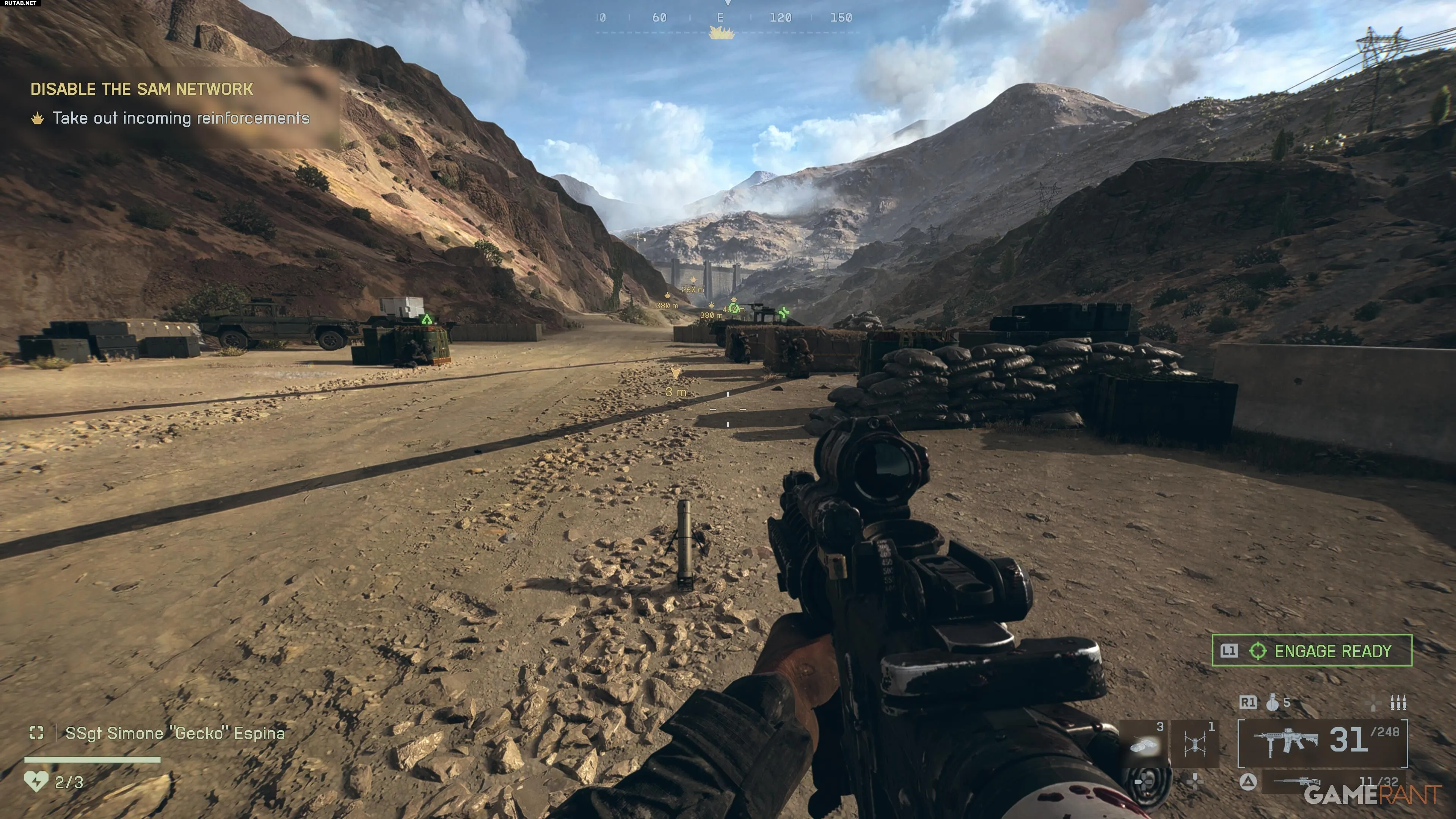Продолжайте миссию до столкновения со снайпером. Следующей целью будет «Уничтожить подходящие подкрепления (Отключить сеть ЗРК)». Вам снова придётся использовать «Свитчблейд», чтобы справиться с двумя вертолётами и несколькими бронемашинами. После этого не идите по главной дороге. Вместо этого поверните налево и поднимитесь на холм, где находился снайпер, чтобы найти жетон.