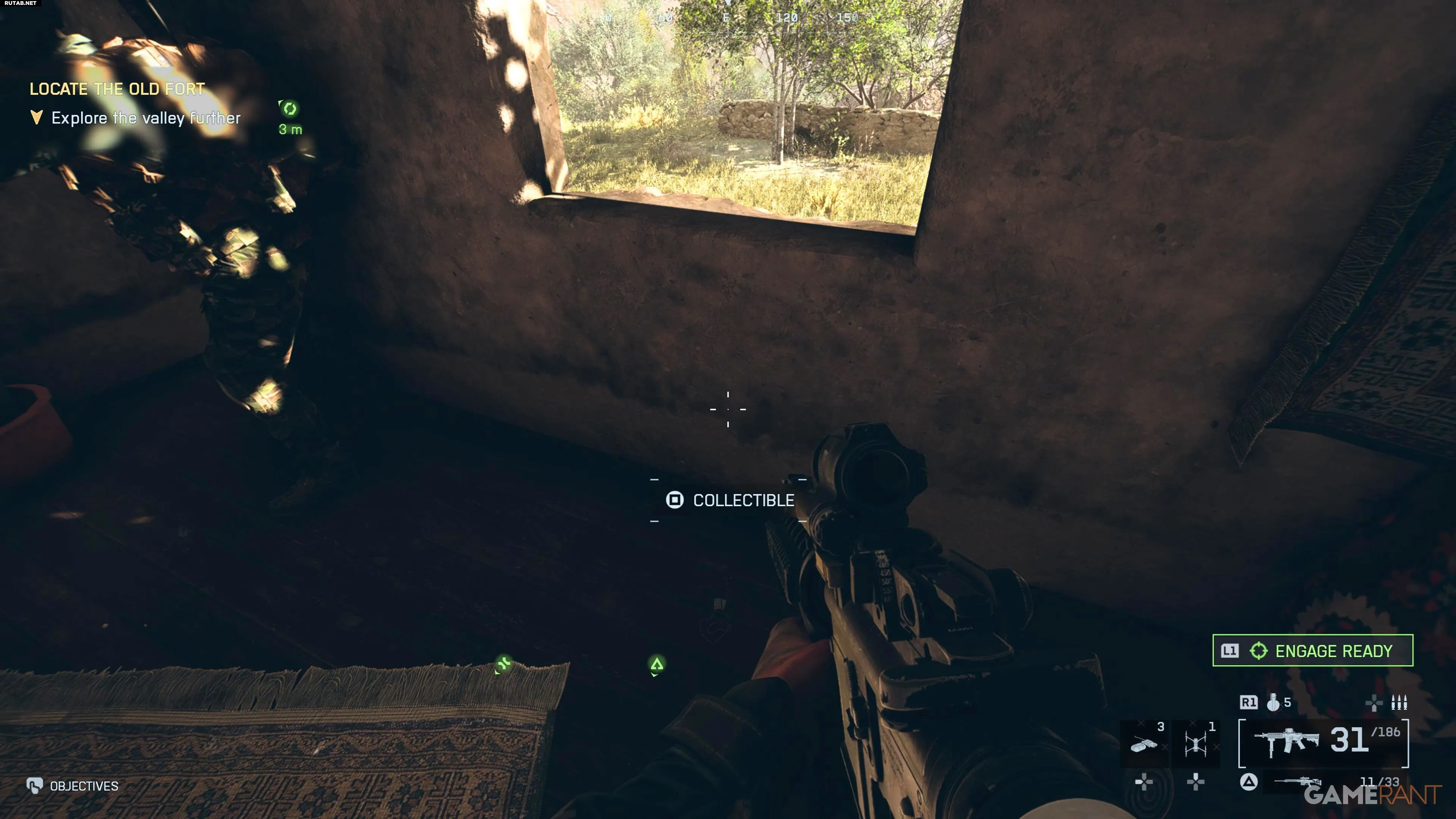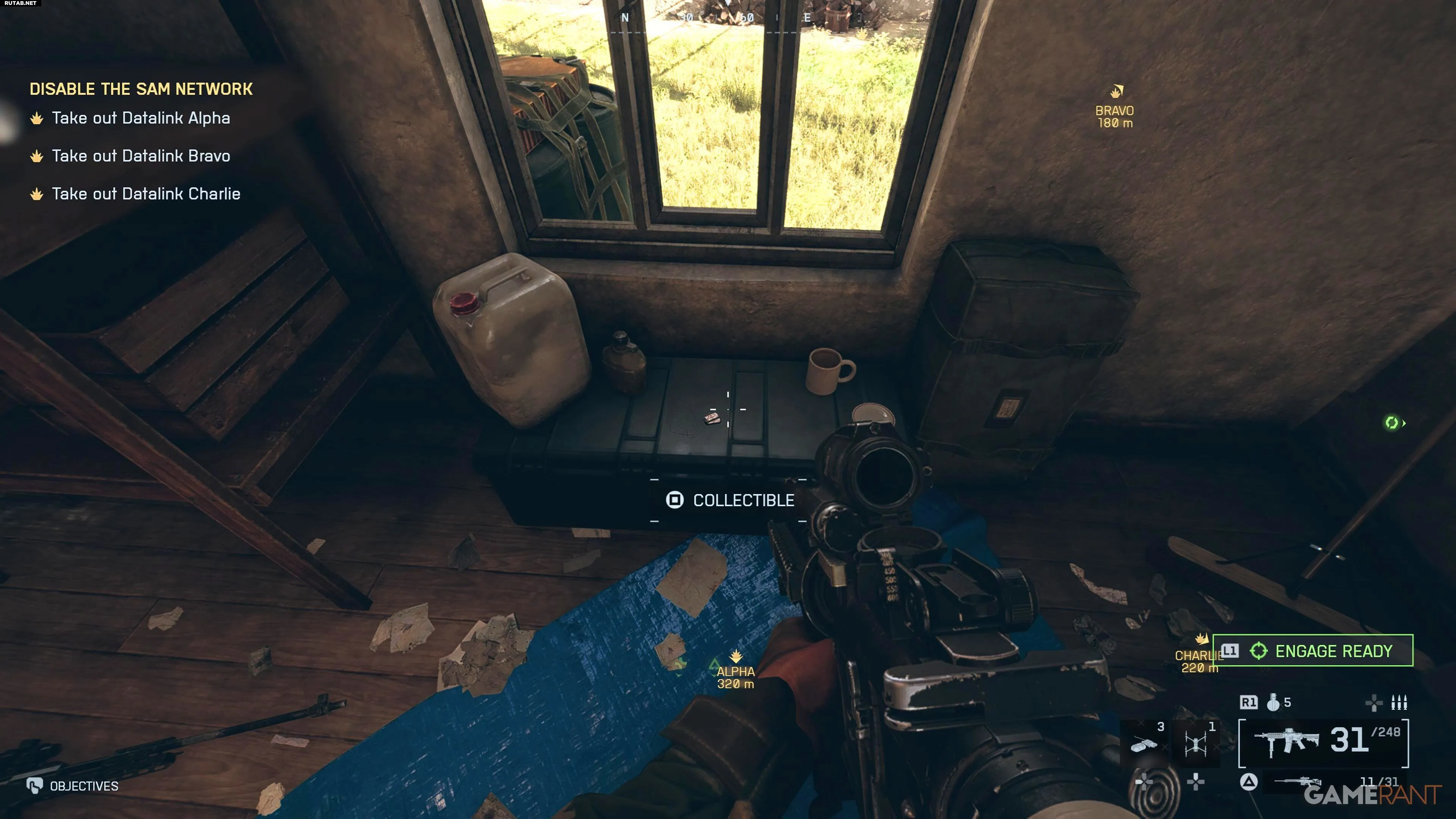 После получения цели «Уничтожить канал связи (Отключить сеть ЗРК)» направляйтесь к «Каналу связи Браво». Приближаясь к цели (около 200 м), вы увидите три дома с крышами разного цвета. Между домами с чёрной и красной крышей находится небольшое строение. Зайдите внутрь, и вы найдёте второй коллекционный предмет на ящиках.