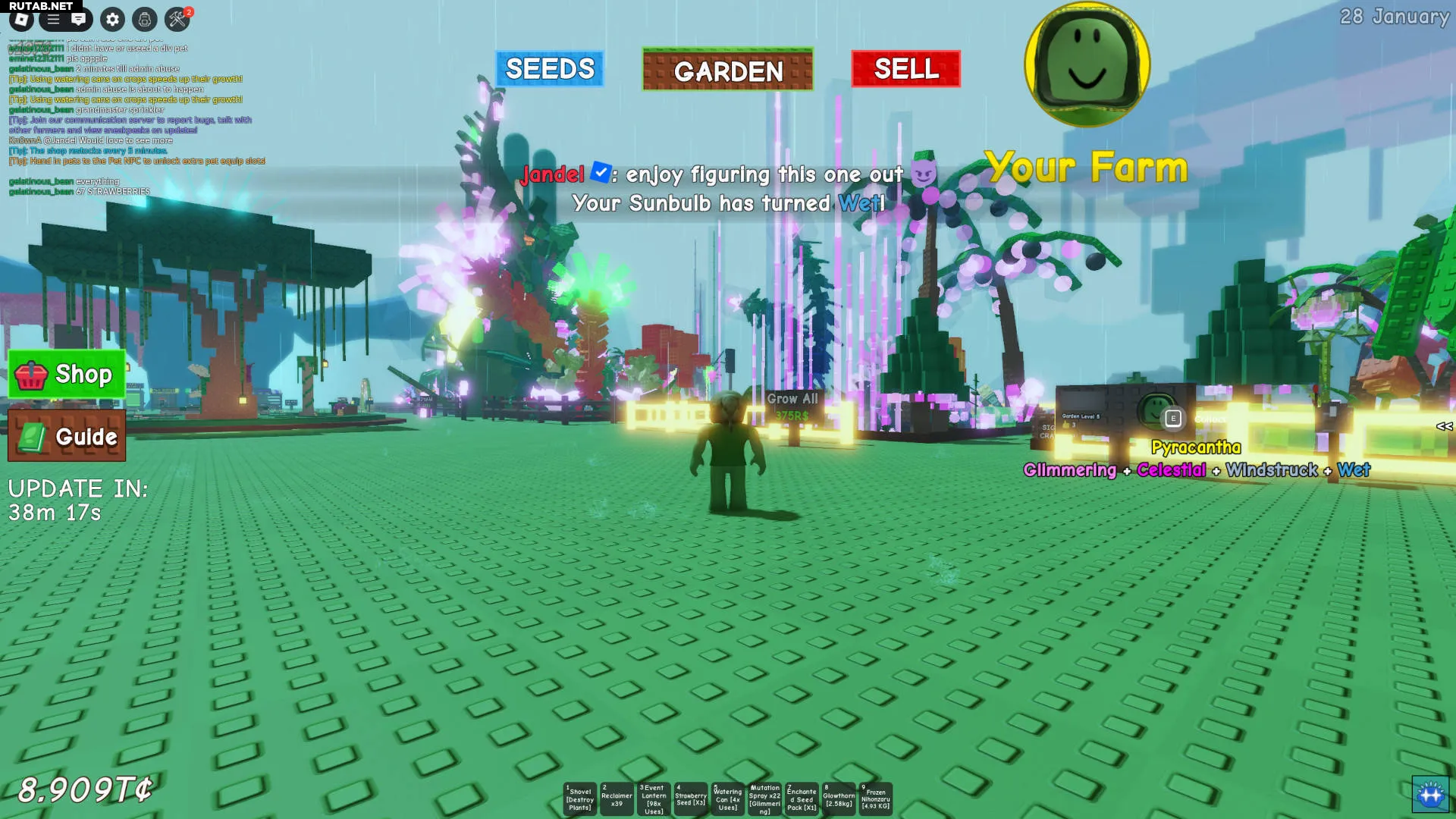 Название может показаться странным, но во время таких событий один из создателей игры появляется через крупные сообщения на экране, похожие на уведомления о пополнении магазина. Они объявляют о добавлении редких предметов в соответствующие магазины и предупреждают игроков о специальных погодных событиях, доступных только администраторам Grow A Garden.