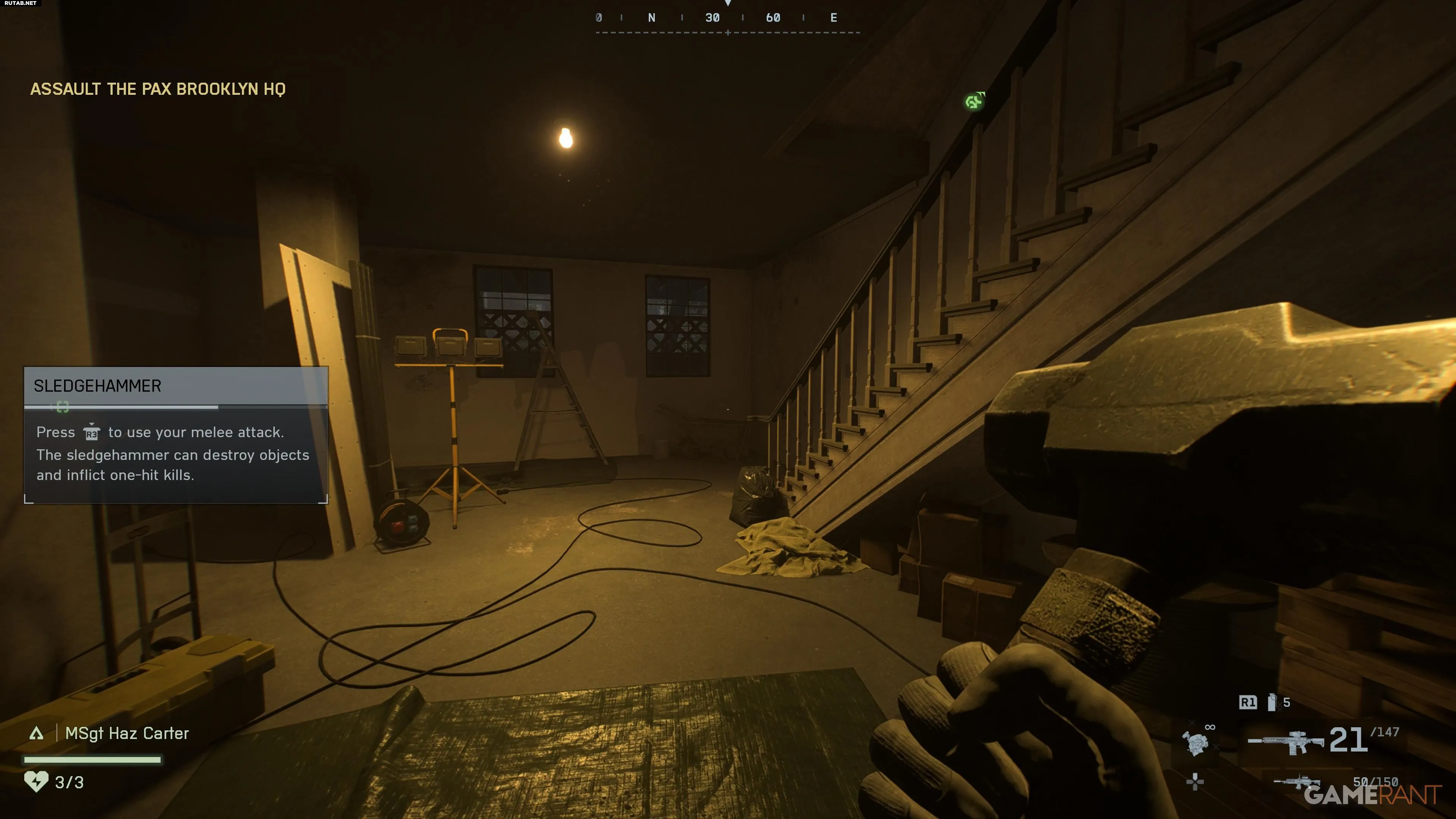 Кувалда убивает любого противника с одного удара, поэтому лучше держать её наготове. Для этого удерживайте кнопку ближнего боя — персонаж будет носить оружие в руках. Поднимитесь по лестнице, чтобы встретить первую группу врагов — впереди вас ждёт несколько схваток в тесных помещениях.