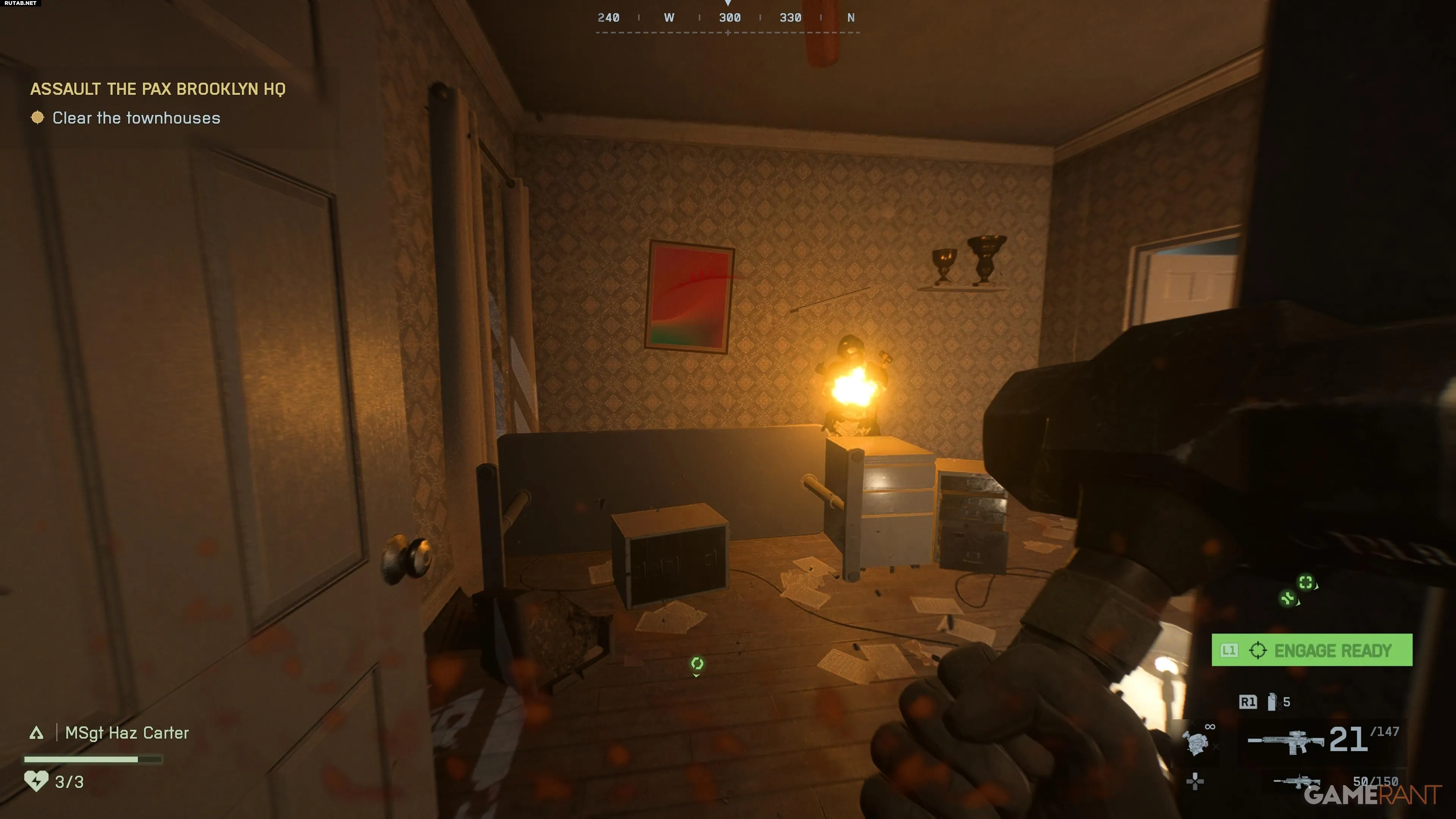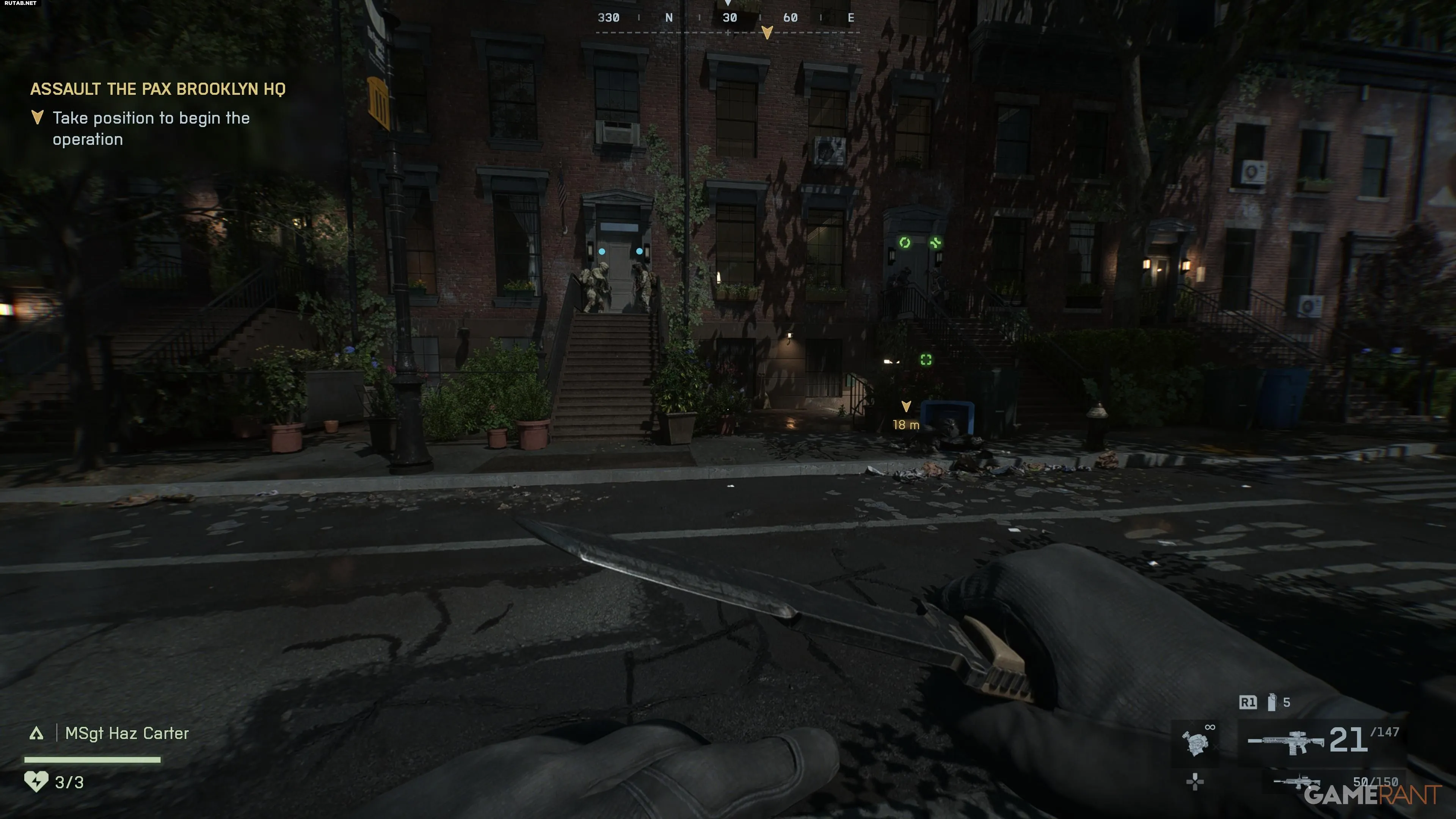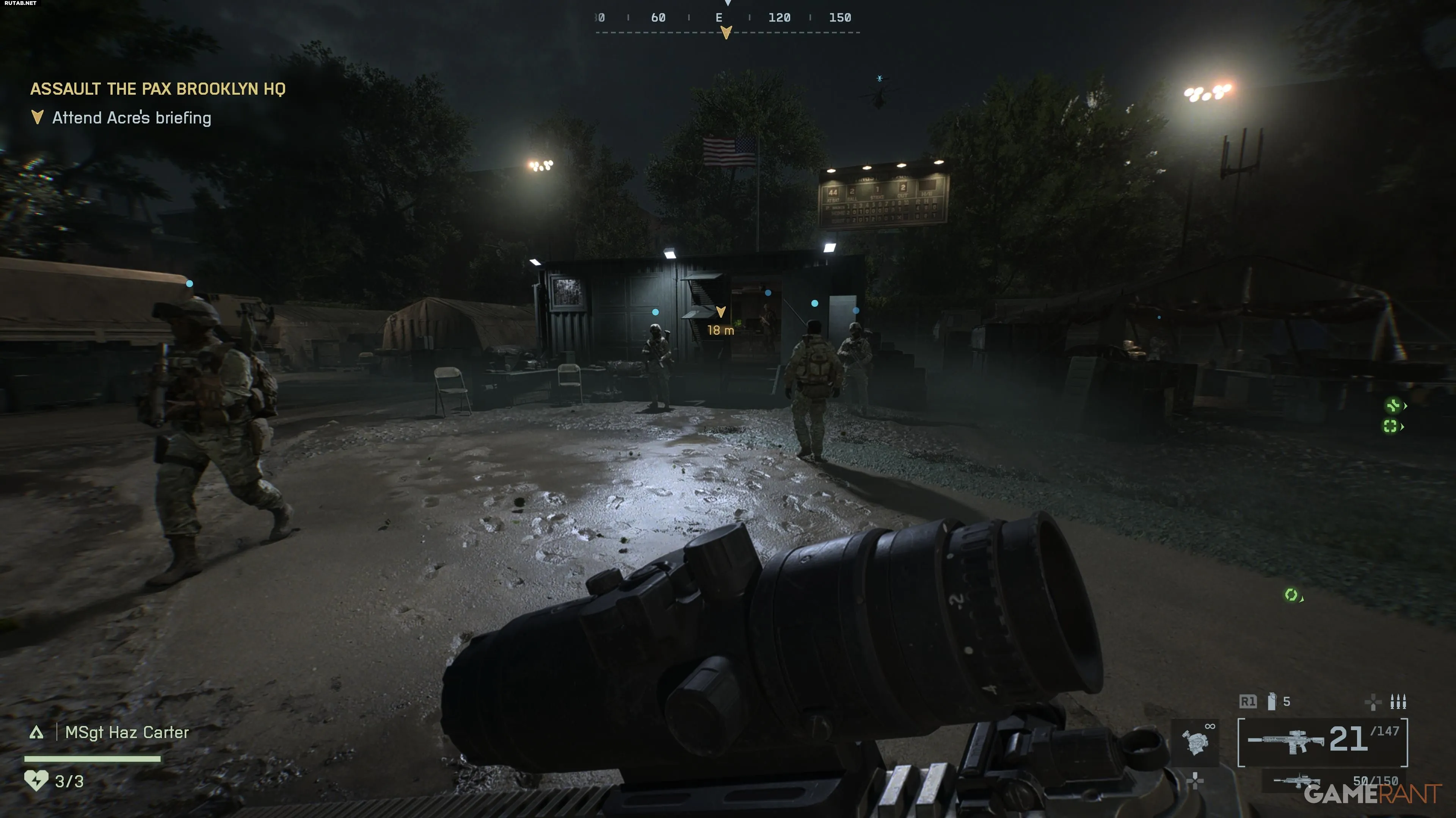 Лучший вариант — пятая миссия «Без сна», где вы играете за старшего сержанта Хэза Картера. Для удобства выберите сложность «Новичок» — ИИ противников будет менее точным и агрессивным. В начале миссии вы выйдете из вертолёта и последуете за сержантом Эйкром в комнату для брифинга.