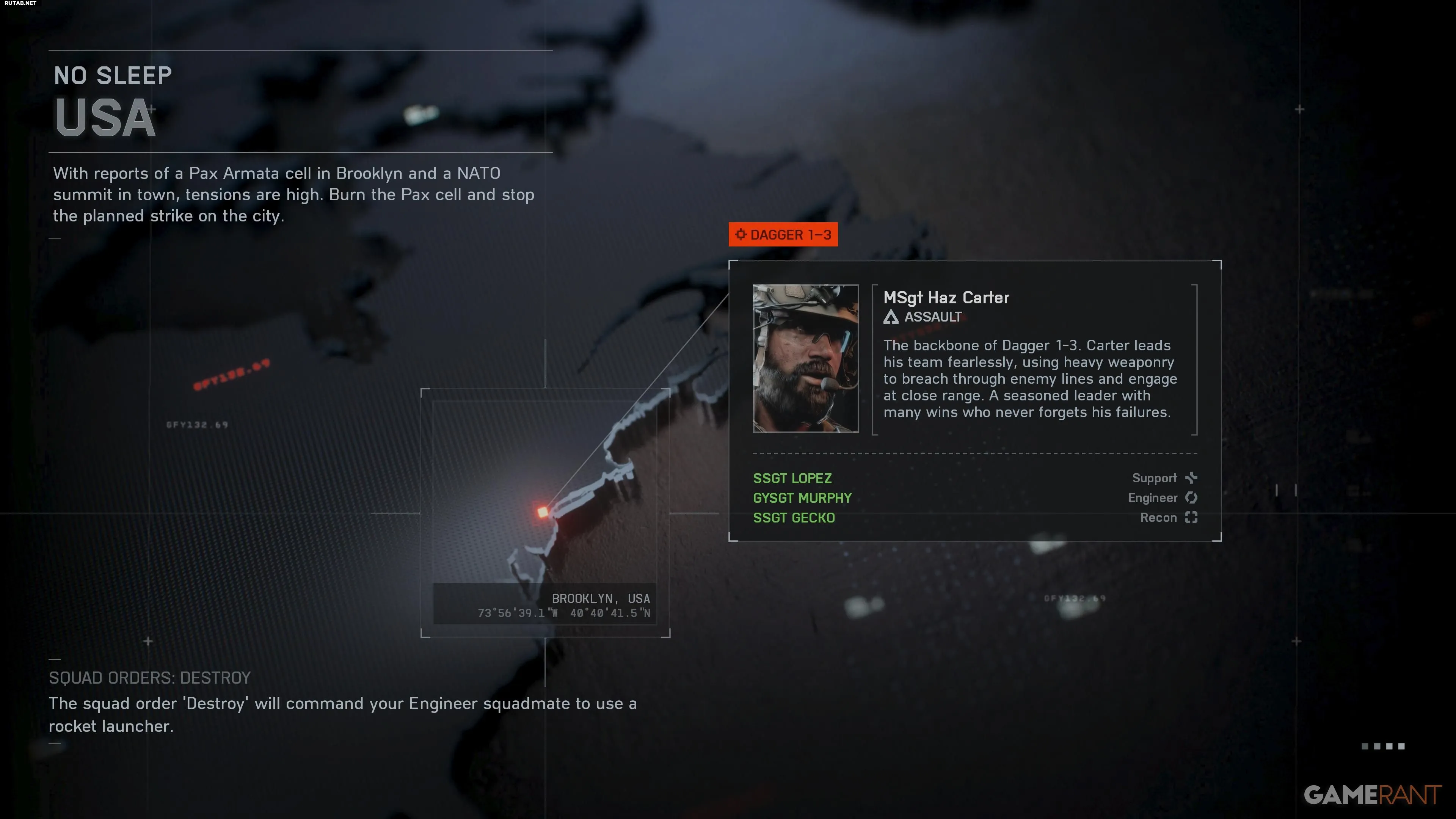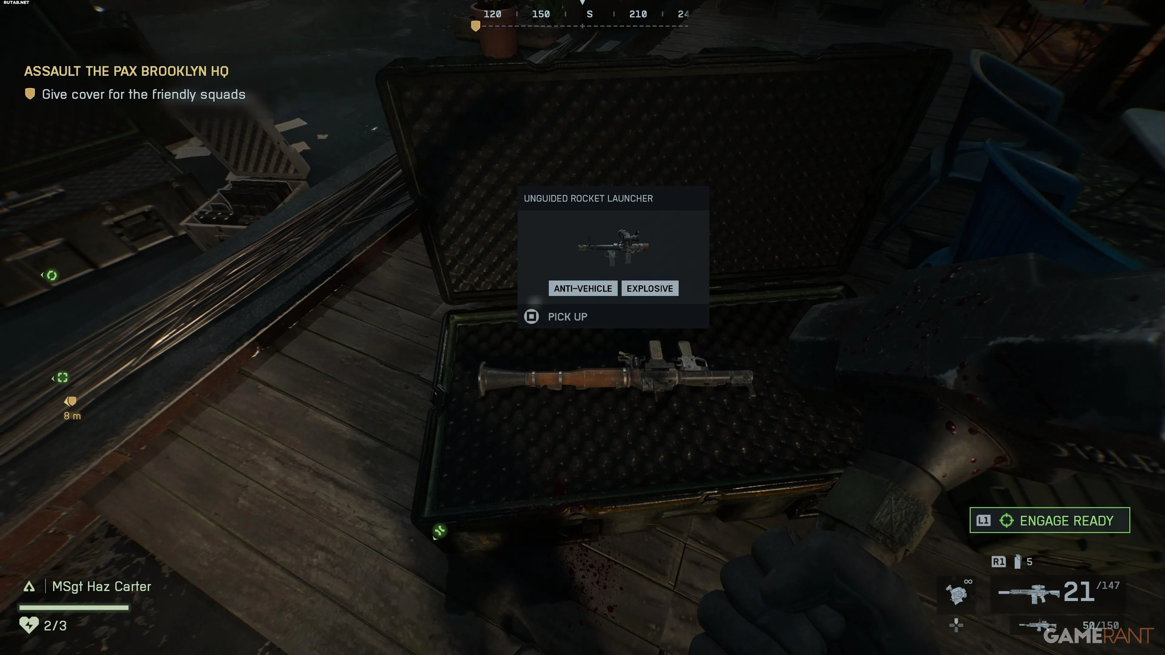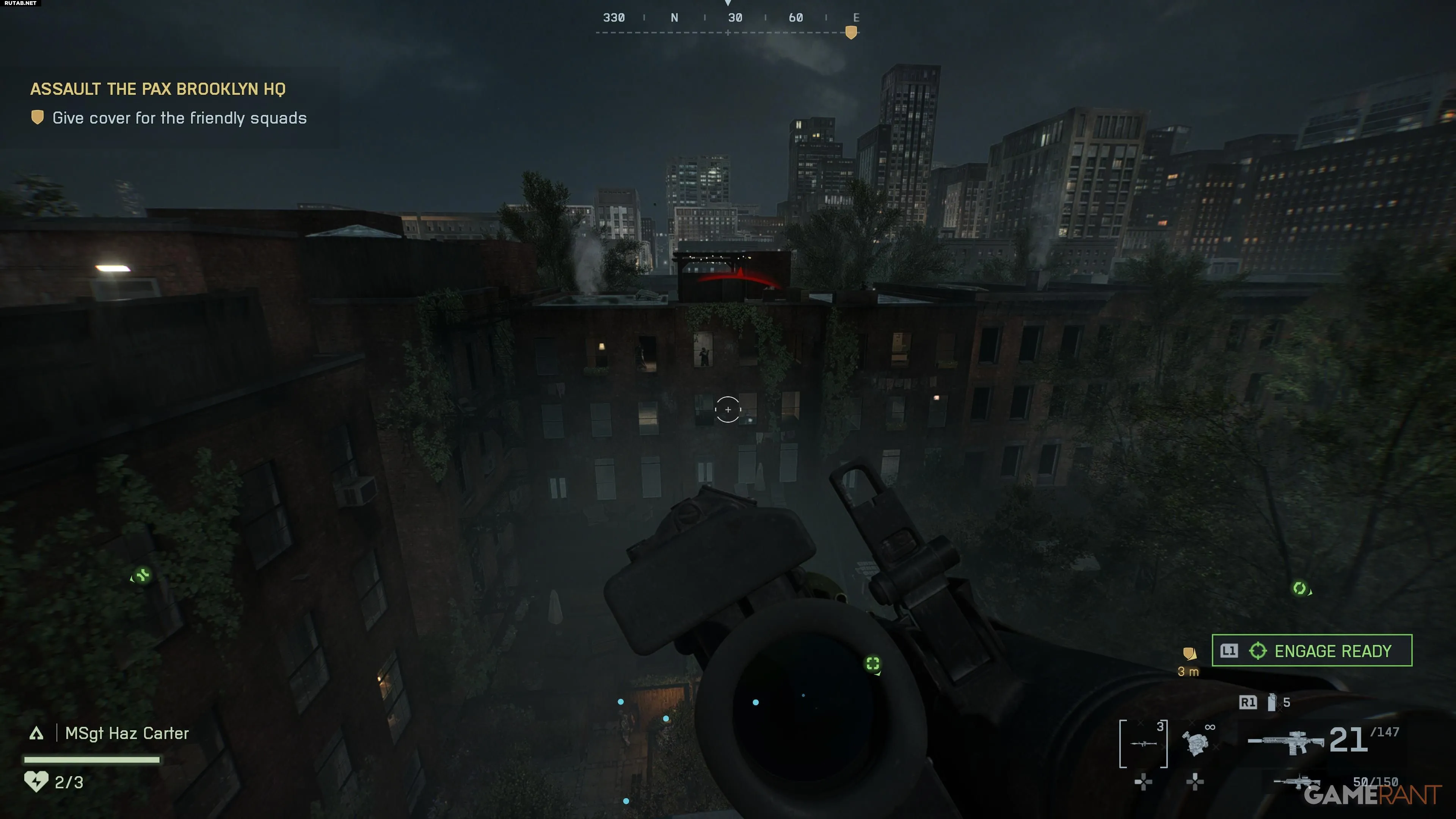 Лучший вариант — пятая миссия «Без сна», где вы играете за старшего сержанта Хэза Картера. Для удобства выберите сложность «Новичок» — ИИ противников будет менее точным и агрессивным. В начале миссии вы выйдете из вертолёта и последуете за сержантом Эйкром в комнату для брифинга.