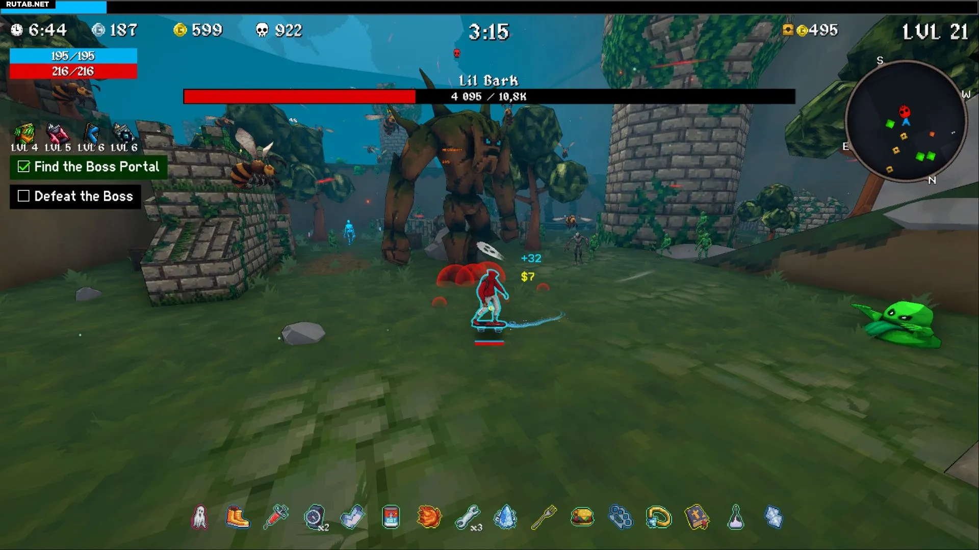 Как только у игрока появятся Шипы, он будет наносить урон при касании врагов, что активирует способность «Разряд», если она заряжена. Игроки могут увеличивать щит Тони МакЗума и бить врагов, пока щит не истощится, чтобы фармить опыт и золото. Затем следует продолжать перемещаться по карте, собирая сундуки и статуи Моаи в поисках предметов, которые увеличат урон и дополнят сборку.