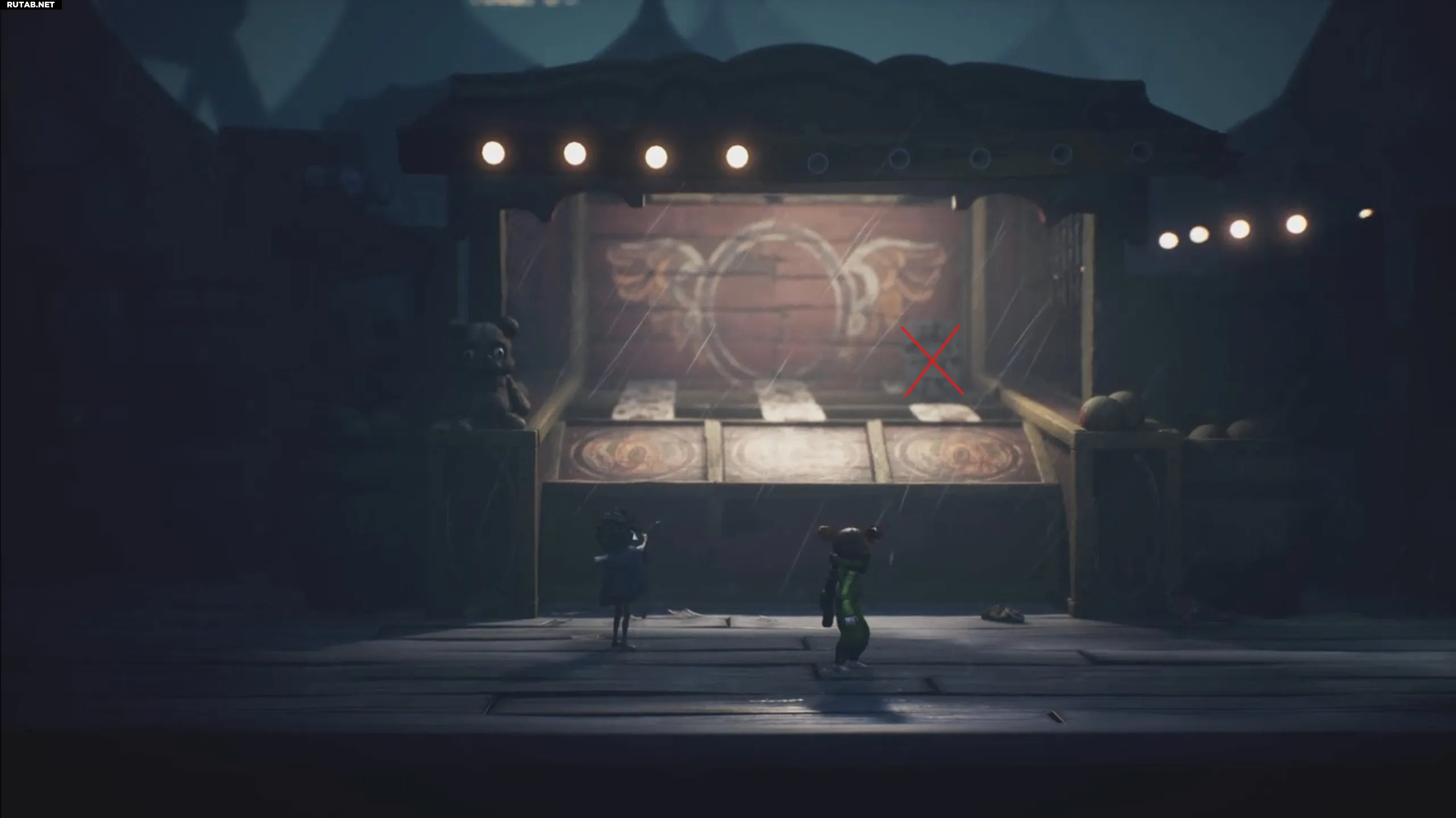 В главе «Карнавал» продвигайтесь по территории парка развлечений, пока не дойдете до ряда мини-игр. Найдите тир с деревянными мишенями. Всего их девять. Ваша цель — стрелять в панели, похожие на Номов, и избегать выстрелов, когда поднимаются панели, напоминающие детей. Счет ведут огни в верхней части киоска.