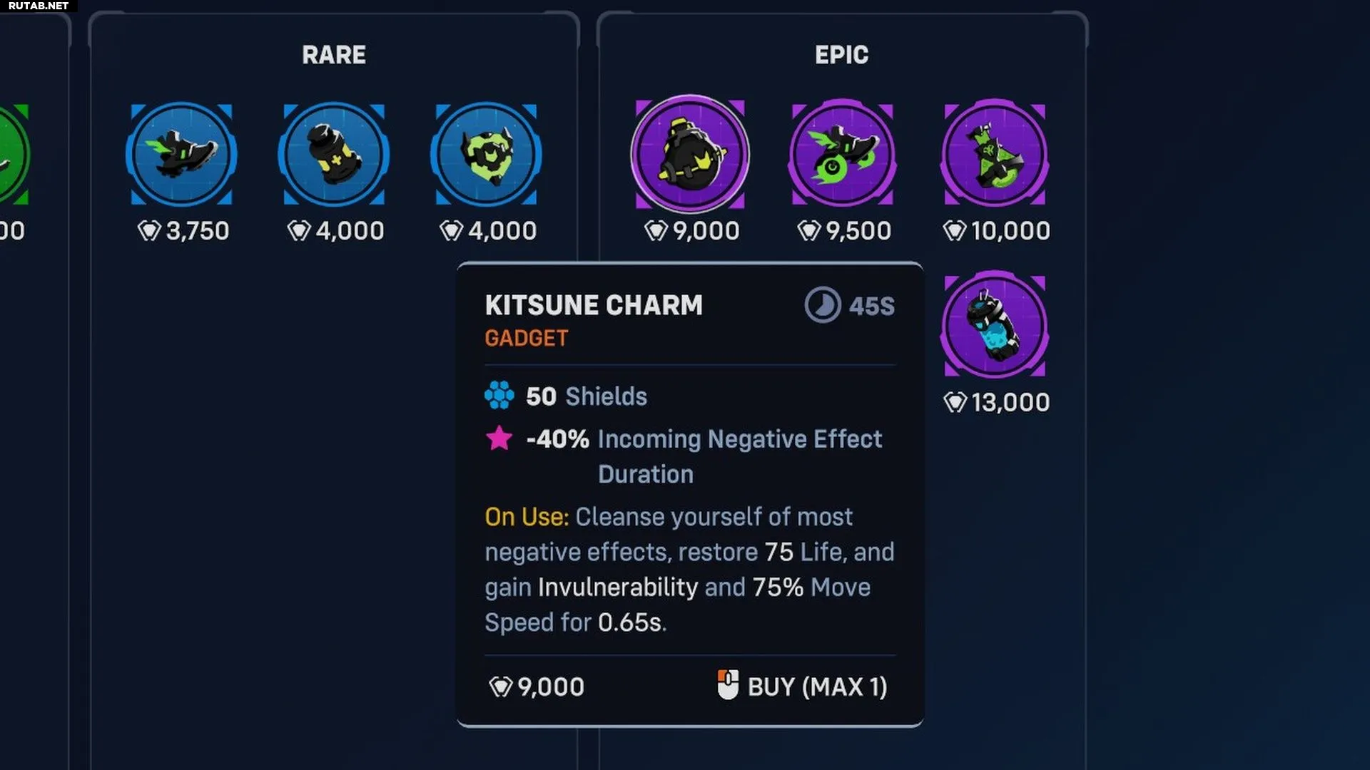 Безусловно, лучшим гаджетом в игре является Kitsune Charm — он даёт каждому герою аналог способности Кирико «Защитная судзу». Несмотря на высокую цену, он очищает от негативных эффектов, восстанавливает здоровье и даёт кратковременную неуязвимость с увеличением скорости каждые 45 секунд. Дополнительные 50 единиц щитов и снижение длительности негативных эффектов делают его невероятно мощным.