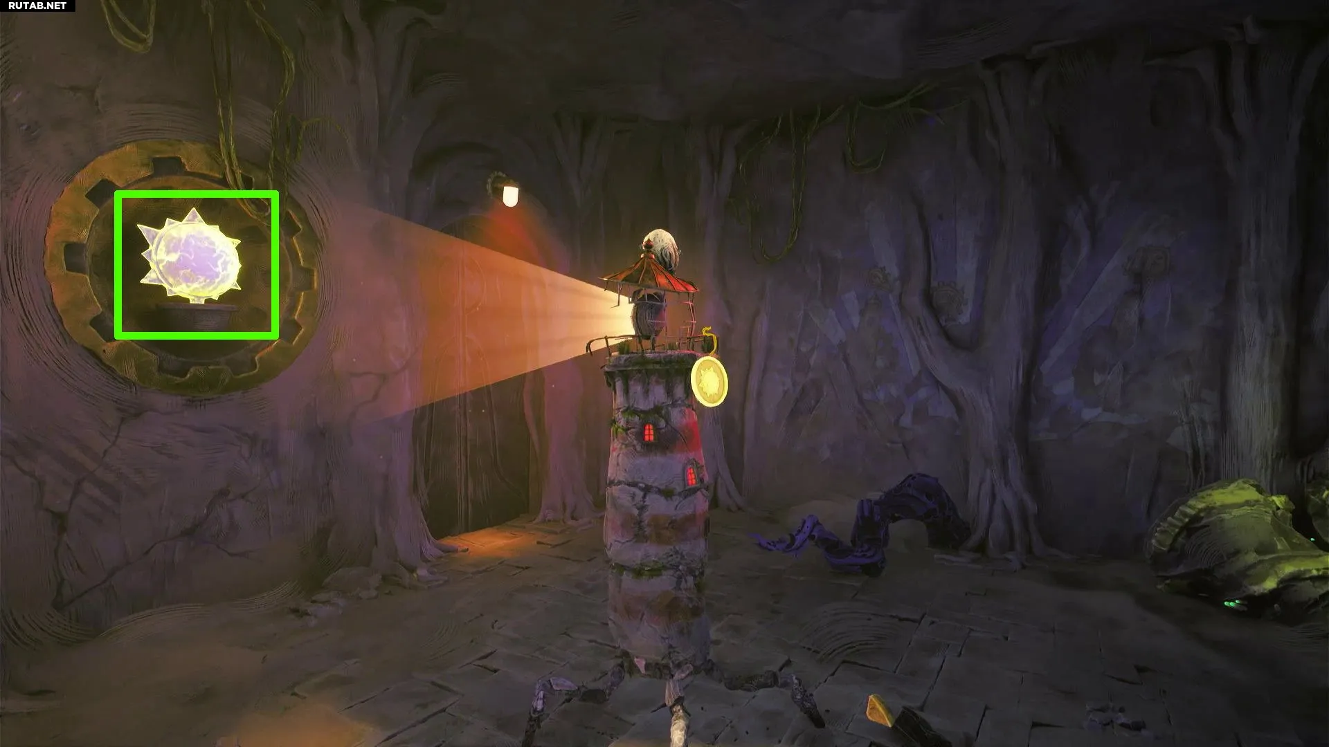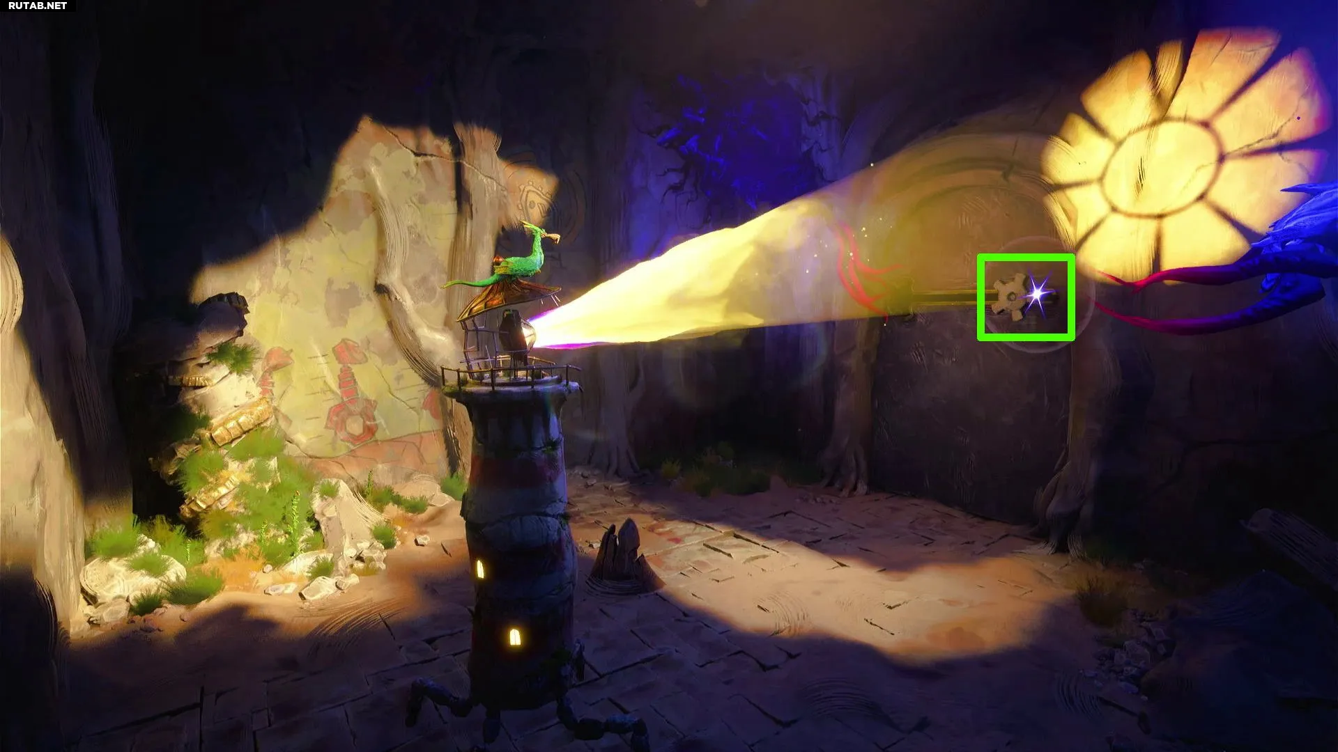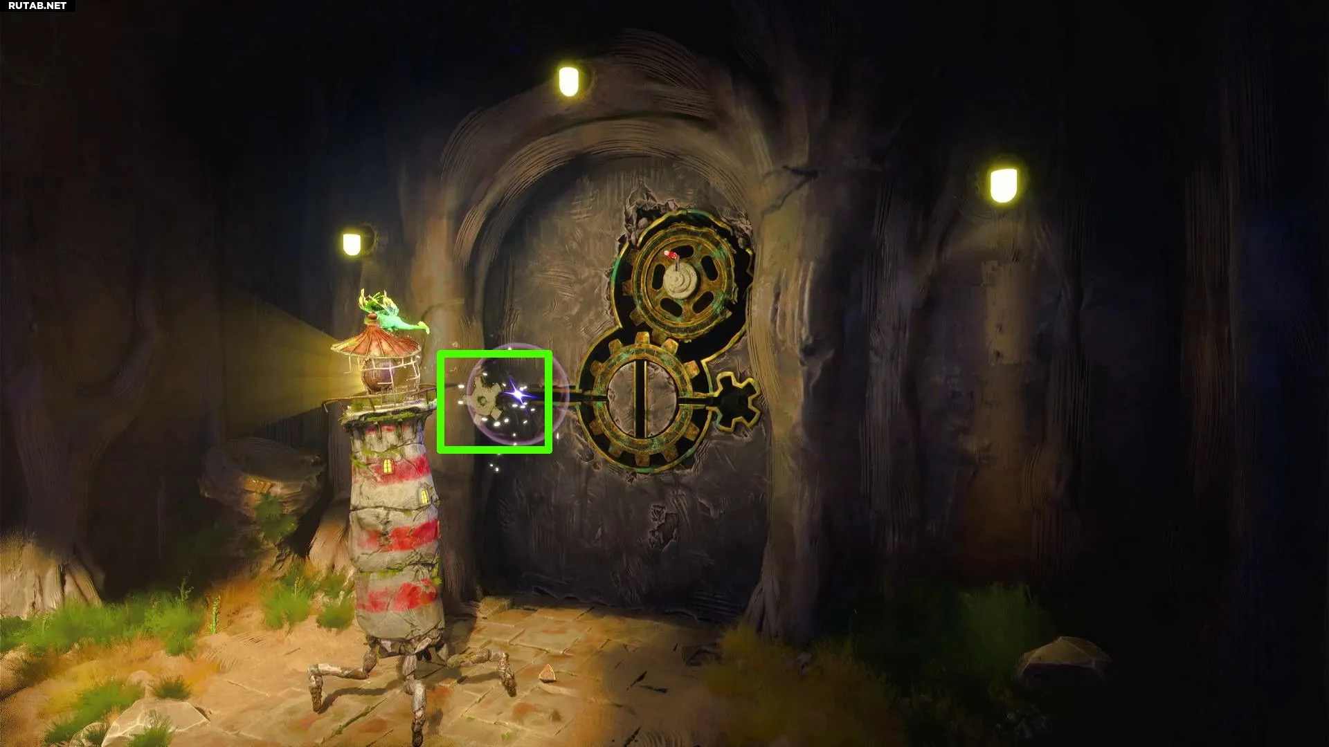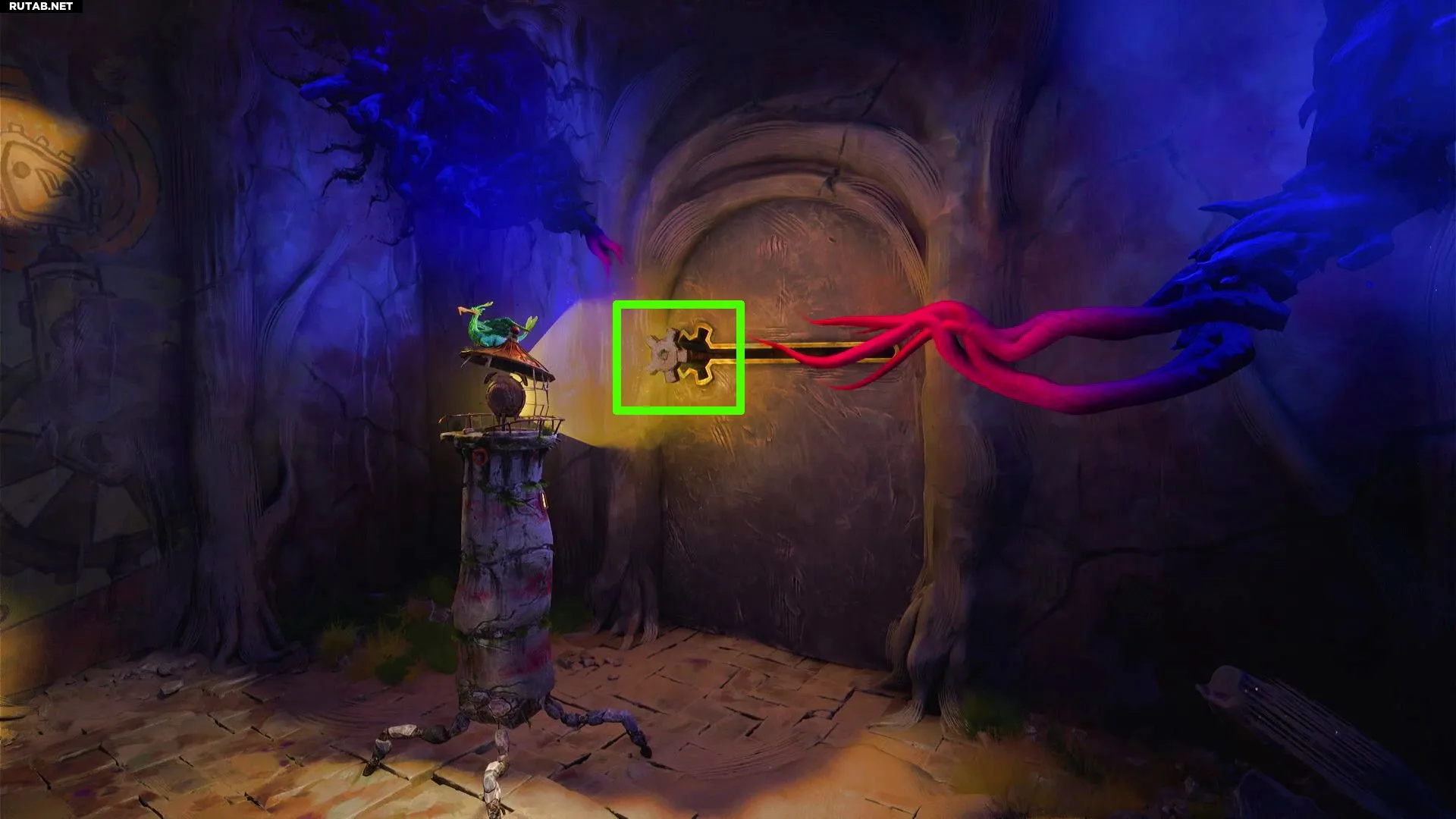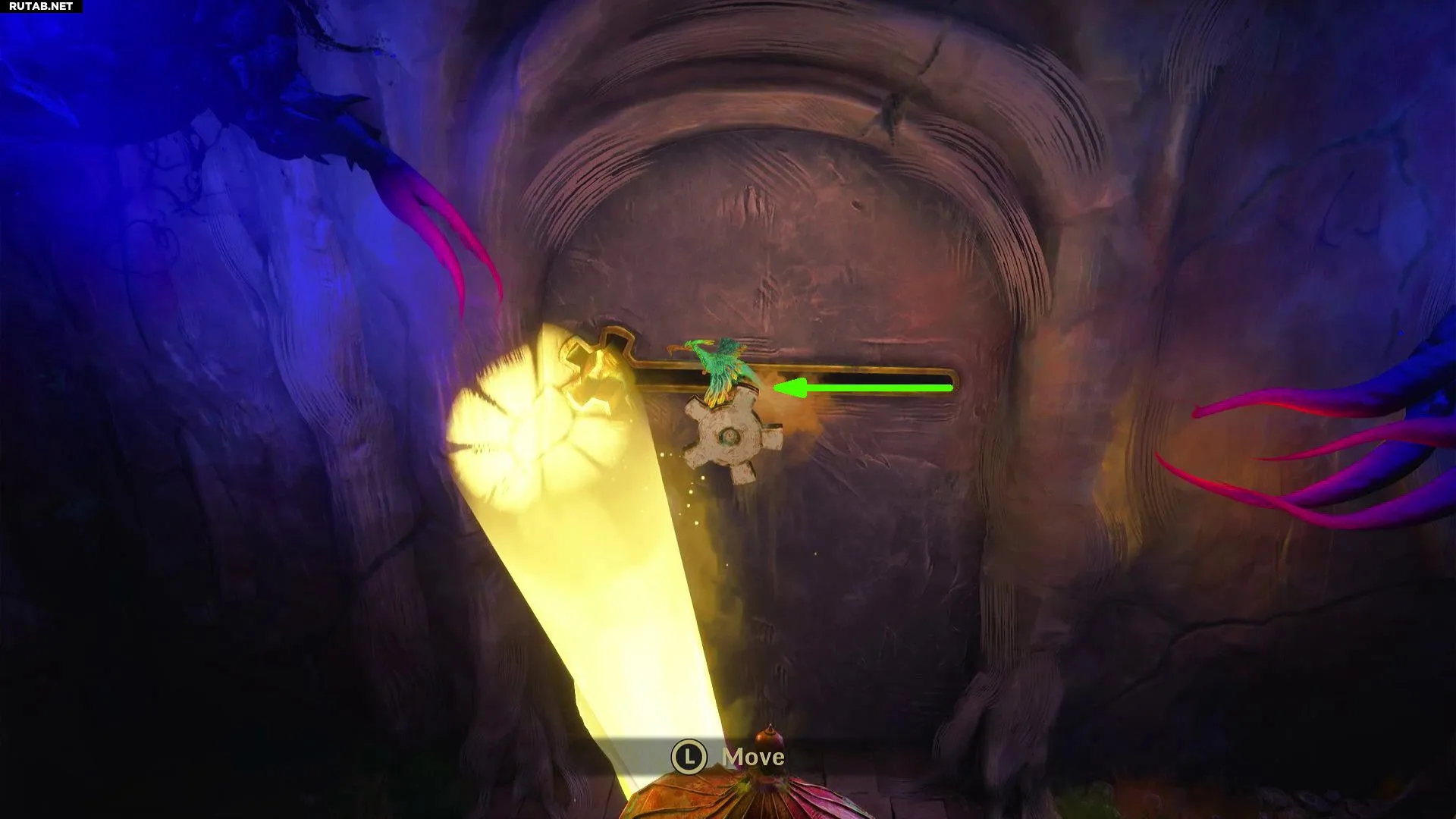 Попав внутрь, двигайтесь вперёд и войдите в комнату, дверь в которой заблокирована лианами. Направьте свет на лианы справа, чтобы они убрались, и отправьте птицу на шестерёнку, которая появится из двери. Продолжайте удерживать свет на правых лианах.