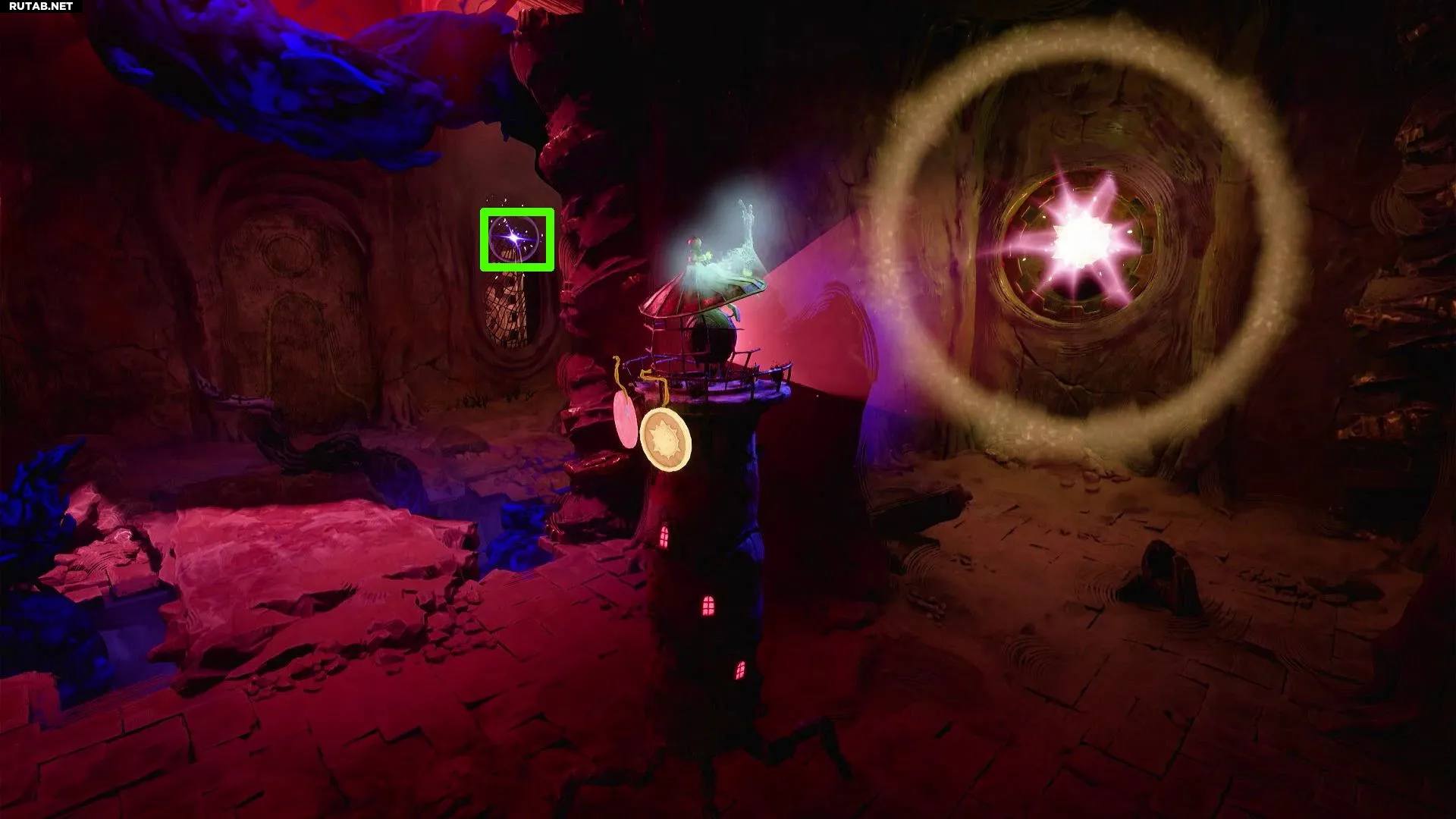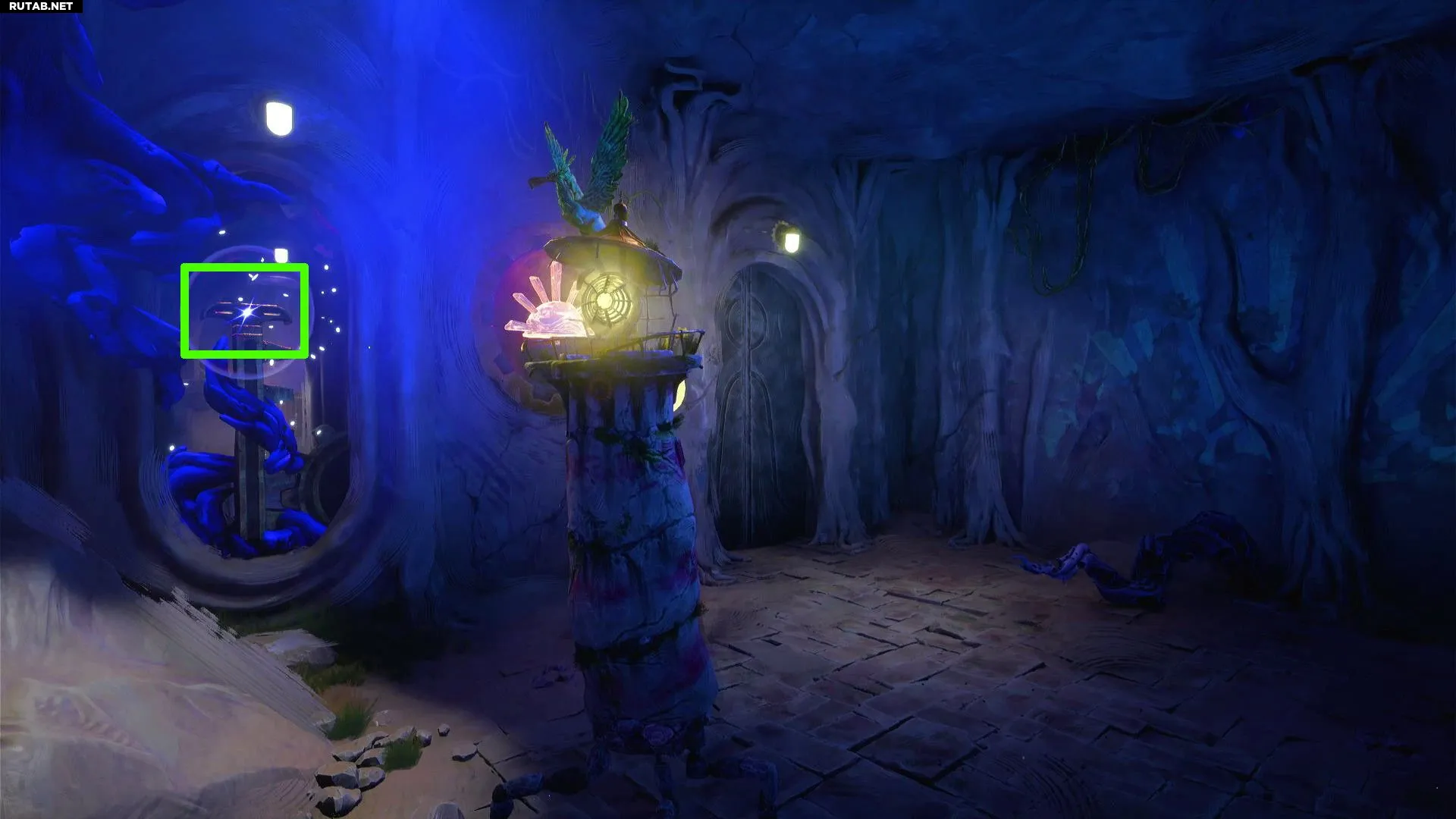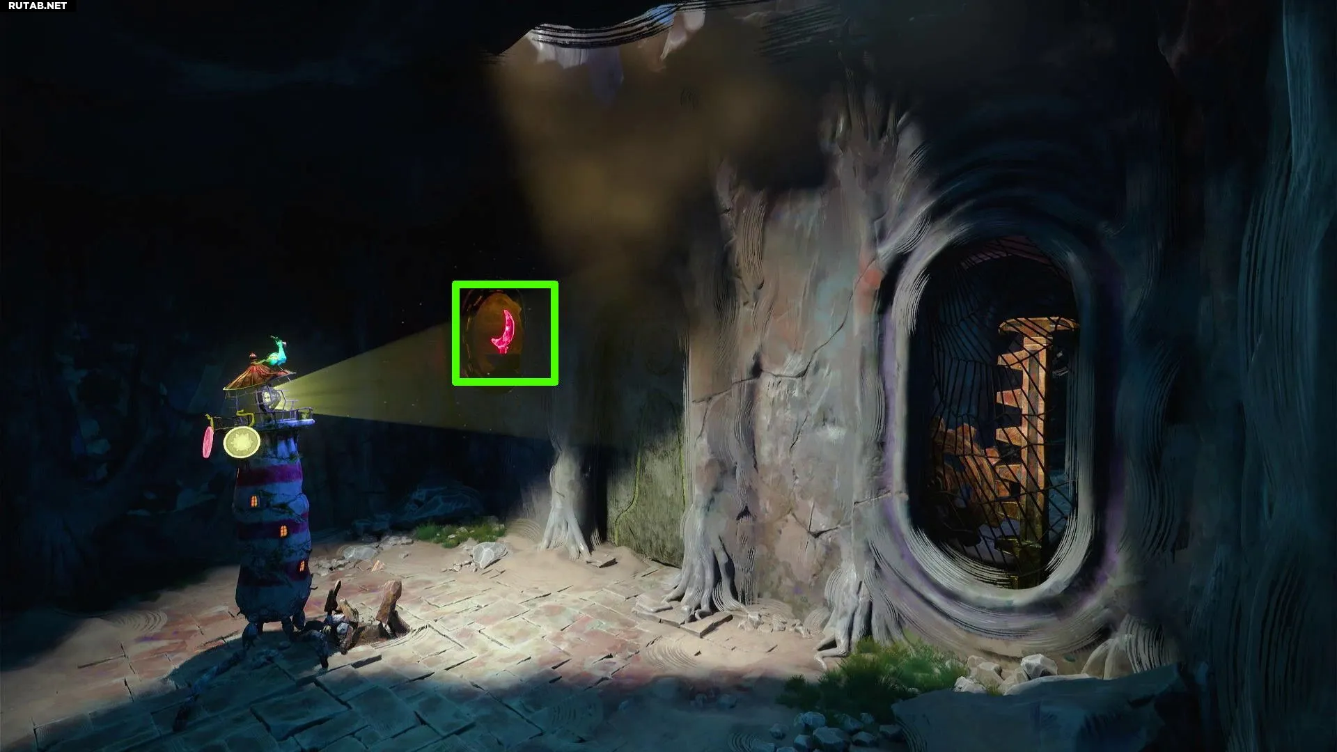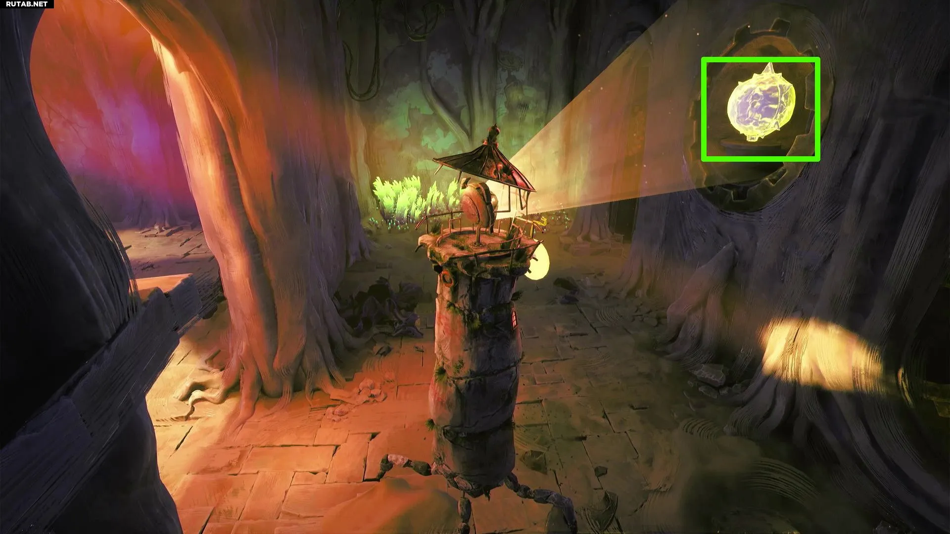 Попав внутрь, двигайтесь вперёд и войдите в комнату, дверь в которой заблокирована лианами. Направьте свет на лианы справа, чтобы они убрались, и отправьте птицу на шестерёнку, которая появится из двери. Продолжайте удерживать свет на правых лианах.