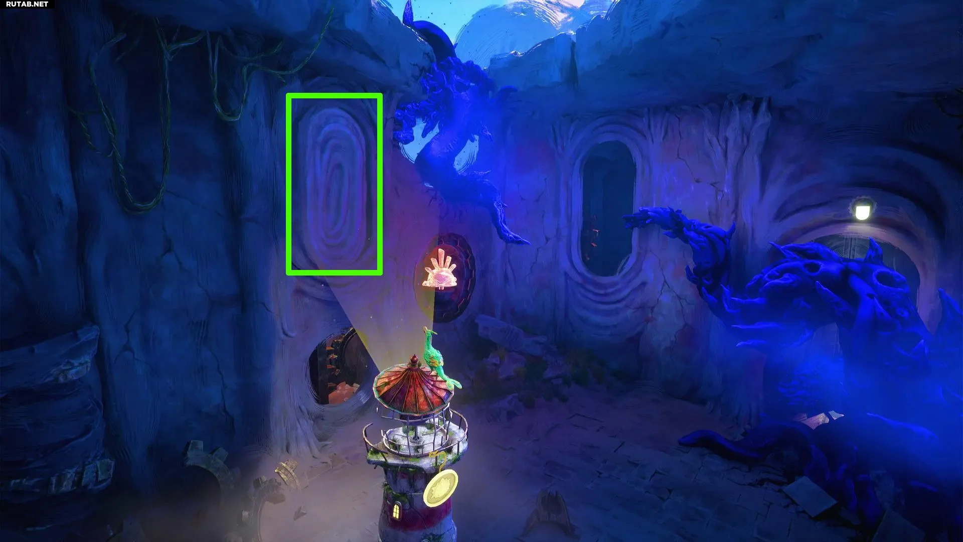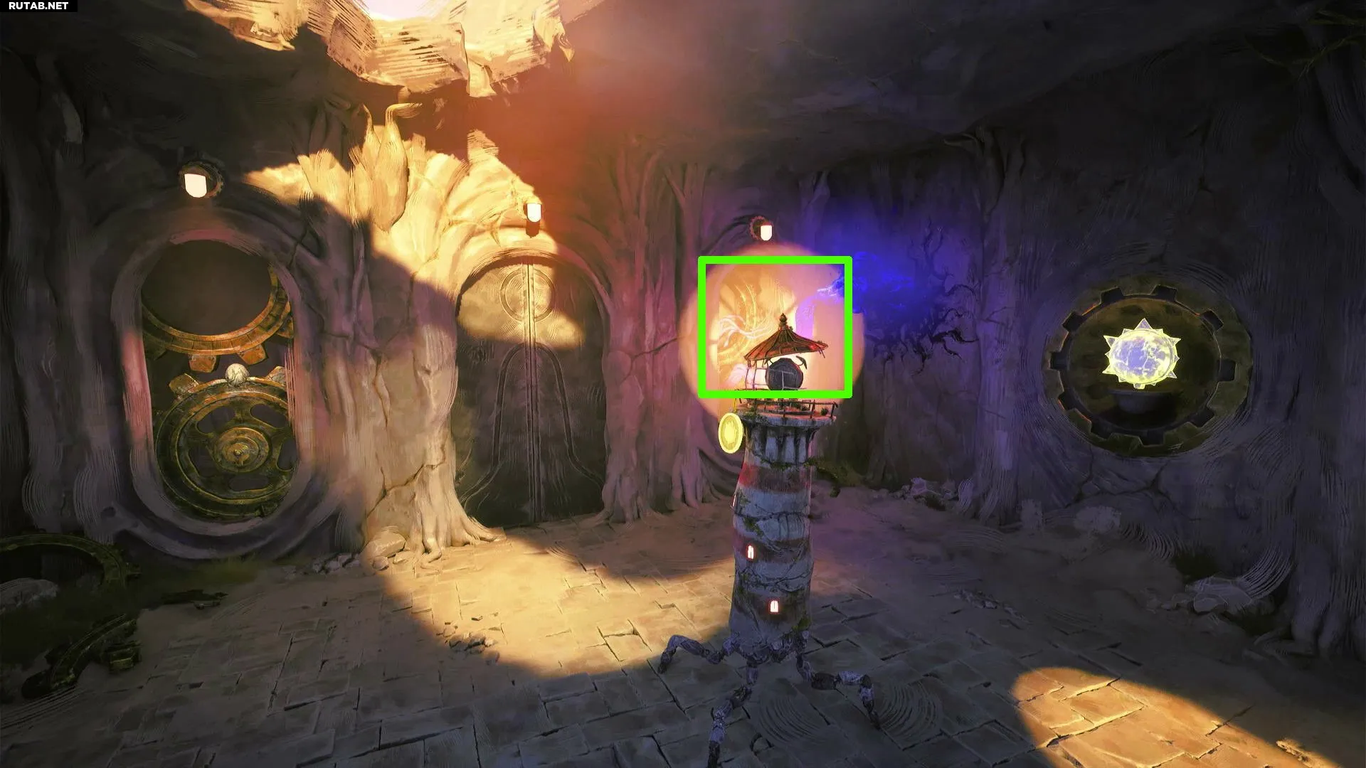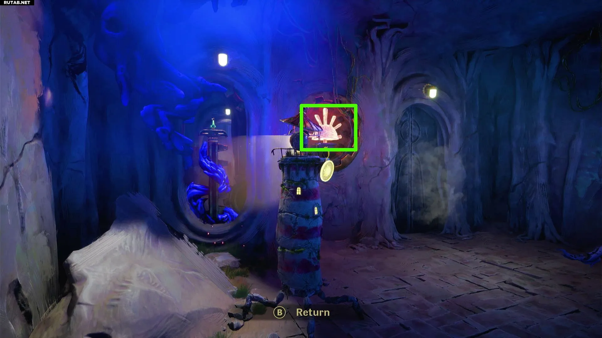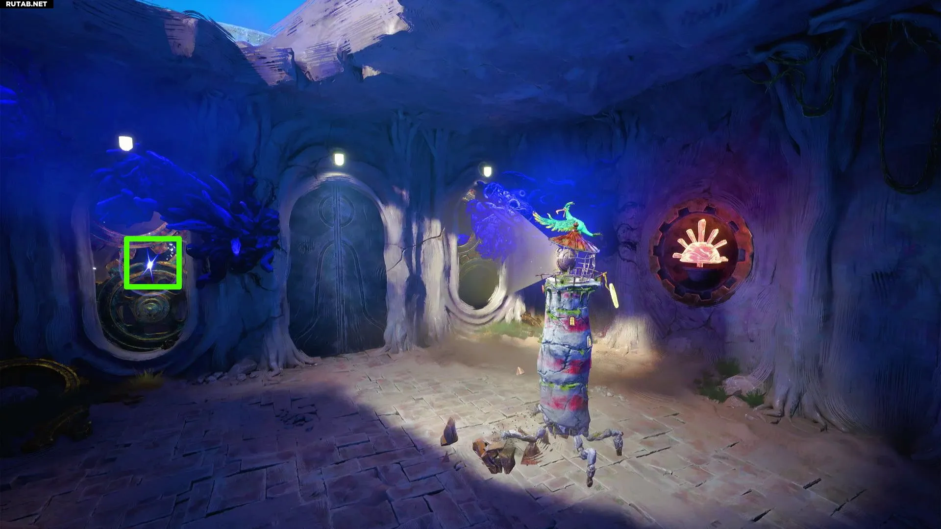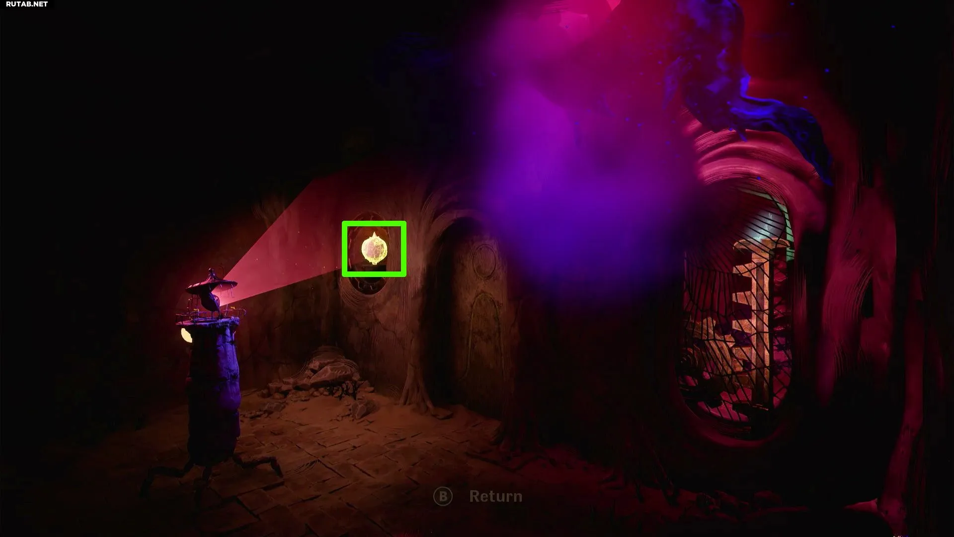 Попав внутрь, двигайтесь вперёд и войдите в комнату, дверь в которой заблокирована лианами. Направьте свет на лианы справа, чтобы они убрались, и отправьте птицу на шестерёнку, которая появится из двери. Продолжайте удерживать свет на правых лианах.