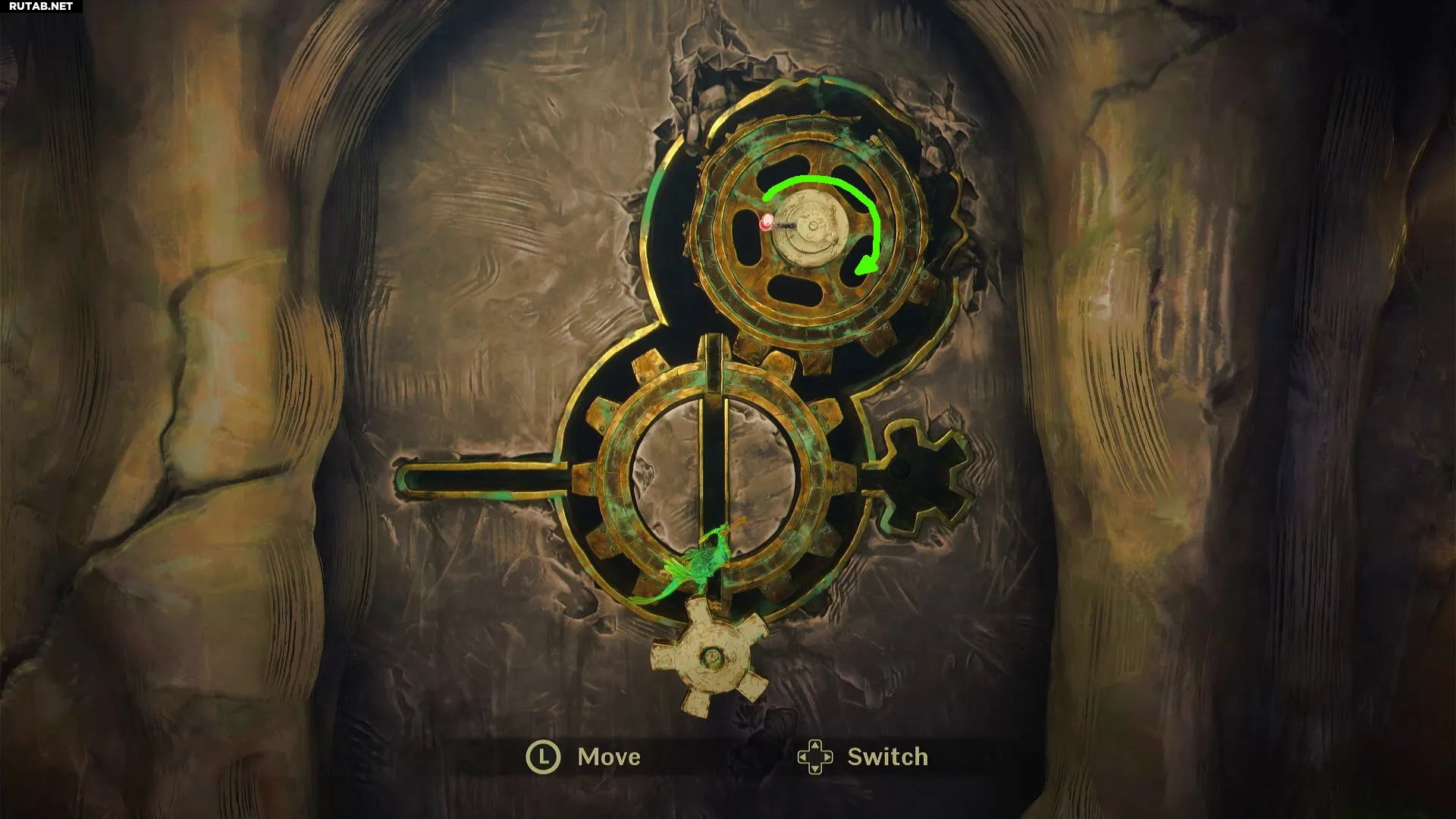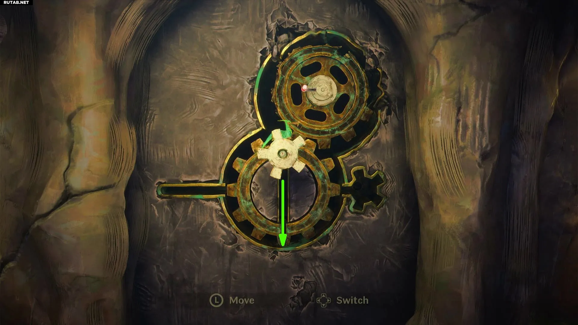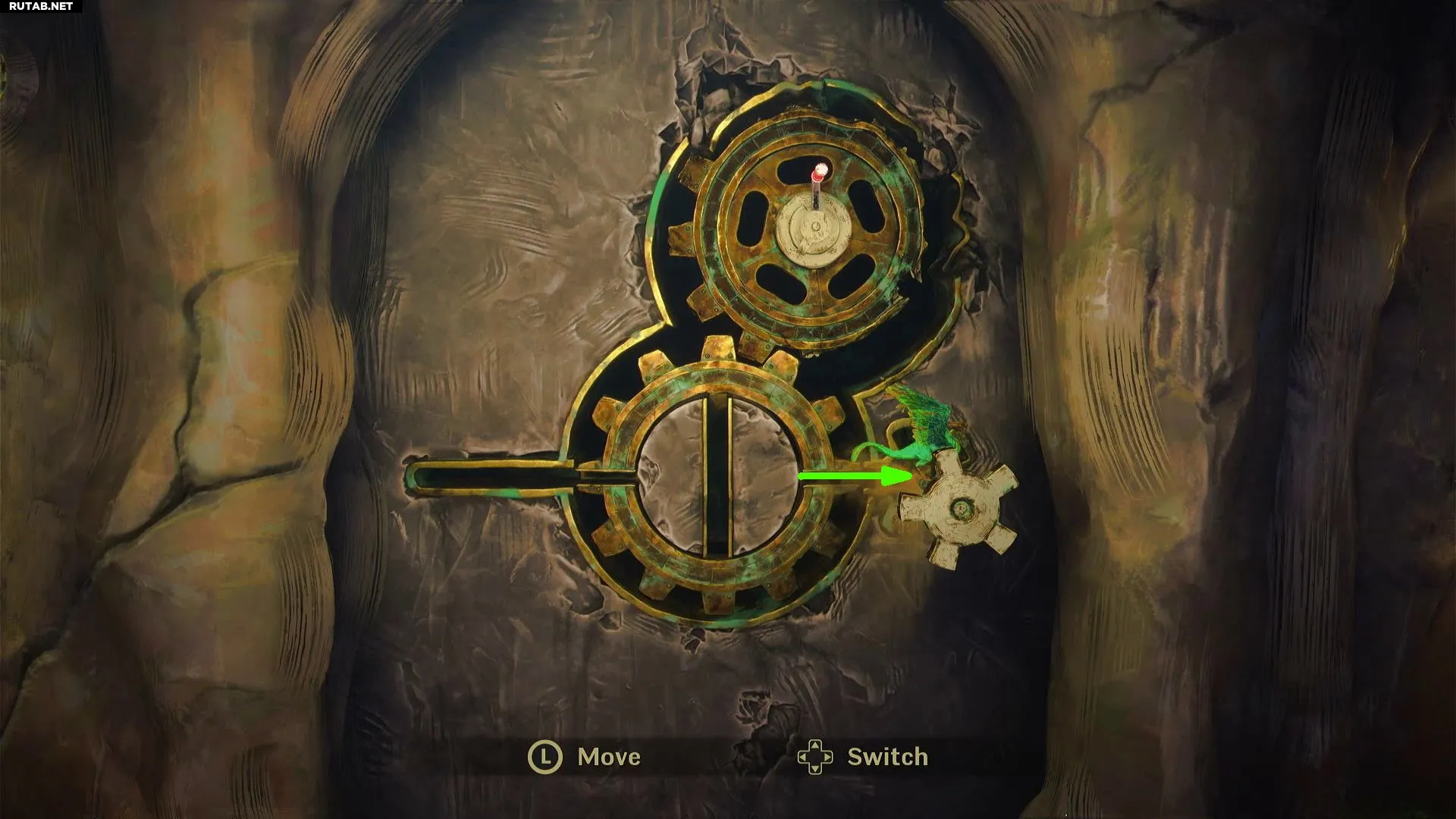 Переместите шестерёнку до упора вправо, затем переключитесь на красную рукоятку в верхней части головоломки. Поворачивайте рукоятку против часовой стрелки, пока выдвижная шестерёнка не окажется вверху. Переключитесь на выдвижную шестерёнку и переместите её до упора вниз. Снова переключитесь на красную рукоятку и поворачивайте её по часовой стрелке, пока выдвижная шестерёнка не окажется справа. В последний раз переключитесь на выдвижную шестерёнку и переместите её вправо в отверстие, которое открывает дверь.