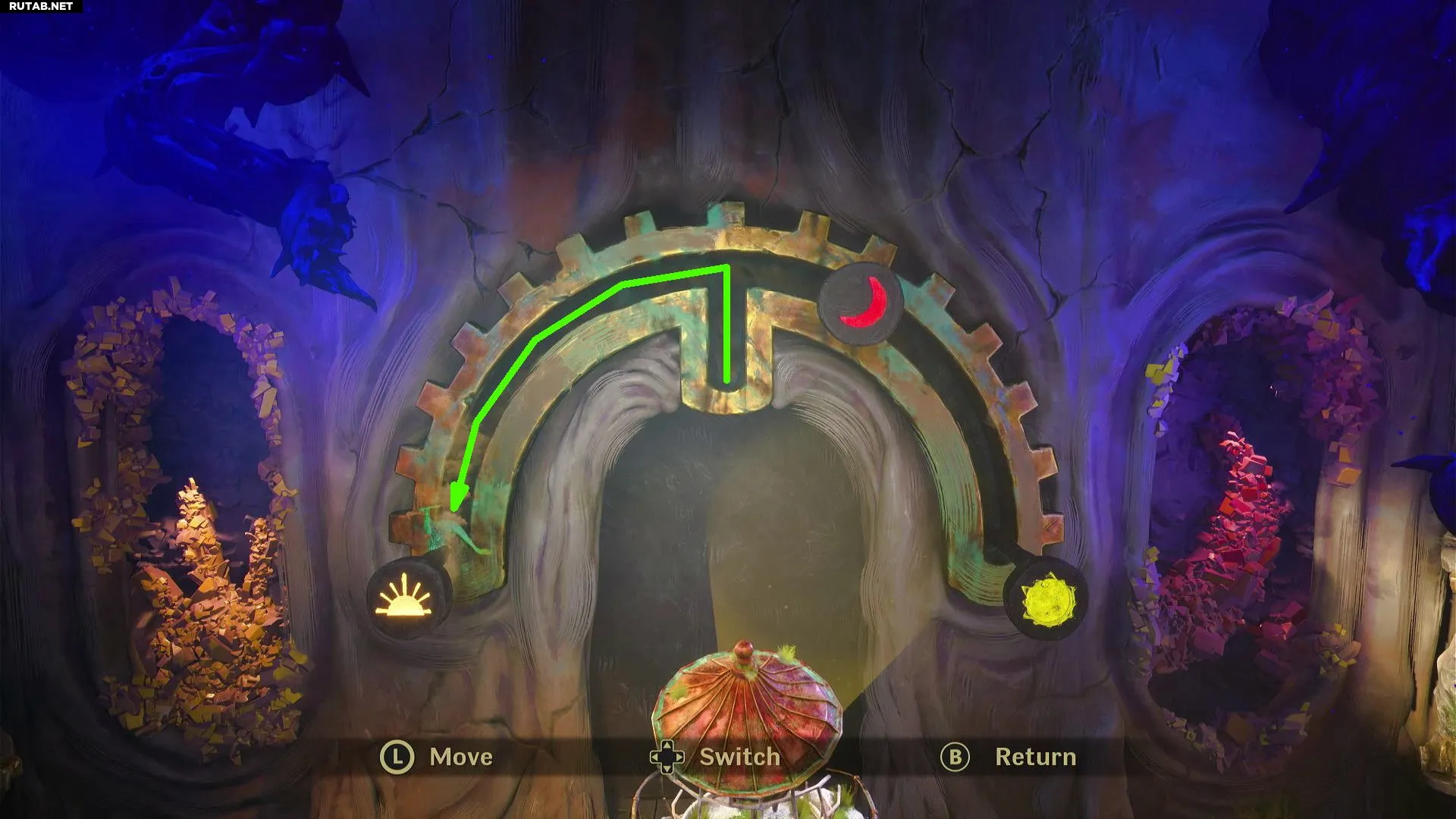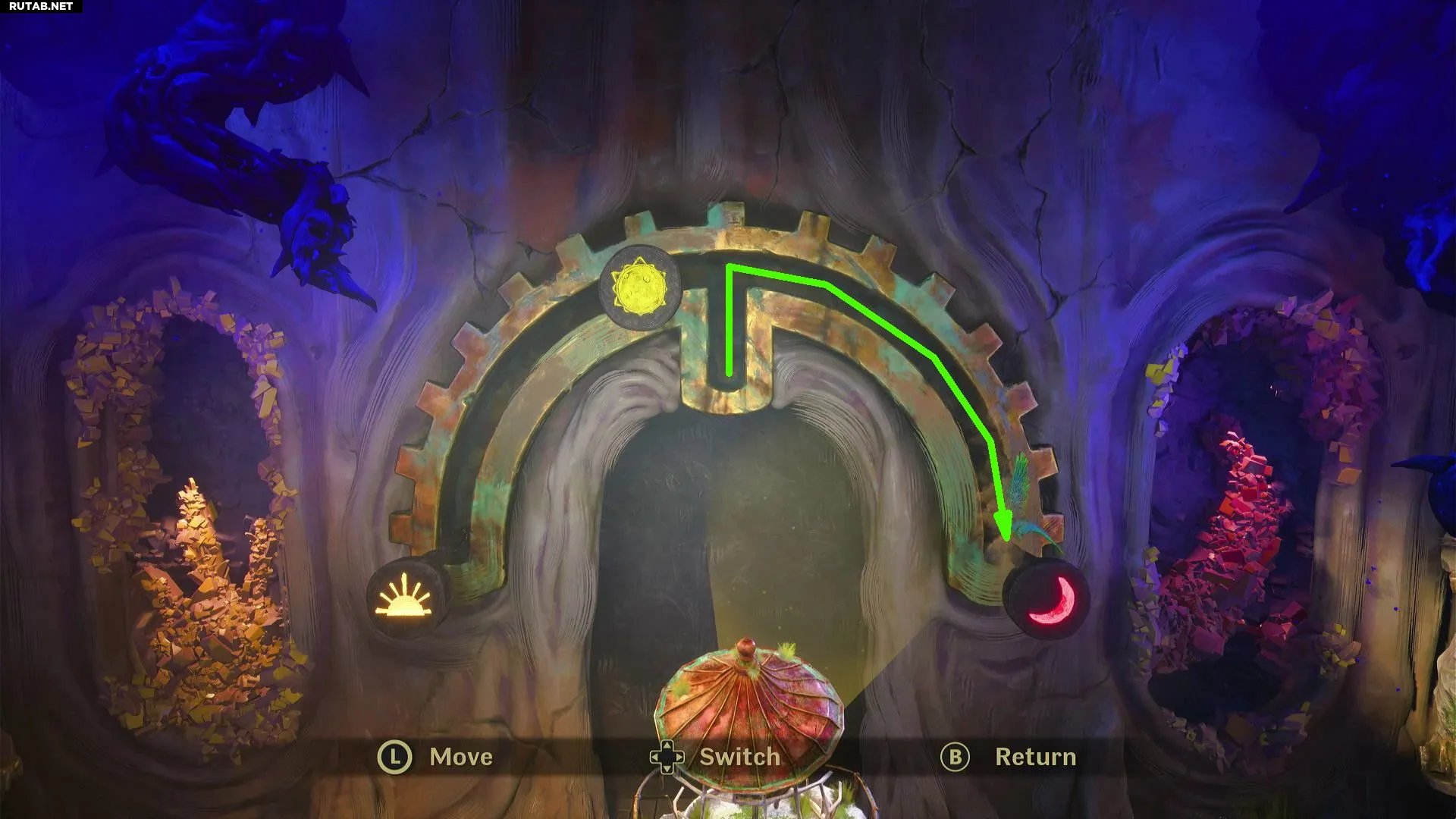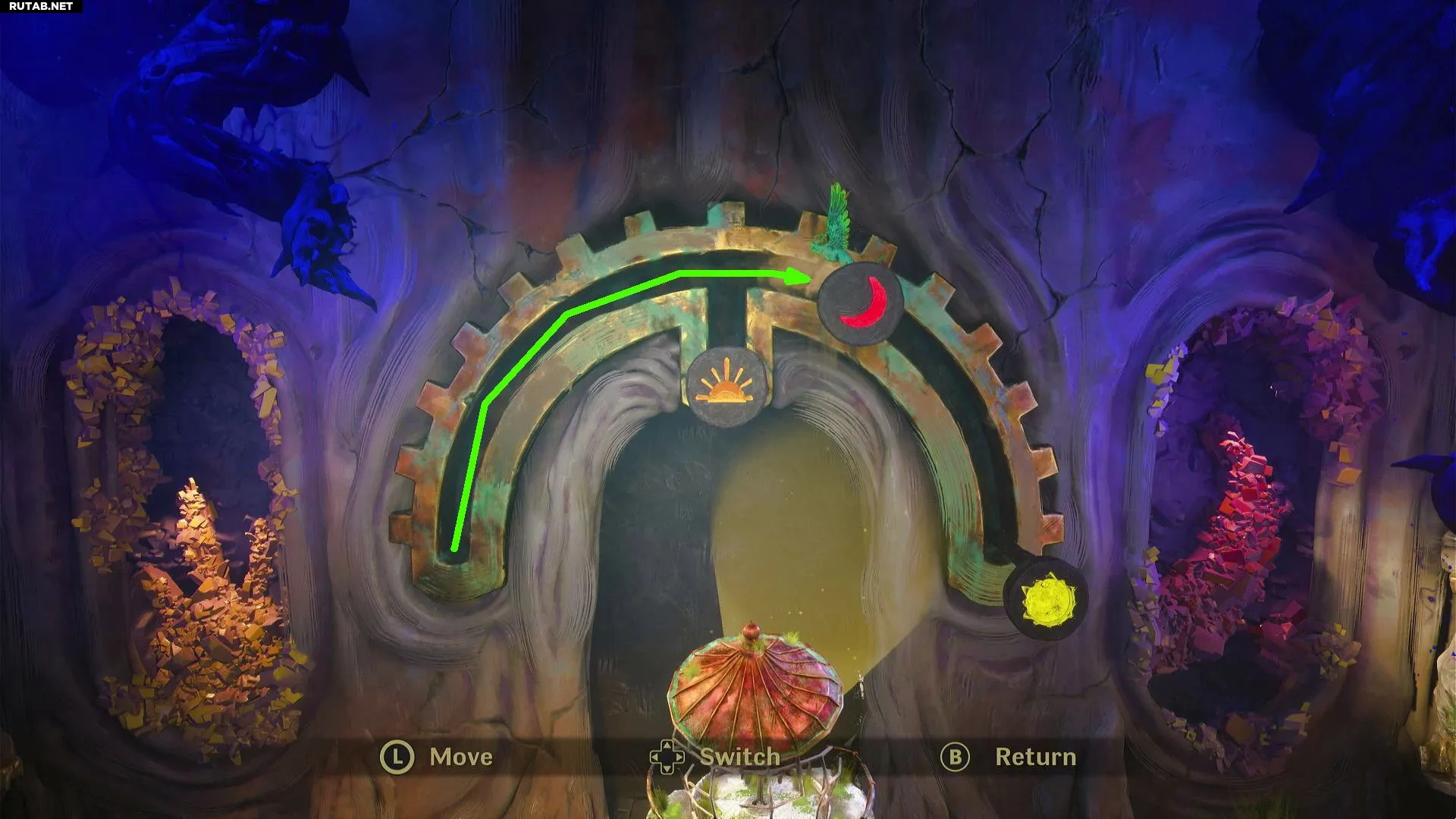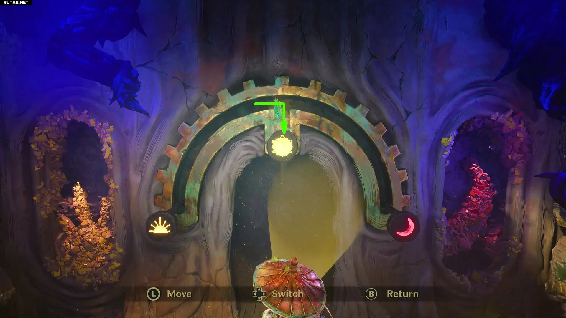 Пройдите через ворота и направьте свет на луну в конце пути. Теперь отправьте свою призрачную птицу к рукоятке по другую сторону ворот, направьте свет на полное солнце и поверните рукоятку, чтобы открыть ворота. Храм Луны находится прямо за ними — направьте свет на его фасад, чтобы расчистить вход.