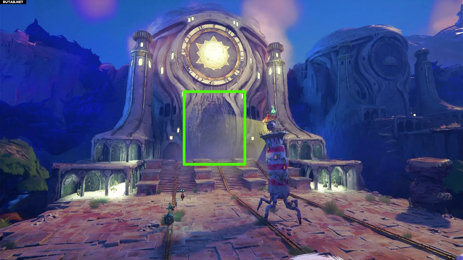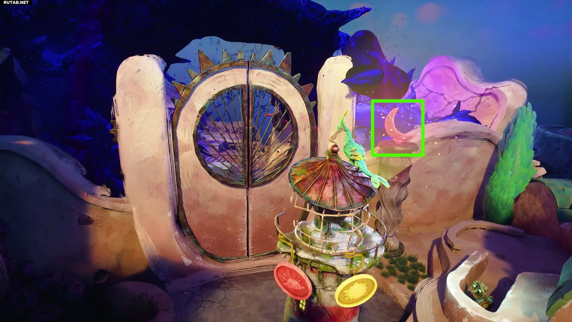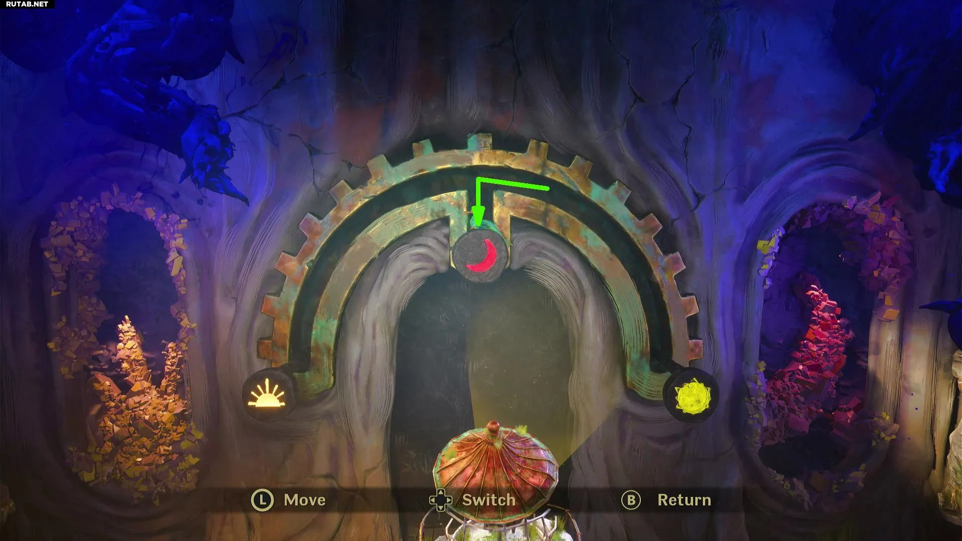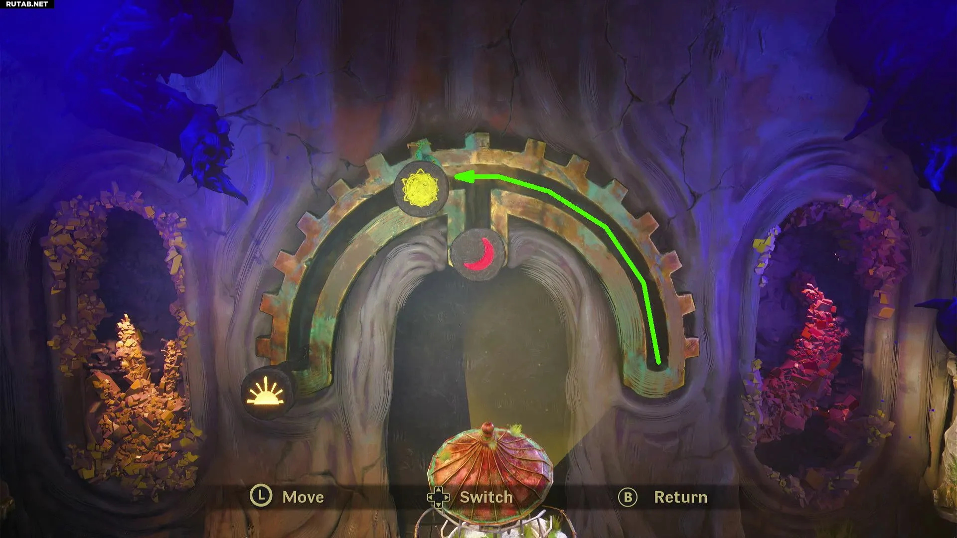 Пройдите через ворота и направьте свет на луну в конце пути. Теперь отправьте свою призрачную птицу к рукоятке по другую сторону ворот, направьте свет на полное солнце и поверните рукоятку, чтобы открыть ворота. Храм Луны находится прямо за ними — направьте свет на его фасад, чтобы расчистить вход.