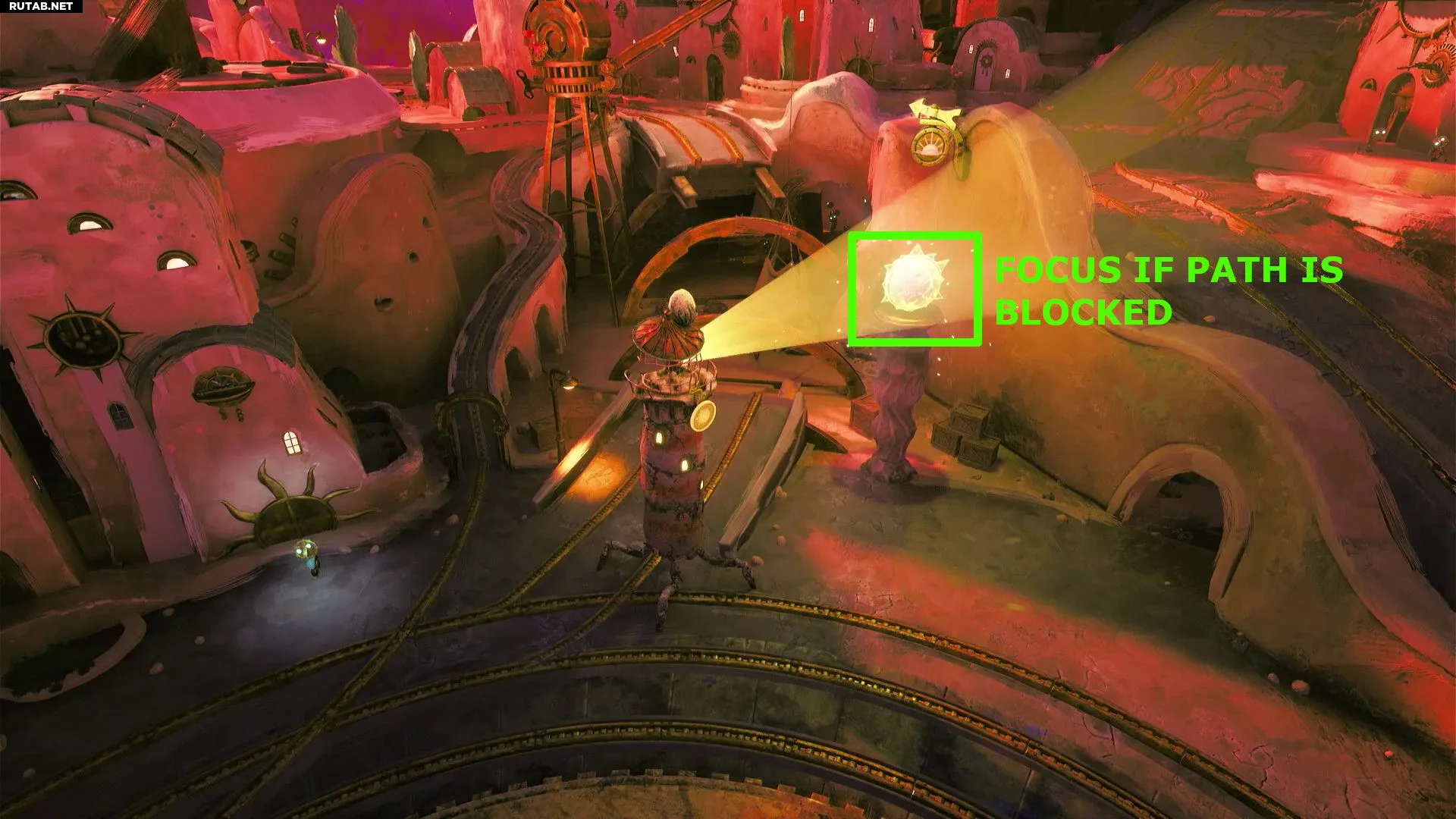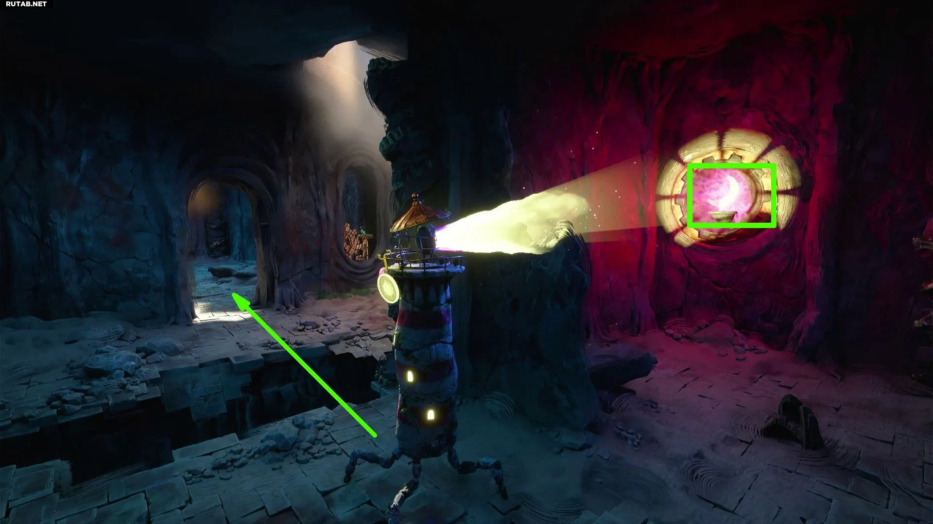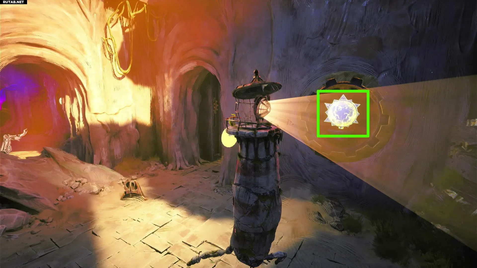 Вернитесь к роботу и направьте свет на полное солнце позади него. Затем пройдите справа от робота, отправьте птицу к рукоятке на здании и поверните её, чтобы открыть ворота.