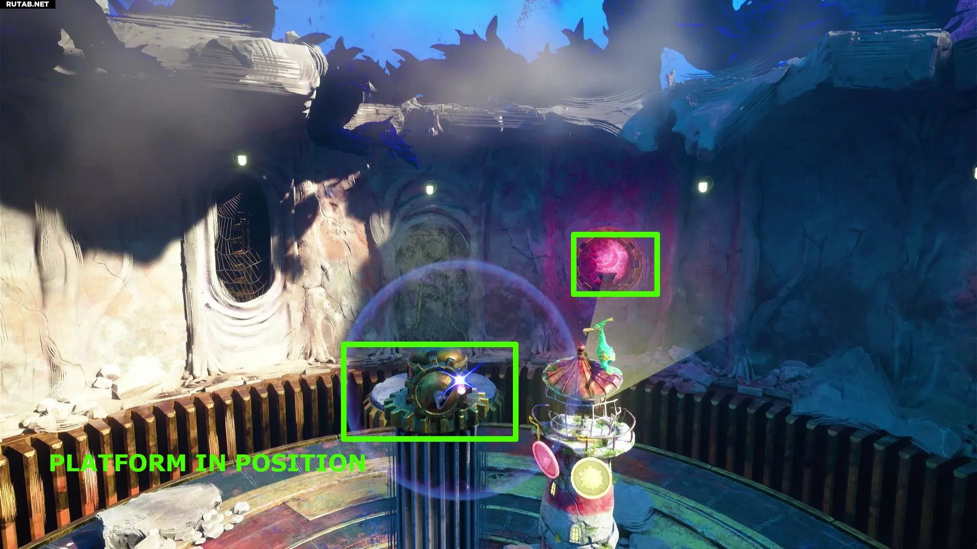 - Отправьте птицу к рукоятке и поверните её так, чтобы маленькая платформа оказалась в верхней части комнаты.