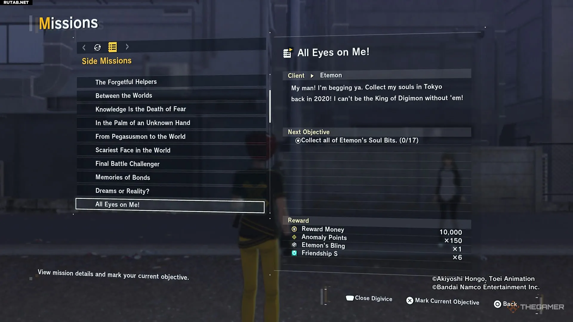 Хотя большинство квестов довольно просты, некоторые, например, задание «Все взгляды на меня», могут заставить потратить на поиски несколько часов. В нём нужно найти все Частицы Души Этемонов, за что игрок получит трофей или достижение. Ниже показано, где найти каждого Этемона в Синдзюку.