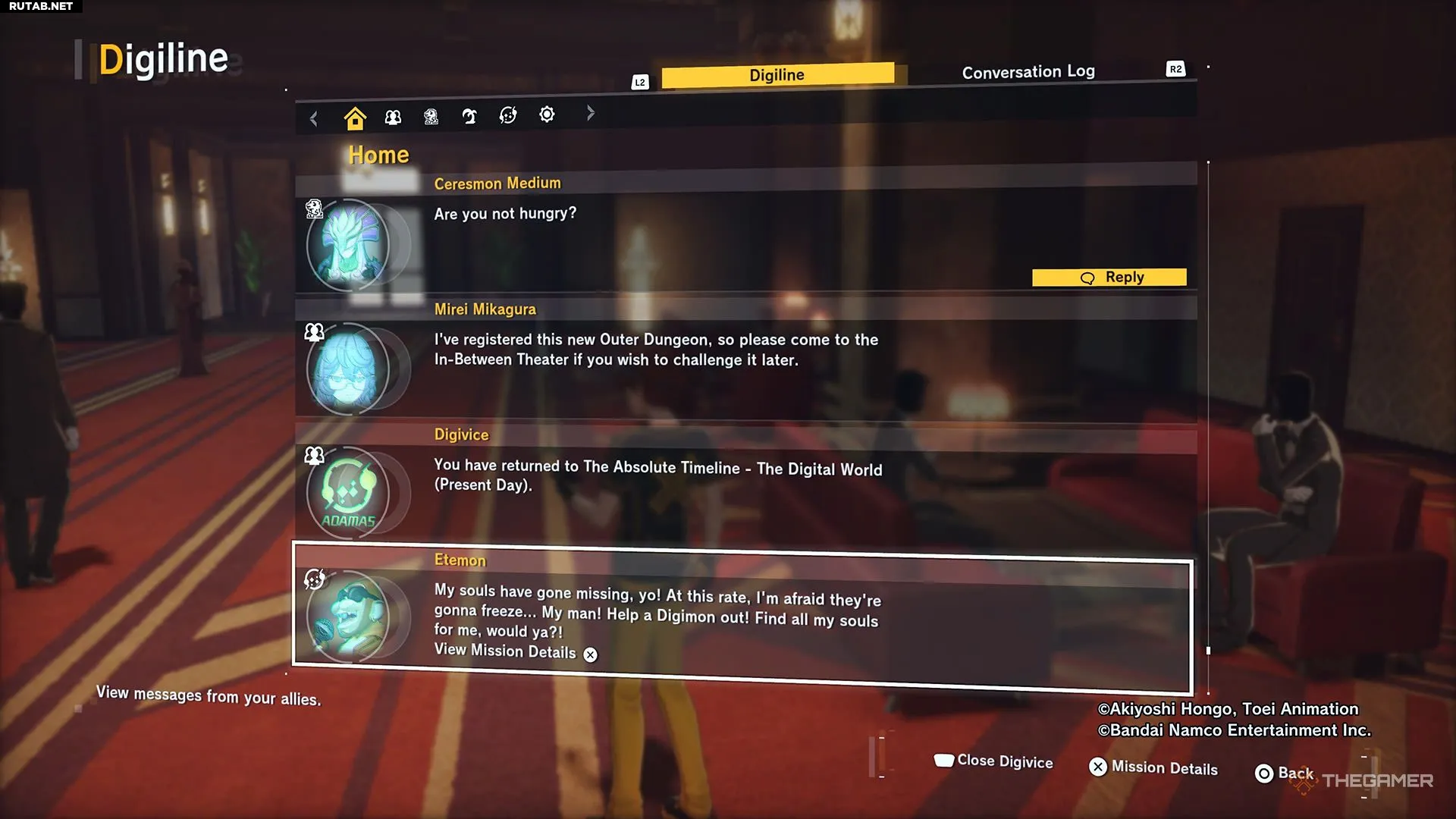 Чтобы начать этот квест, сначала нужно выполнить задание «Подарок от хозяев», которое открывается непосредственно перед финальной битвой. После этого вернитесь во времени в Синдзюку 8-летней давности, и Этемон напишет вам в Дигилайн, попросив найти его потерянные Частицы Души.