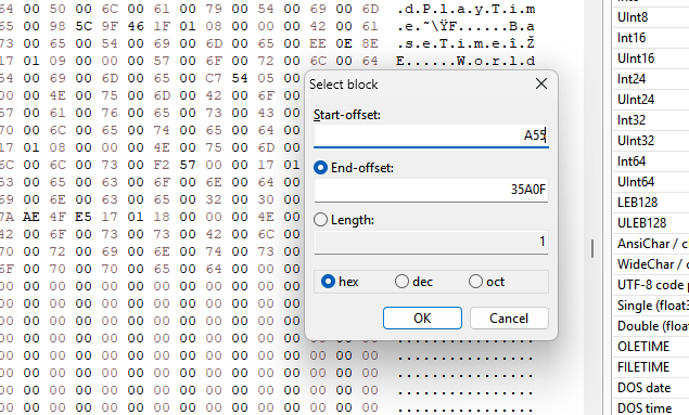 Выделите блок данных от начала до конца, используя запомненное ранее значение смещения как начальную точку.