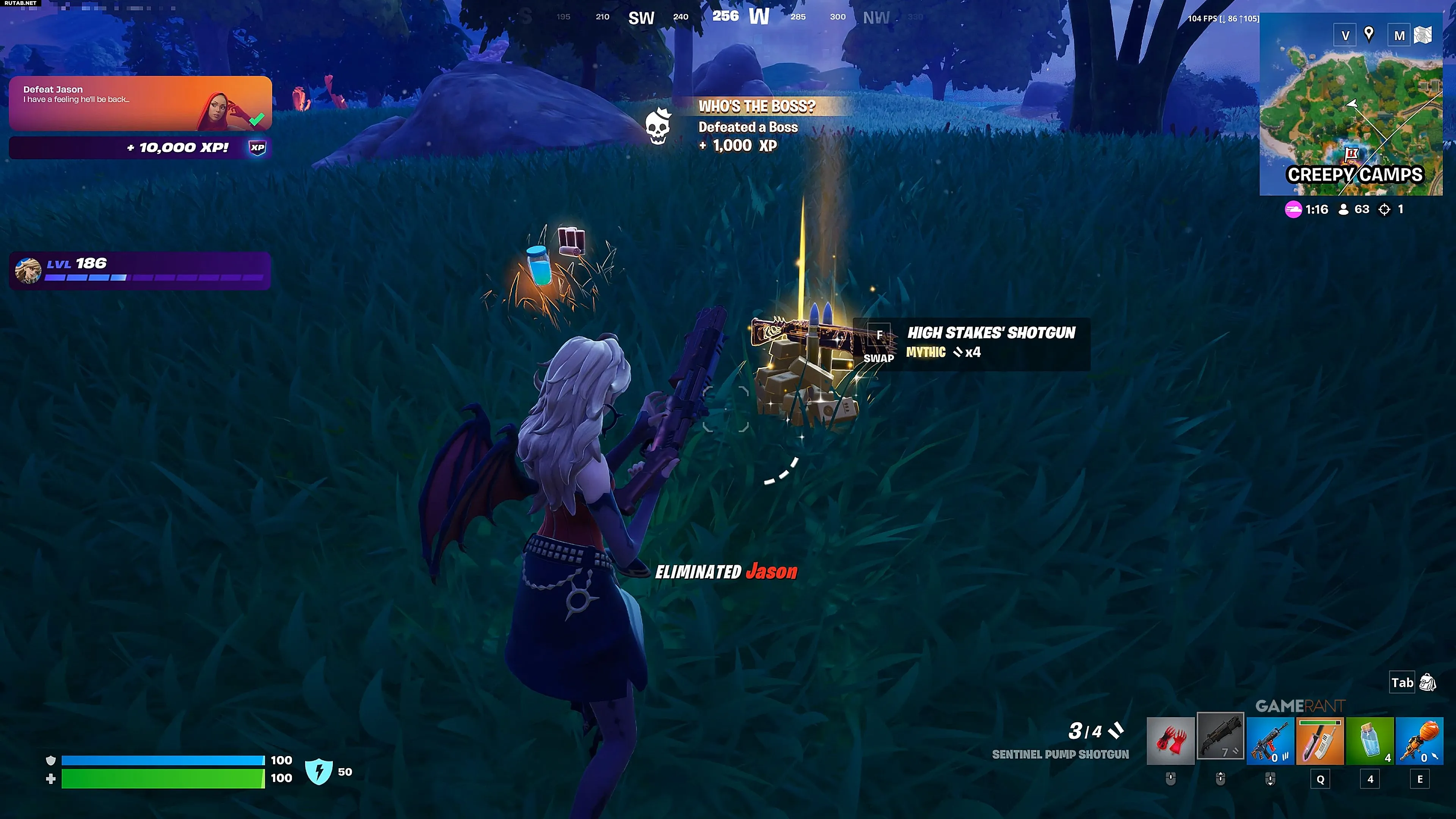 Задание «Найти и победить Джейсона» является частью цепочки квестов Fortnitemares и награждает игроков 10 000 опыта. Хотя при просмотре квеста местоположение Джейсона не отмечено на карте, его всегда можно найти в Жутком кемпинге прямо в начале матча — старайтесь приземлиться туда как можно скорее.