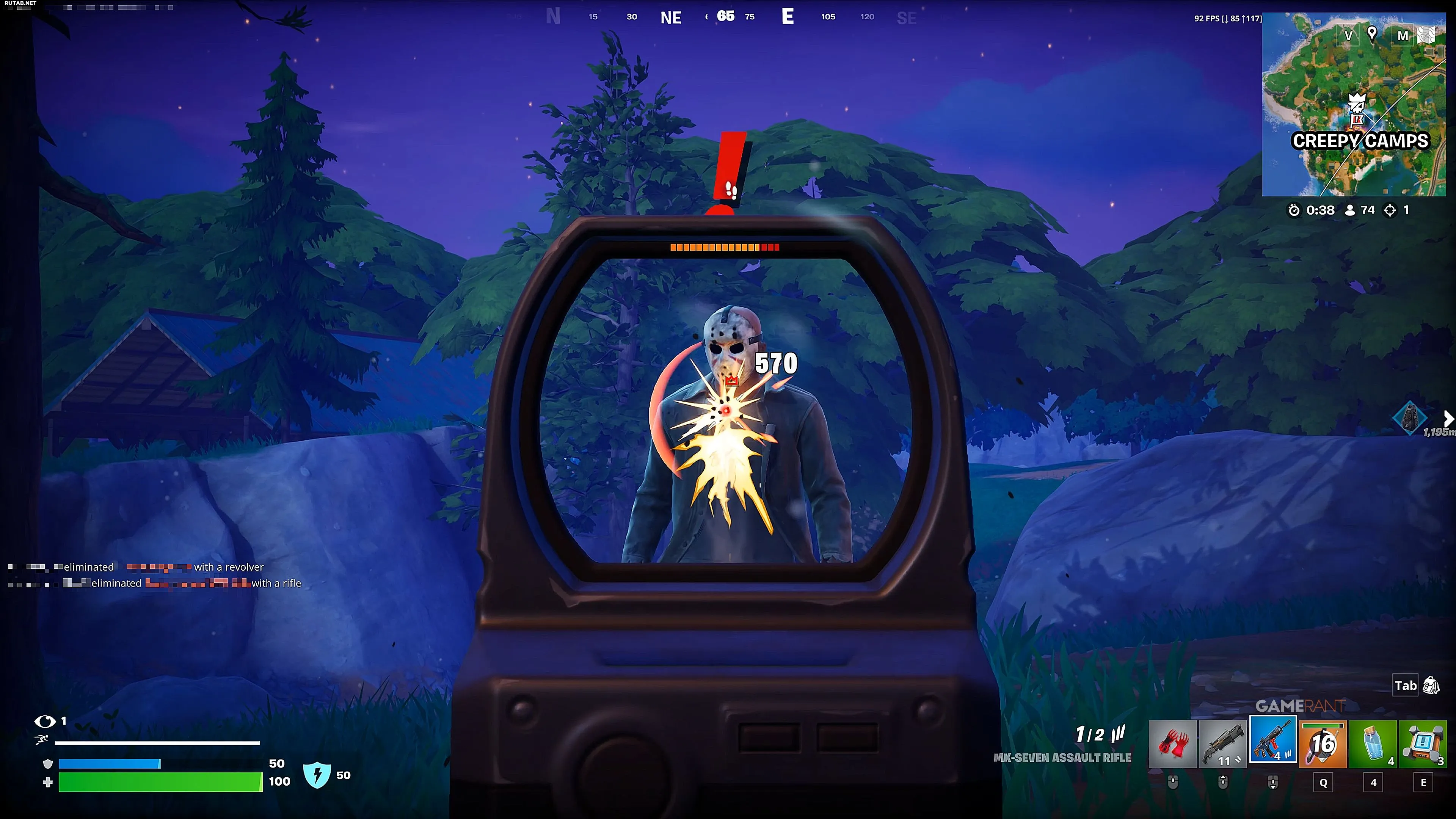 Как только вы окажетесь в Жутком кемпинге, местоположение Джейсона будет отмечено на карте значком черепа, что позволит отслеживать его в любой момент. Джейсон — один из самых простых боссов в Fortnitemares: он медленно передвигается и атакует только в ближнем бою. Однако у него много здоровья, и он может телепортироваться в другое место, хотя всегда остаётся недалеко от Жуткого кемпинга.