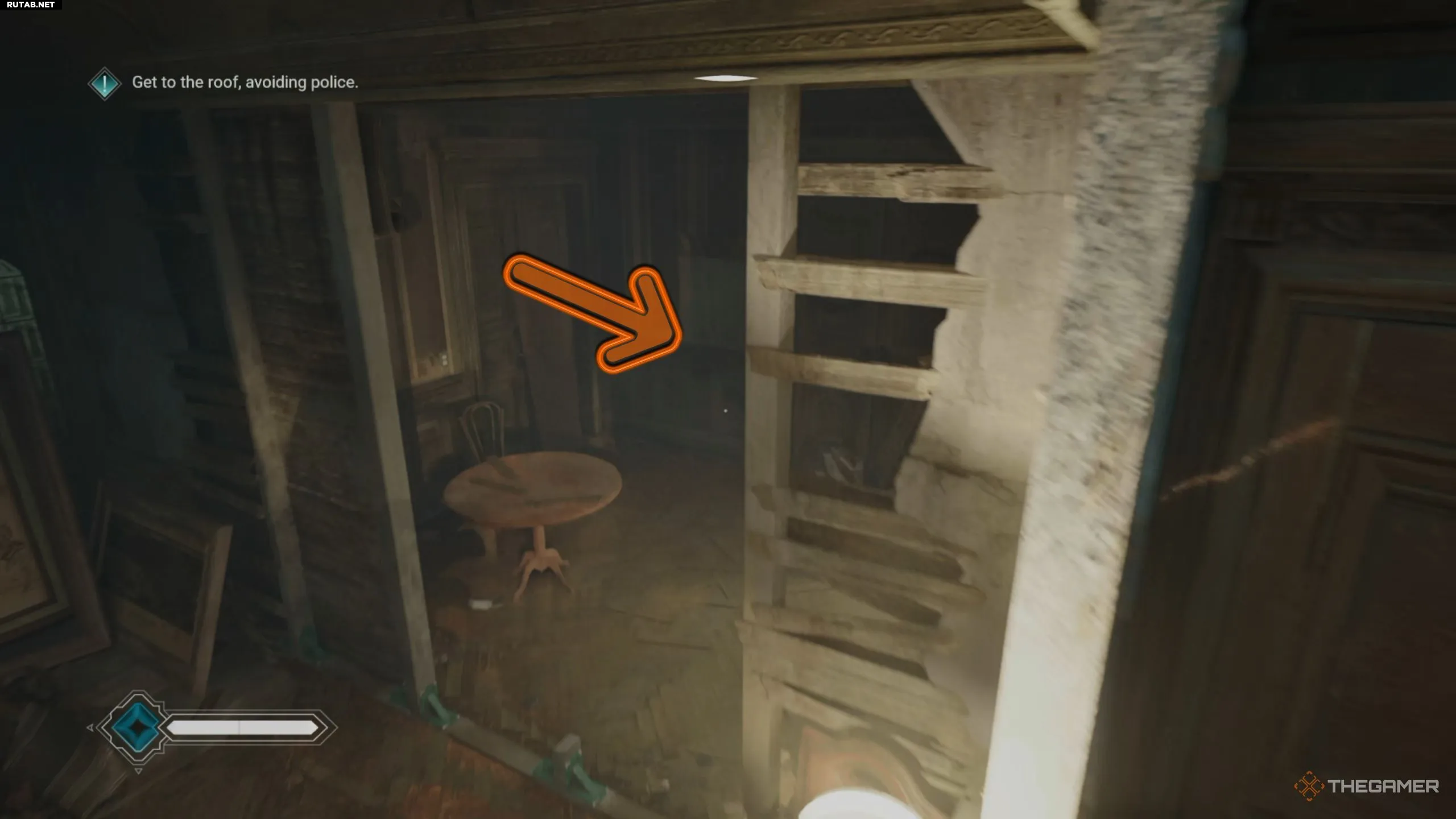 Войдя в комнату и посмотрев вниз, вы увидите двух гулей, охраняющих территорию. Первого можно легко устранить прыжковой атакой, изученной в обучении, а со вторым придётся сразиться в обычном бою. После победы над ними снова используйте особое зрение, чтобы обнаружить синие доски на потолке.
