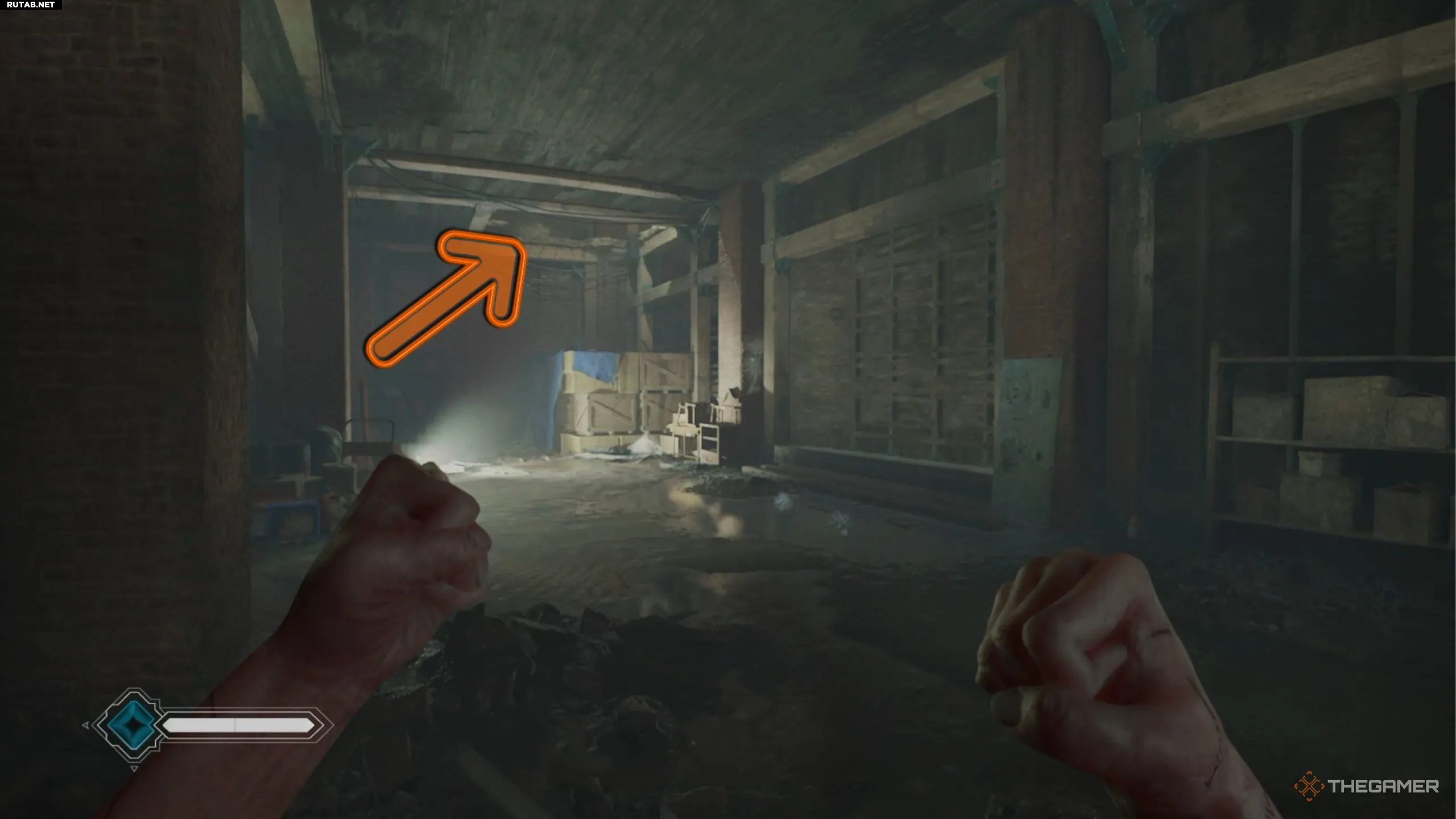 Перейдите мостик и войдите в помещения на другой стороне, где можно взаимодействовать с кровавым свёртком возле граффити. Далее рядом с лампой в этой комнате вы увидите путь вперёд и ещё одного полицейского. Вам нужно незаметно обойти офицера, не вступая в бой.