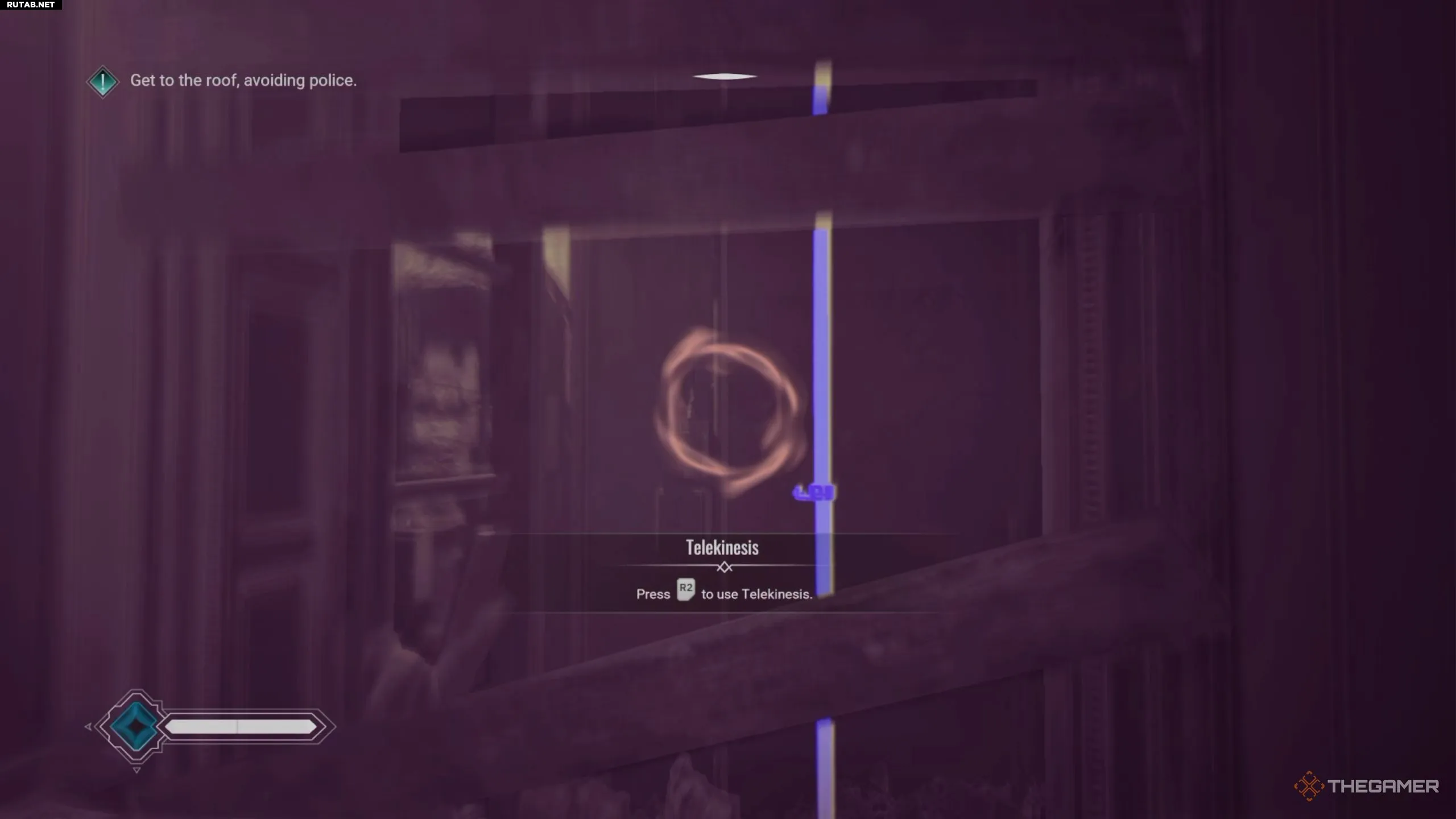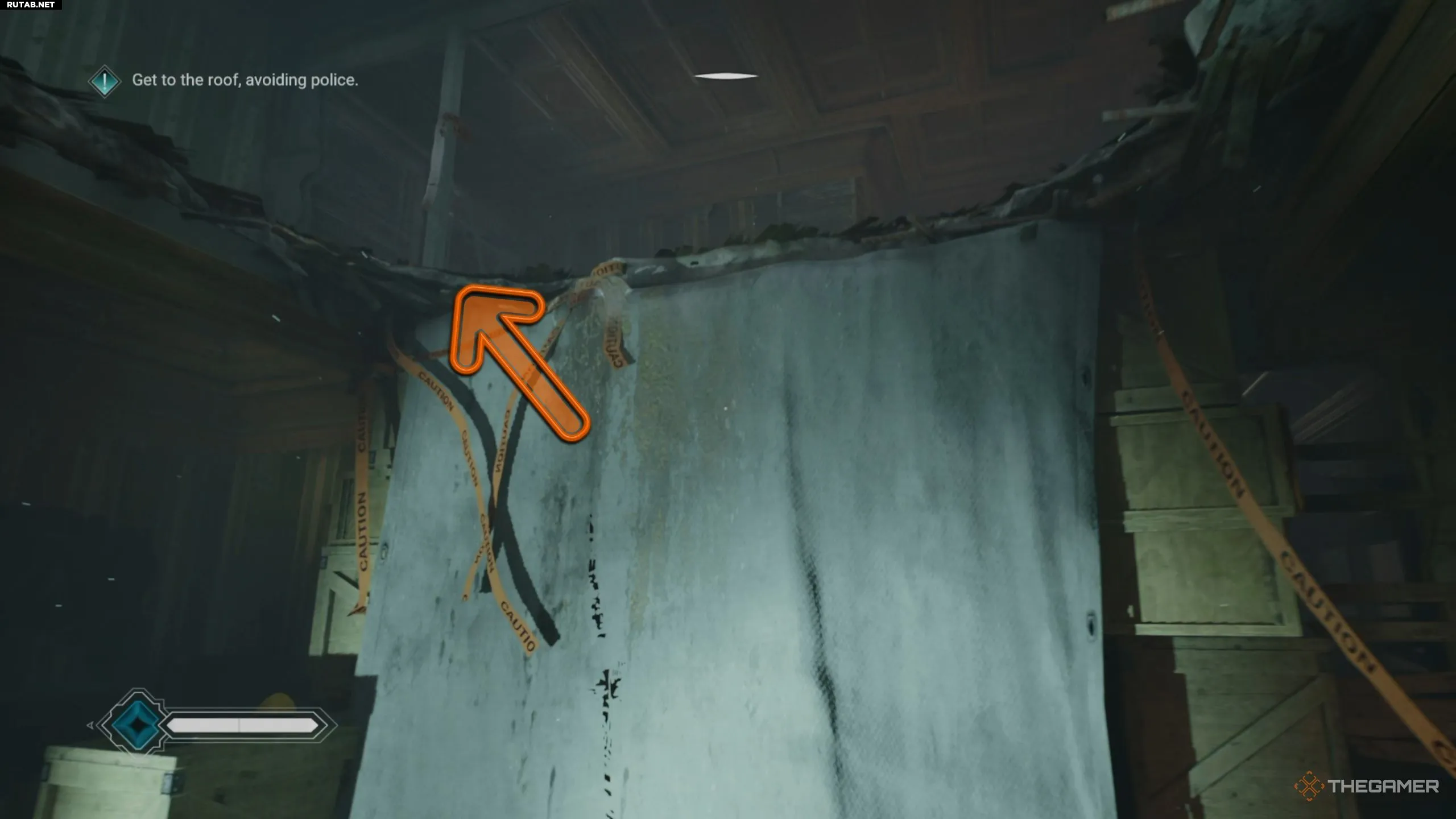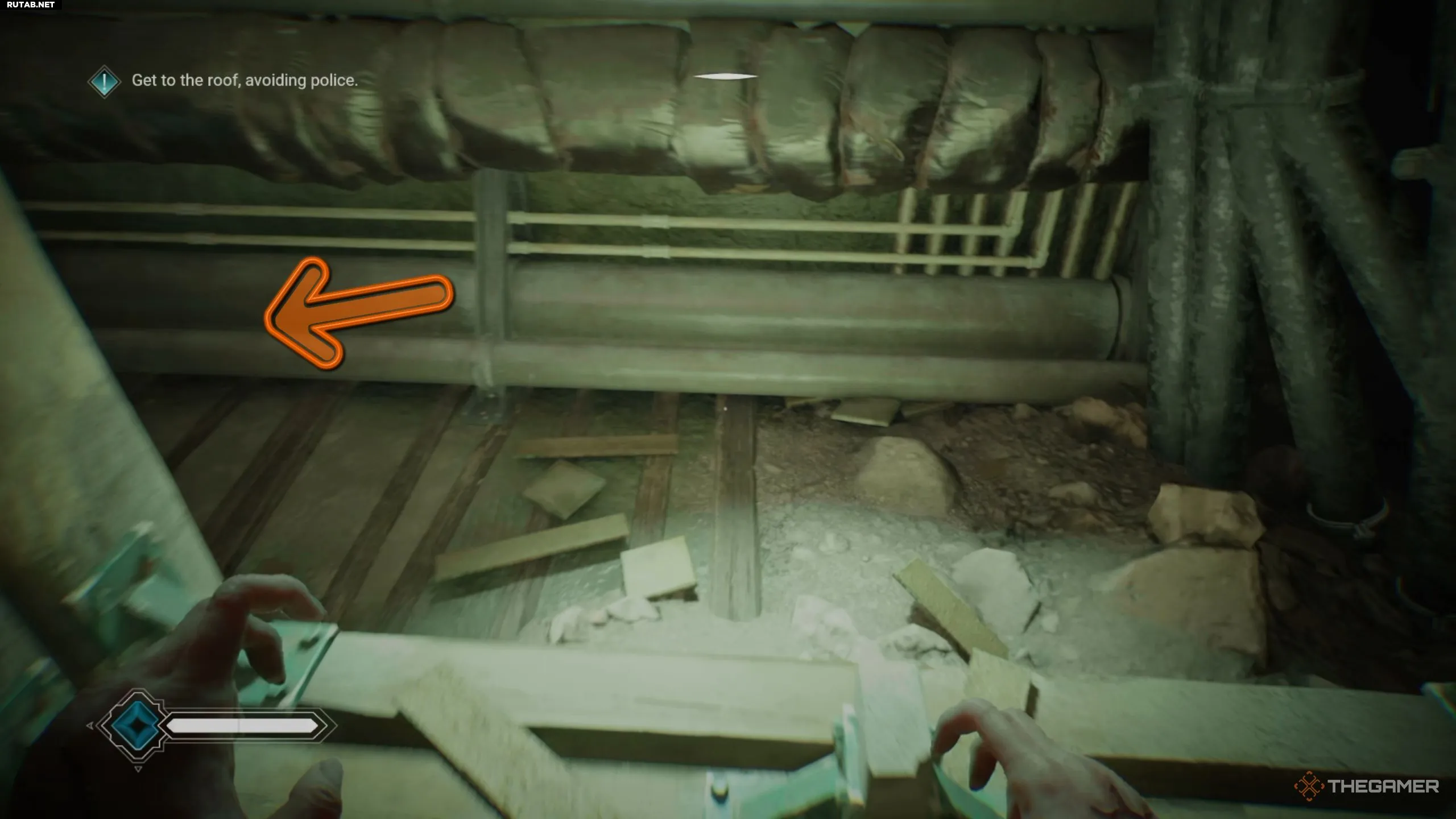 В следующей части квеста вы попадёте в основное здание и найдёте главный вход. Однако воспользоваться им не получится — выход надёжно охраняет полиция. После взаимодействия с дверью поверните направо и используйте особое зрение, чтобы обнаружить синюю трубу в шахте лифта.
