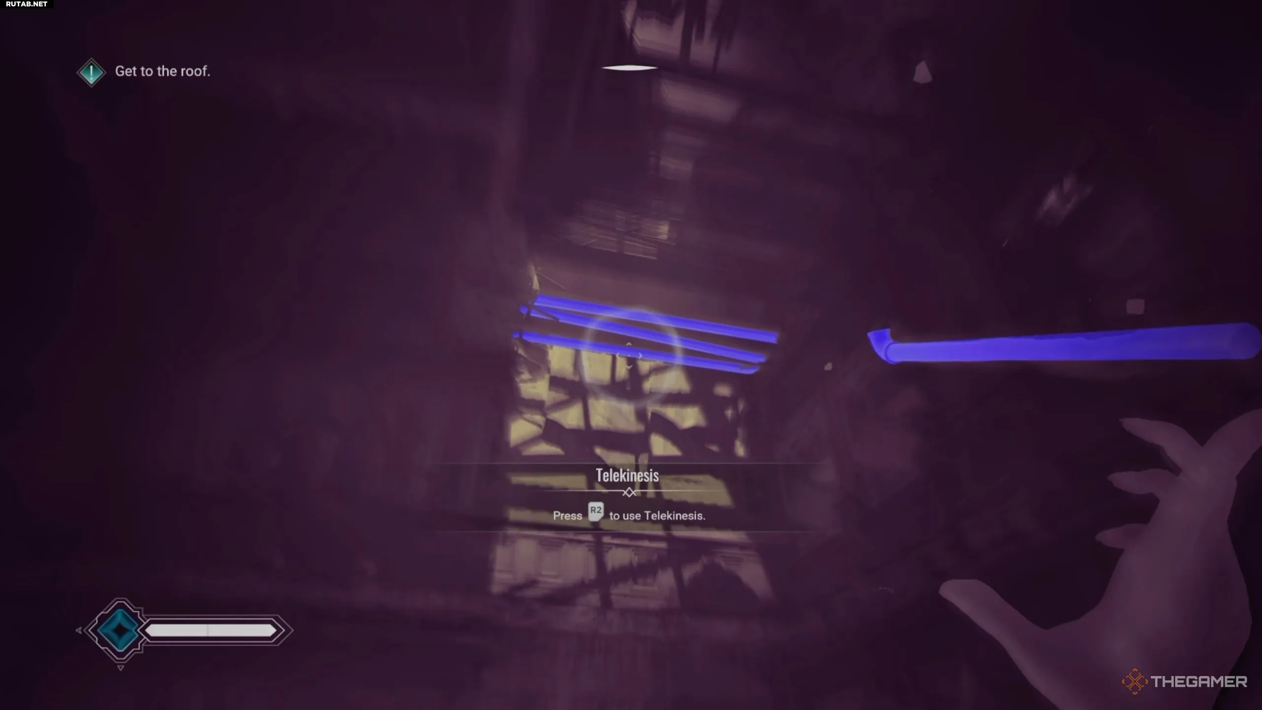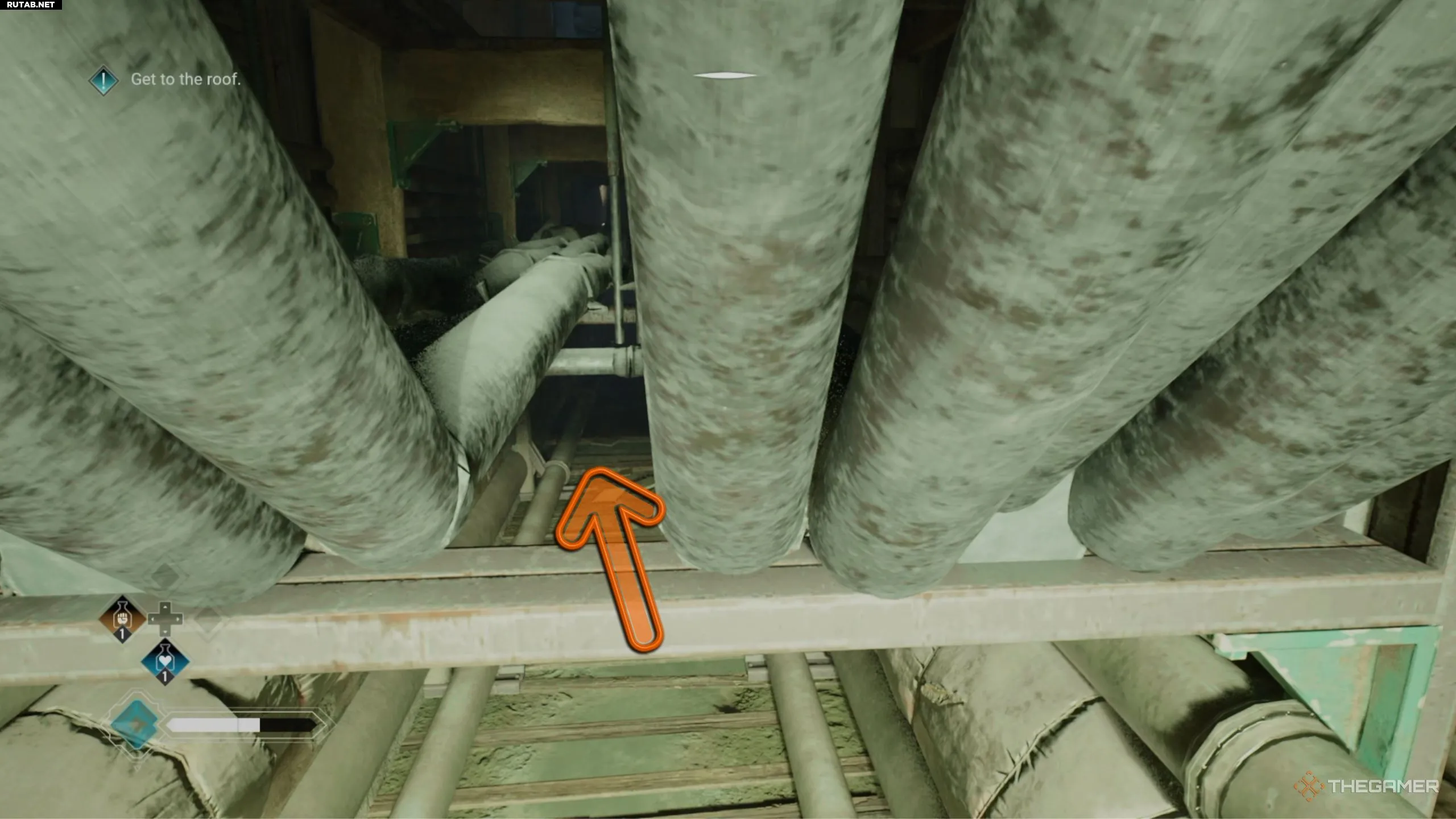Примените телекинез к этой трубе, что приведёт к падению лифта и откроет проход слева от него. Проберитесь в шахту, запрыгните на лифт и поднимитесь по лестнице выше. Продолжайте движение по коридорам, пока не попадёте в открытую зону с небольшим мостиком из досок.