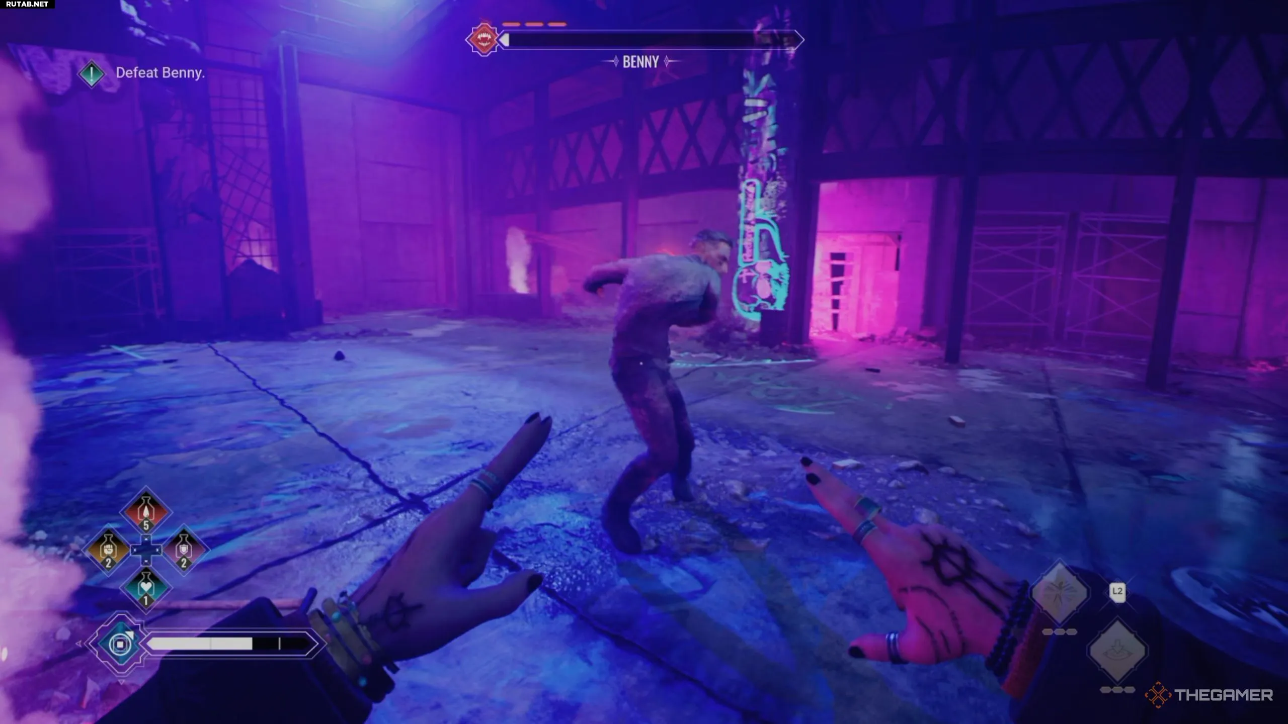 Помимо этих двух атак, Бенни может быстро ринуться к вам, если вы находитесь слишком далеко. Самый быстрый способ победить его — осмотреть поле боя с помощью обострённой чувствительности в поисках синих объектов. Обычно это оружие, которое наносит значительный урон.