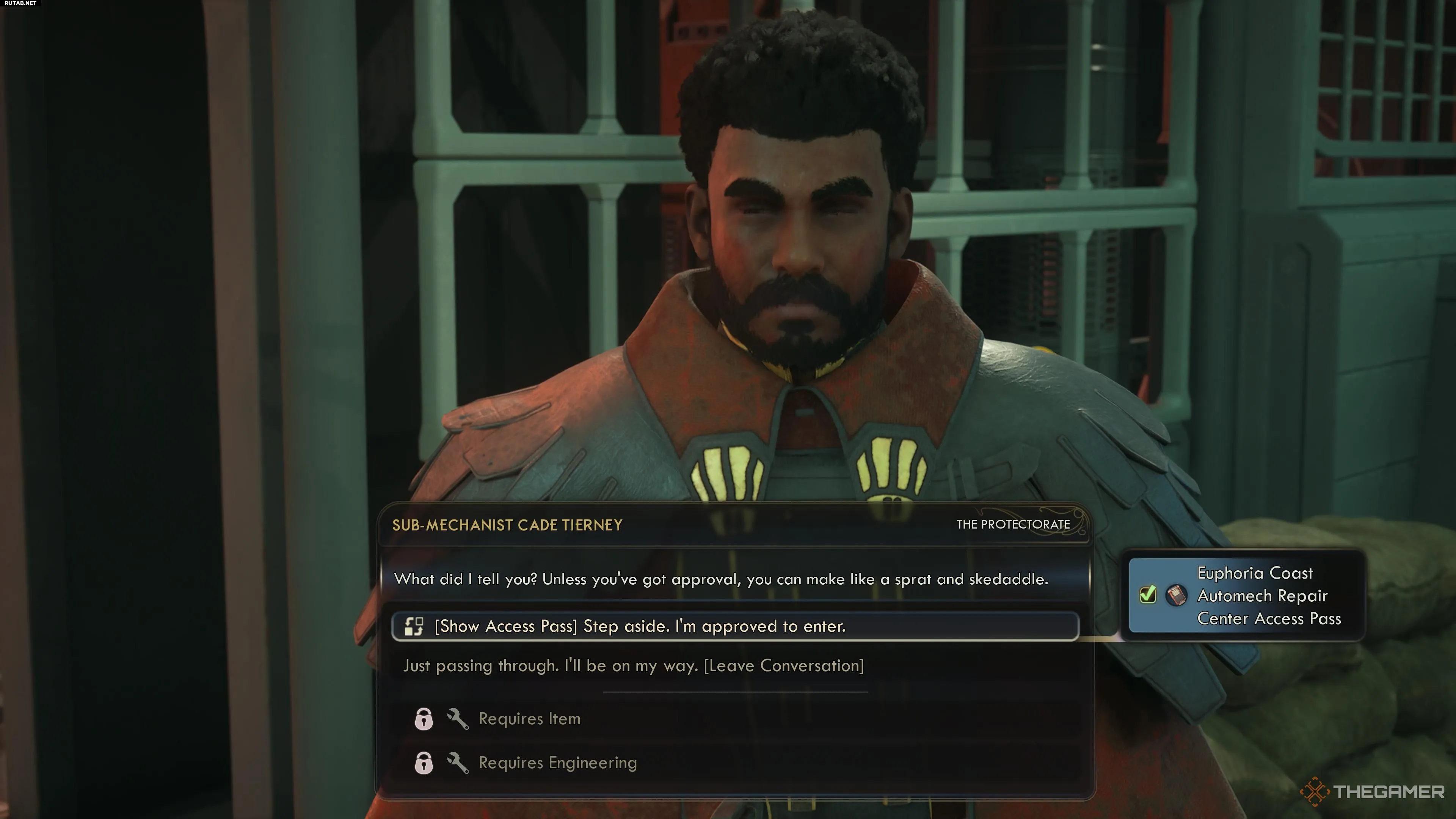 Хогарт направит вас в Ремонтный центр автомехов «Эйфория» в поисках запчастей. Логично, что их там должно быть больше, даже если они не горят желанием помогать городу, которого Протекторат объявил предателями. Однако сэкономим вам время на прогулках. Вы не можете просто так войти в Ремонтный центр автомехов. Если у вас достаточно высокий навык Инженерии, возможно, но в противном случае вам понадобится пропуск.