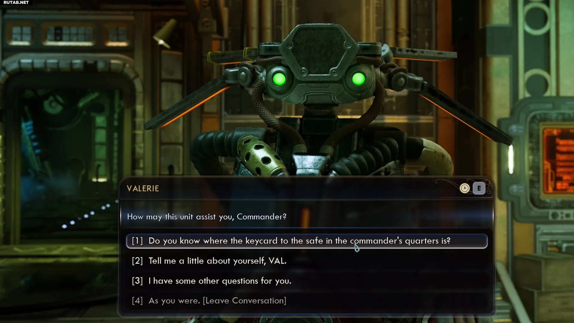 После прочтения этой записи поговорите с ВЭЛ на «Инкогнито» и спросите её: «Ты не знаешь, где ключ-карта от сейфа в покоях командира?» Она объяснит, что Найлз отдал его ей, чтобы спрятать в месте, где он сам не смог бы его найти, — и сообщит, что ключ от сейфа командира находится за Скип-драйвом в задней части корабля.