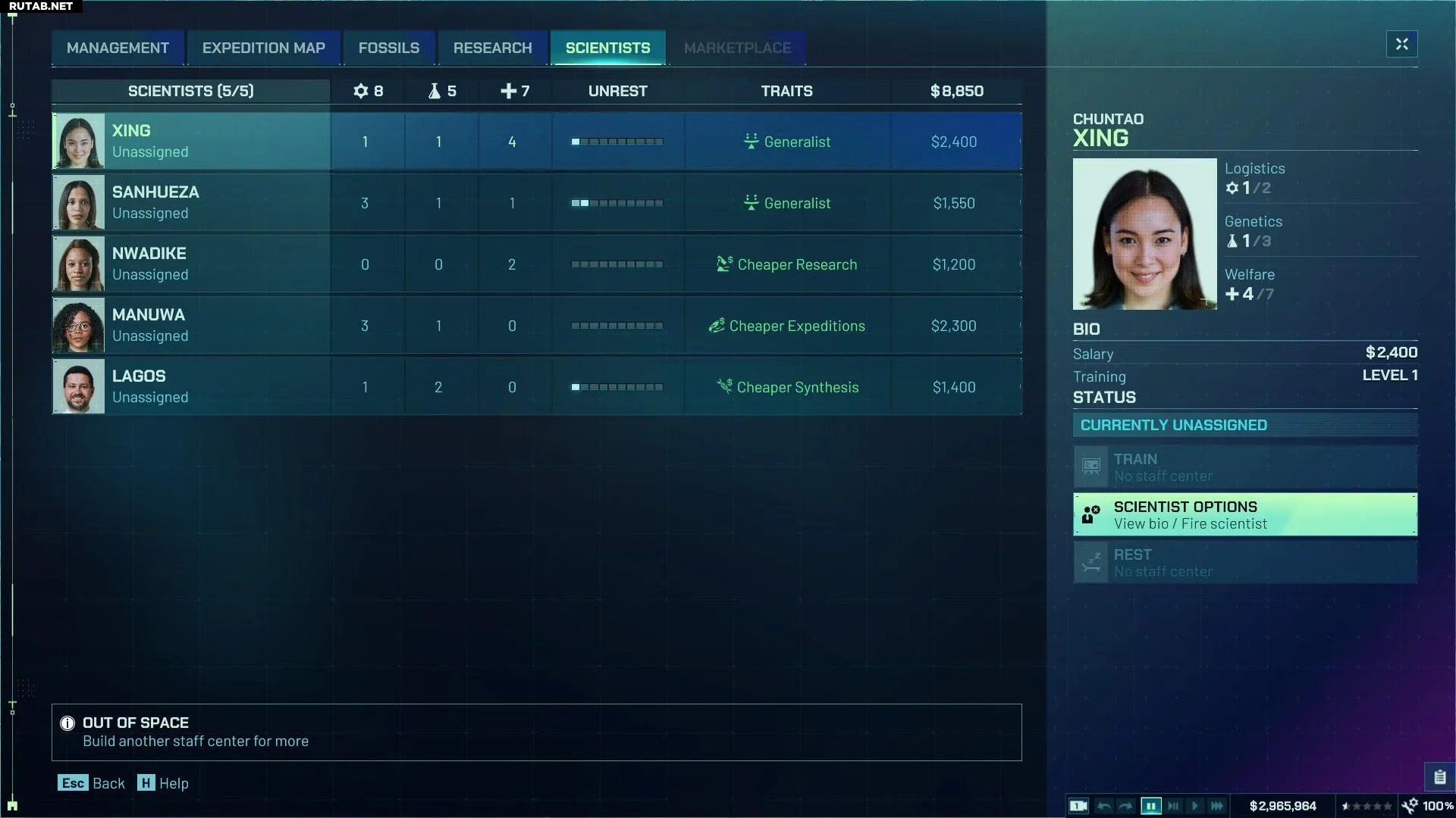 После постройки откройте меню Центра управления и выберите опцию «Нанять ученых». Вы увидите список кандидатов с разными навыками, специализациями и зарплатными требованиями. Каждый ученый обладает уникальными чертами, уровнем навыков и потенциалом для обучения.