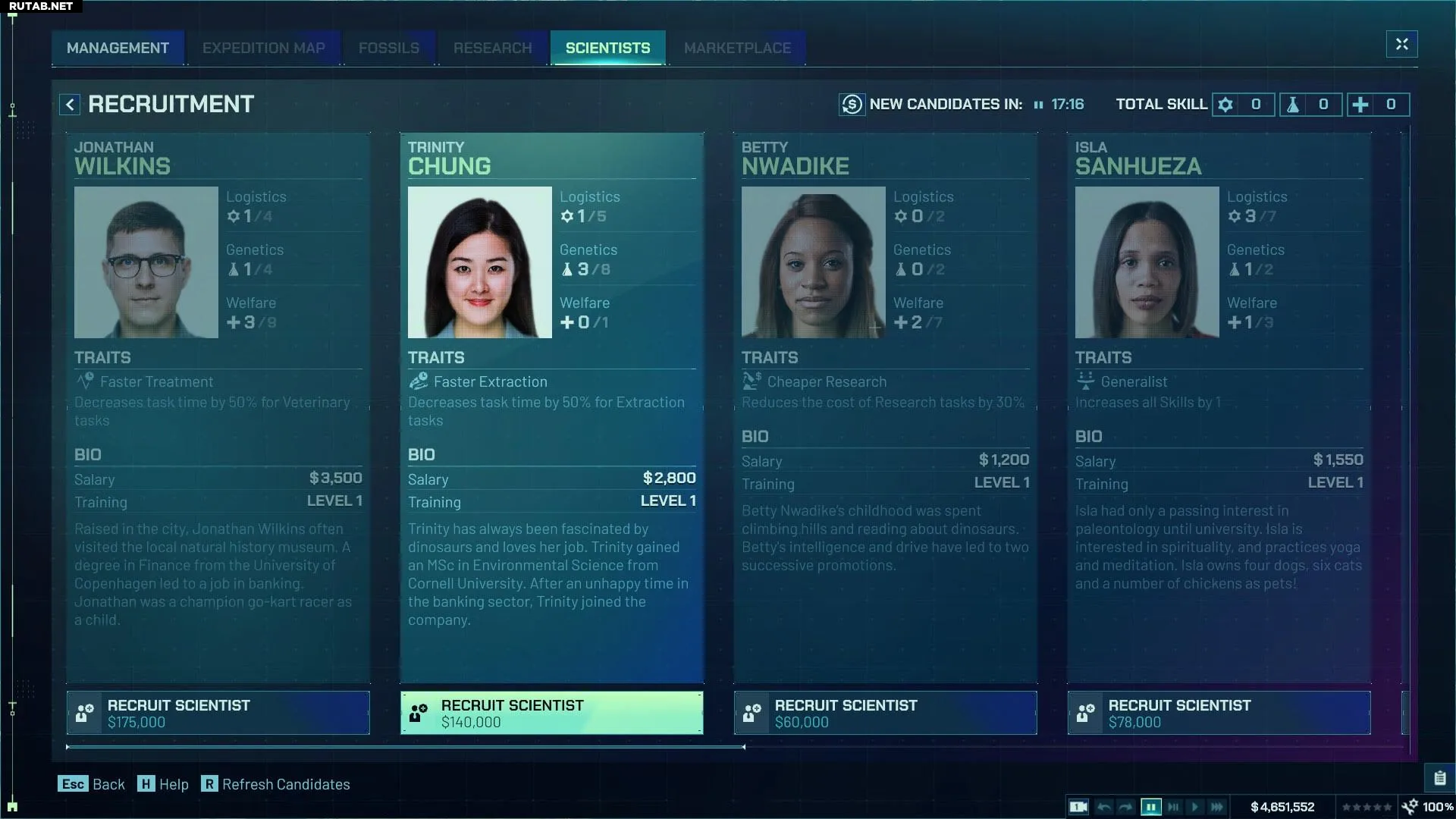 Выбирайте кандидатов, ориентируясь на текущие потребности парка и бюджет. Если доступные ученые вас не устраивают, подождите — список обновится через некоторое время.