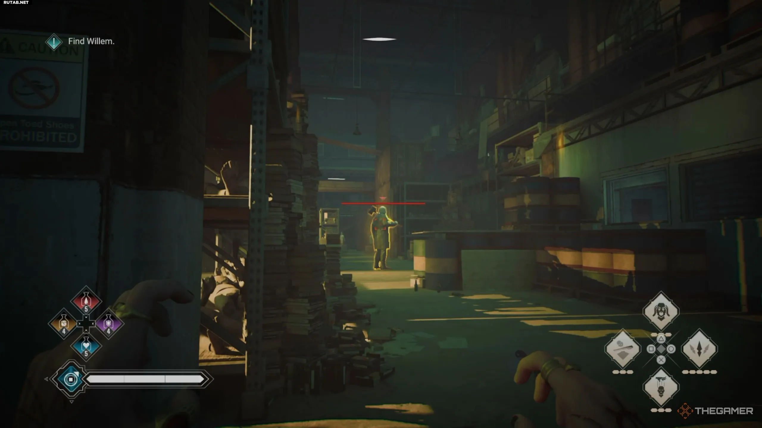 Когда Виллем погружает вас в иллюзию, вам предстоит трижды пройти через одну и ту же фабрику пластмасс. Однако каждый раз на открытой площадке вас ждут разные испытания. Первые два испытания связаны с боем, а в третьем нужно решить небольшую головоломку. В первом заходе вы встретите Саббата в главной зоне.