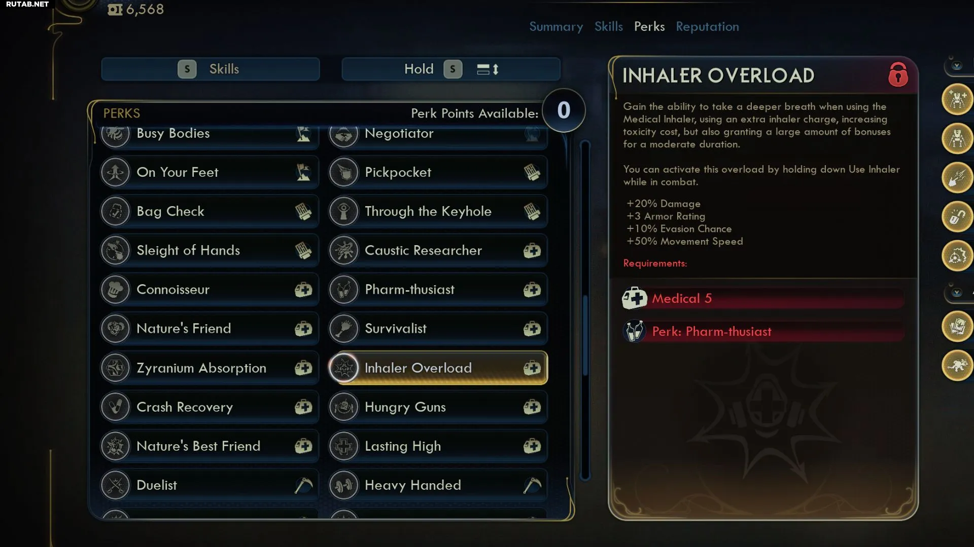 | Перегрузка ингалятора | Вы получаете способность делать более глубокий вдох при использовании медицинского ингалятора, расходуя дополнительный заряд, увеличивая токсичность, но также получая значительные бонусы на умеренное время. Активируйте эту перегрузку, удерживая кнопку использования ингалятора в бою. | +20% к урону, +3 к рейтингу брони, +10% к шансу уклонения, +50% к скорости движения | Медицина 5, Перк: Фарм-энтузиаст |