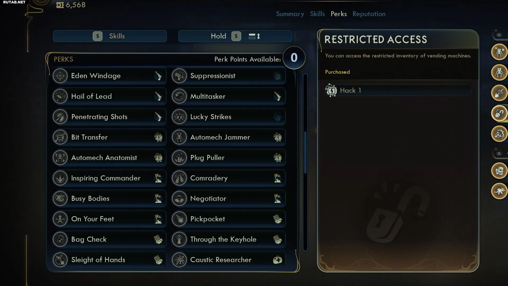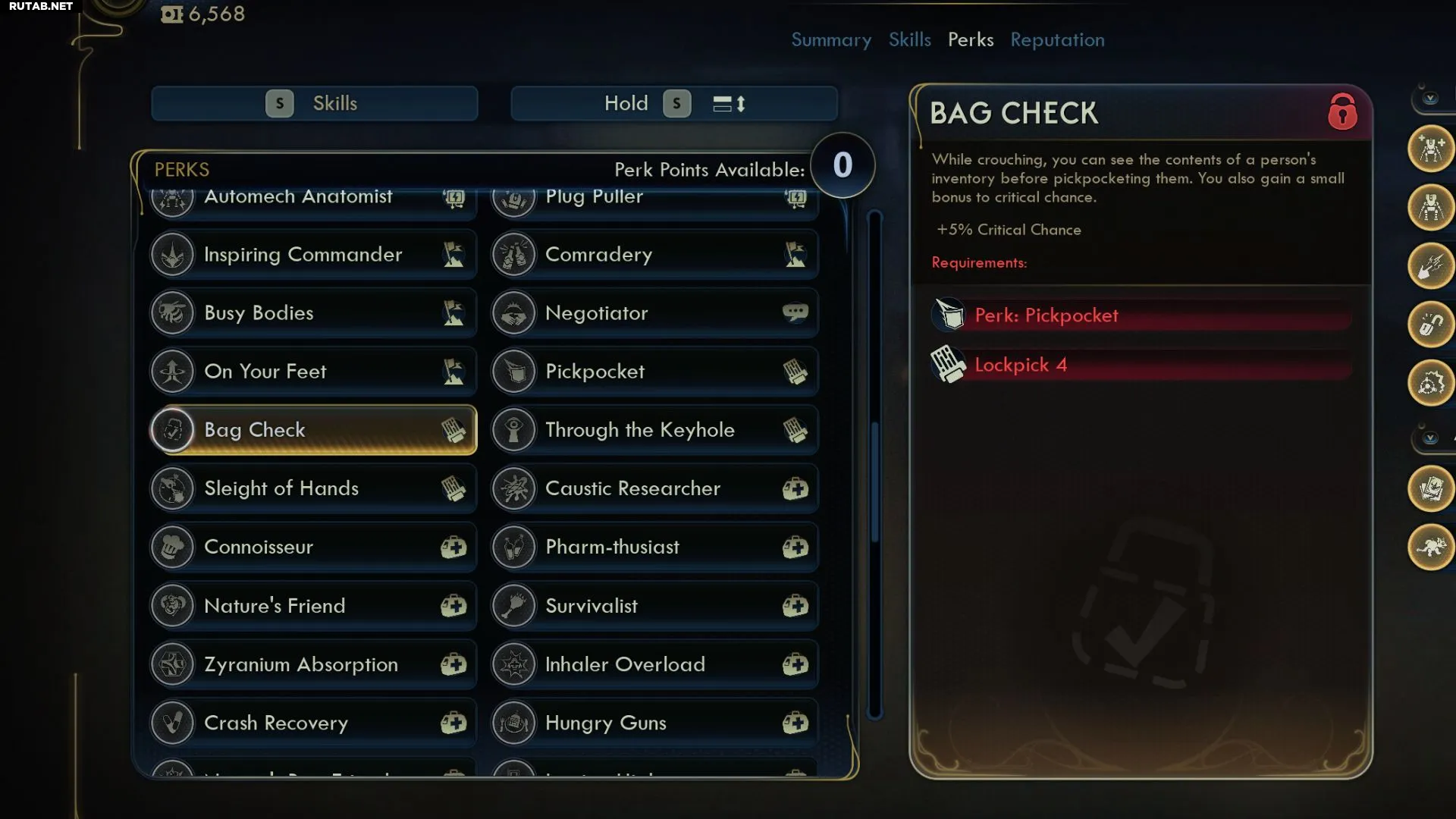 | Карманник | Вы получаете способность воровать из карманов других персонажей. Кража активируется, когда вы подкрадываетесь к ничего не подозревающему человеку и имеете достаточный навык Взлома. | Н/Д | Взлом 1 |