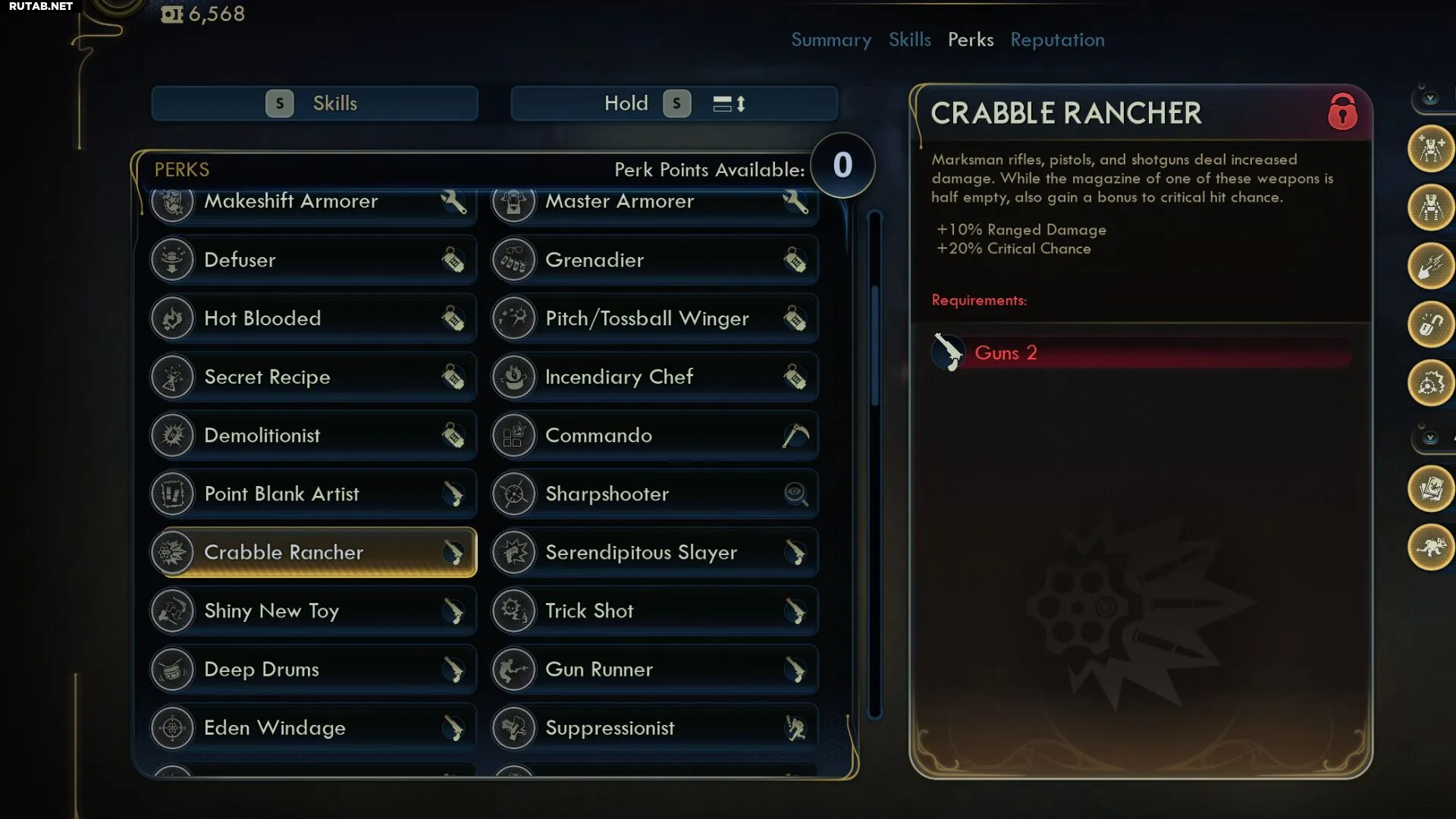 | Стрелок-ранчер | Снайперские винтовки, пистолеты и дробовики наносят увеличенный урон. Когда магазин одного из этих видов оружия наполовину пуст, вы также получаете бонус к шансу критического удара. | +10% к дальнобойному урону, +20% к шансу критического удара | Огнестрельное 2 |