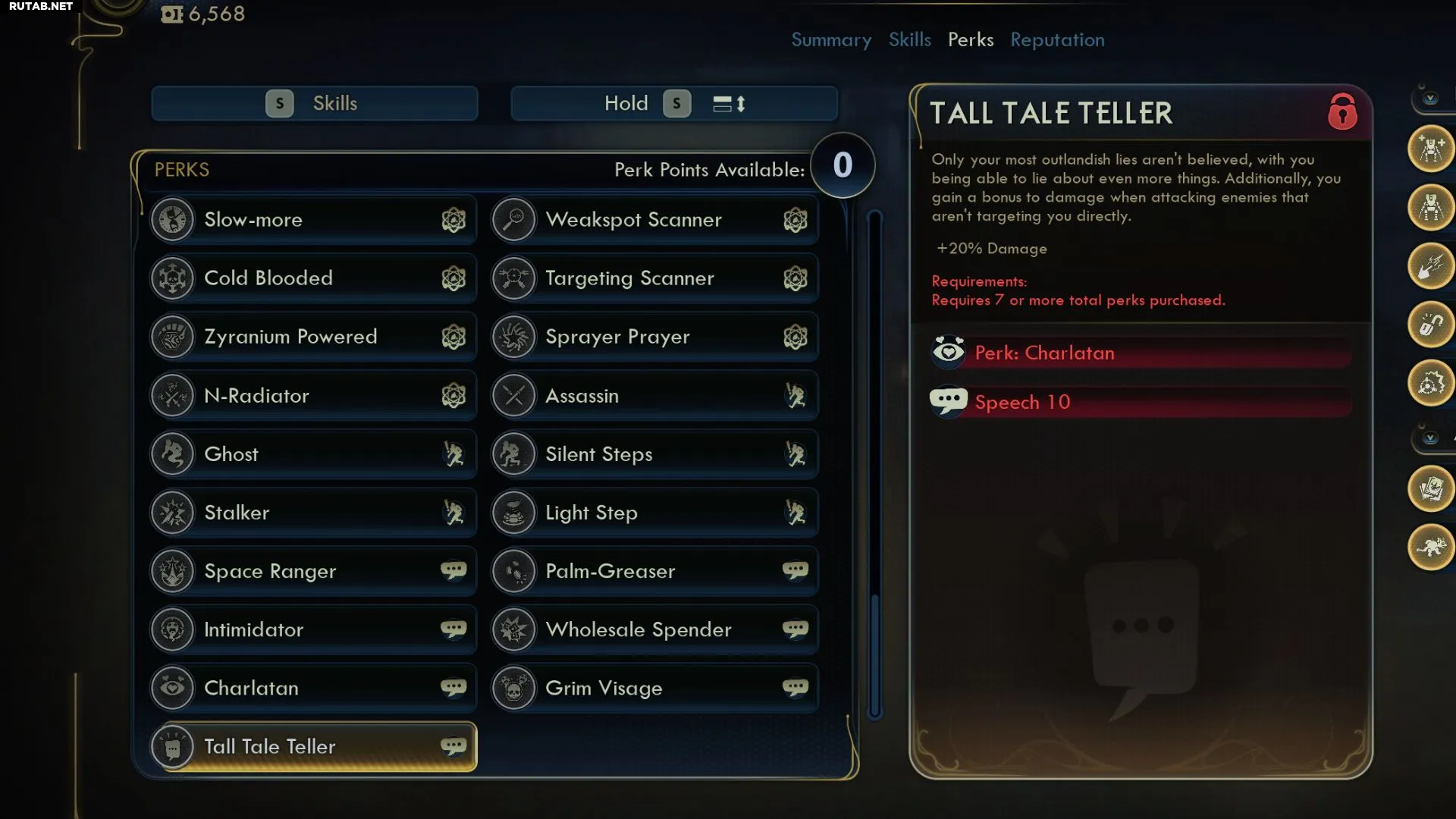 | Мастер небылиц | Только самые невероятные ваши ложные утверждения не принимаются за правду, и вы можете лгать о ещё большем количестве вещей. Кроме того, вы получаете бонус к урону при атаке врагов, которые не нацелены на вас напрямую. | +20% к урону | Красноречие 10, необходимо приобрести 7 других перков, включая перк: Шарлатан |
