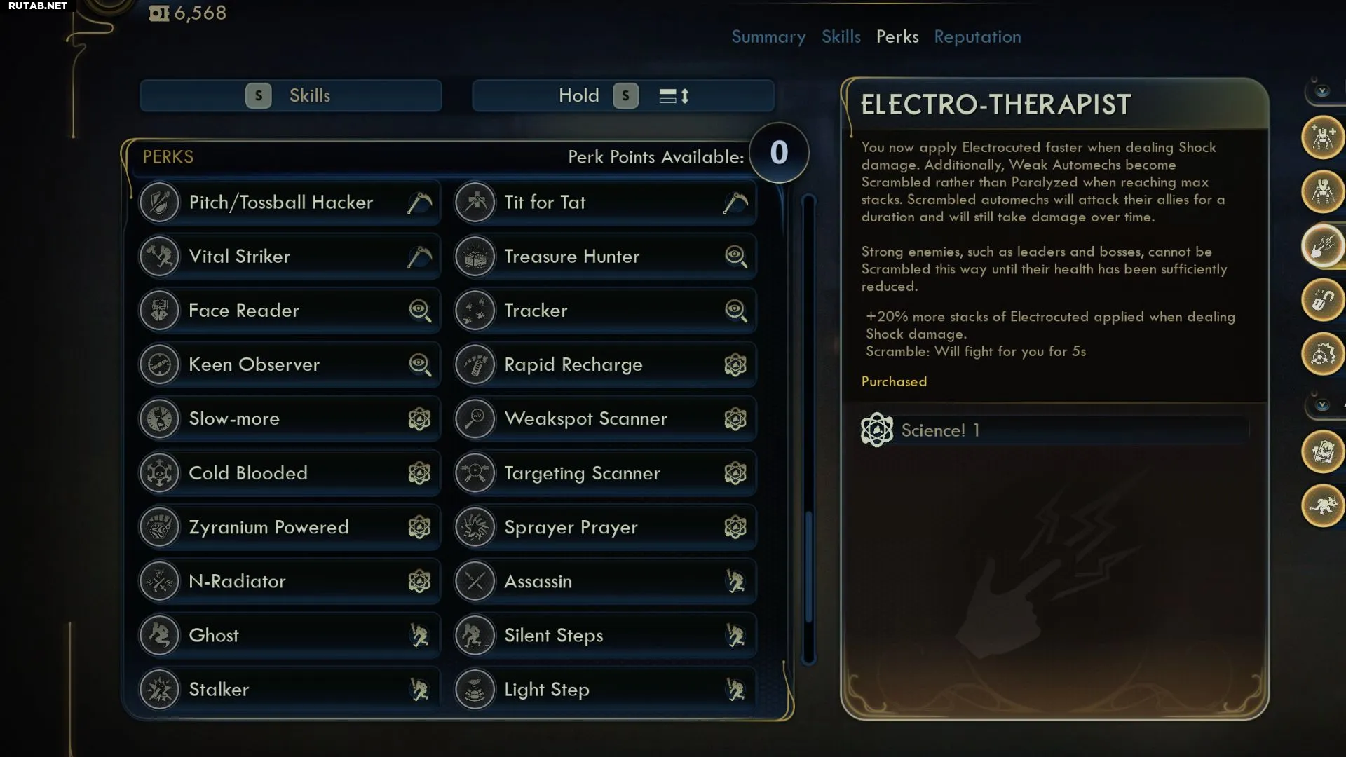 | Электротерапевт | Вы накладываете статус Поражение током быстрее при нанесении шокового урона. Слабые автомехи при достижении максимального количества стаков получают статус Сбой вместо Паралича. Не работает против сильных врагов, пока их здоровье не будет значительно снижено. | +20% к скорости наложения стаков Поражения током, Сбой: автомех сражается за вас 5 сек. | Наука 1 |