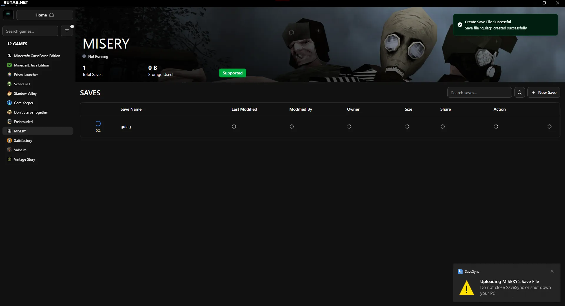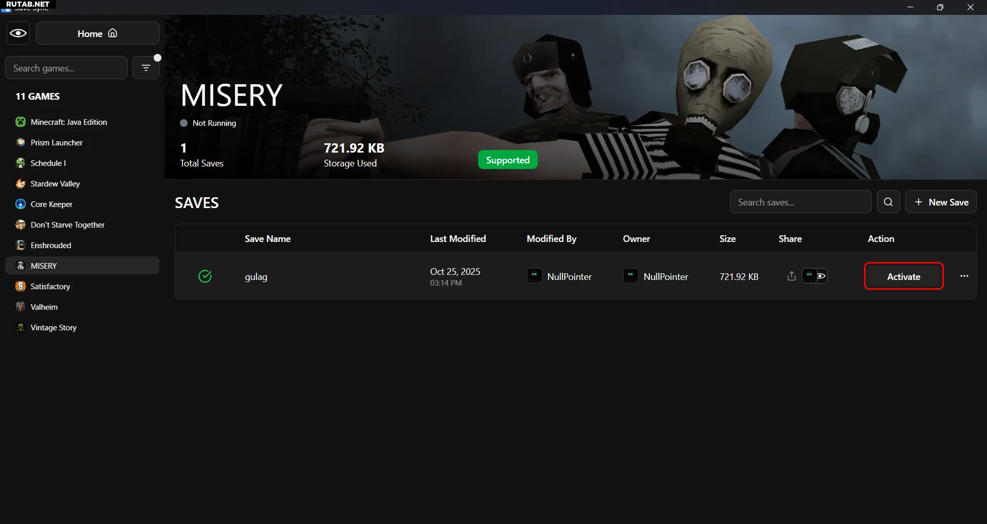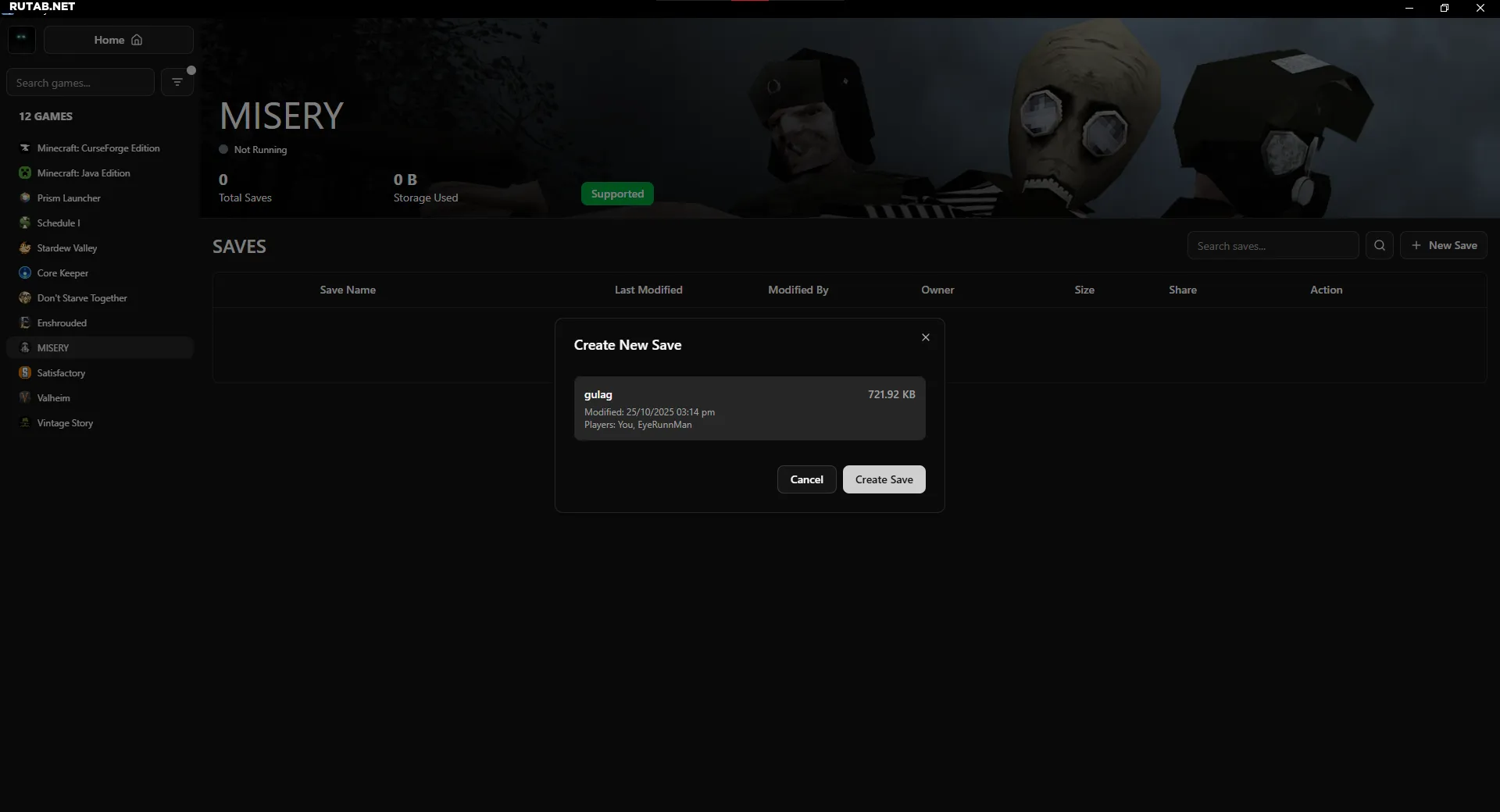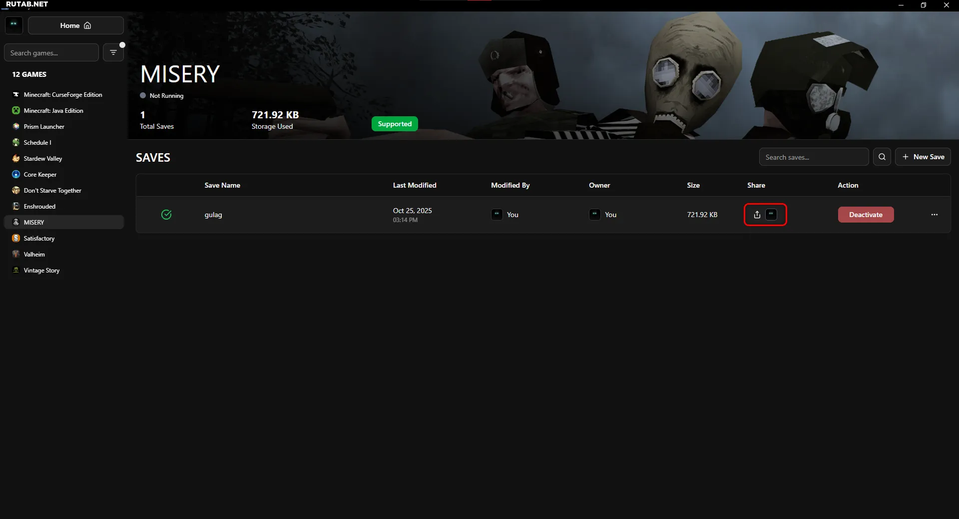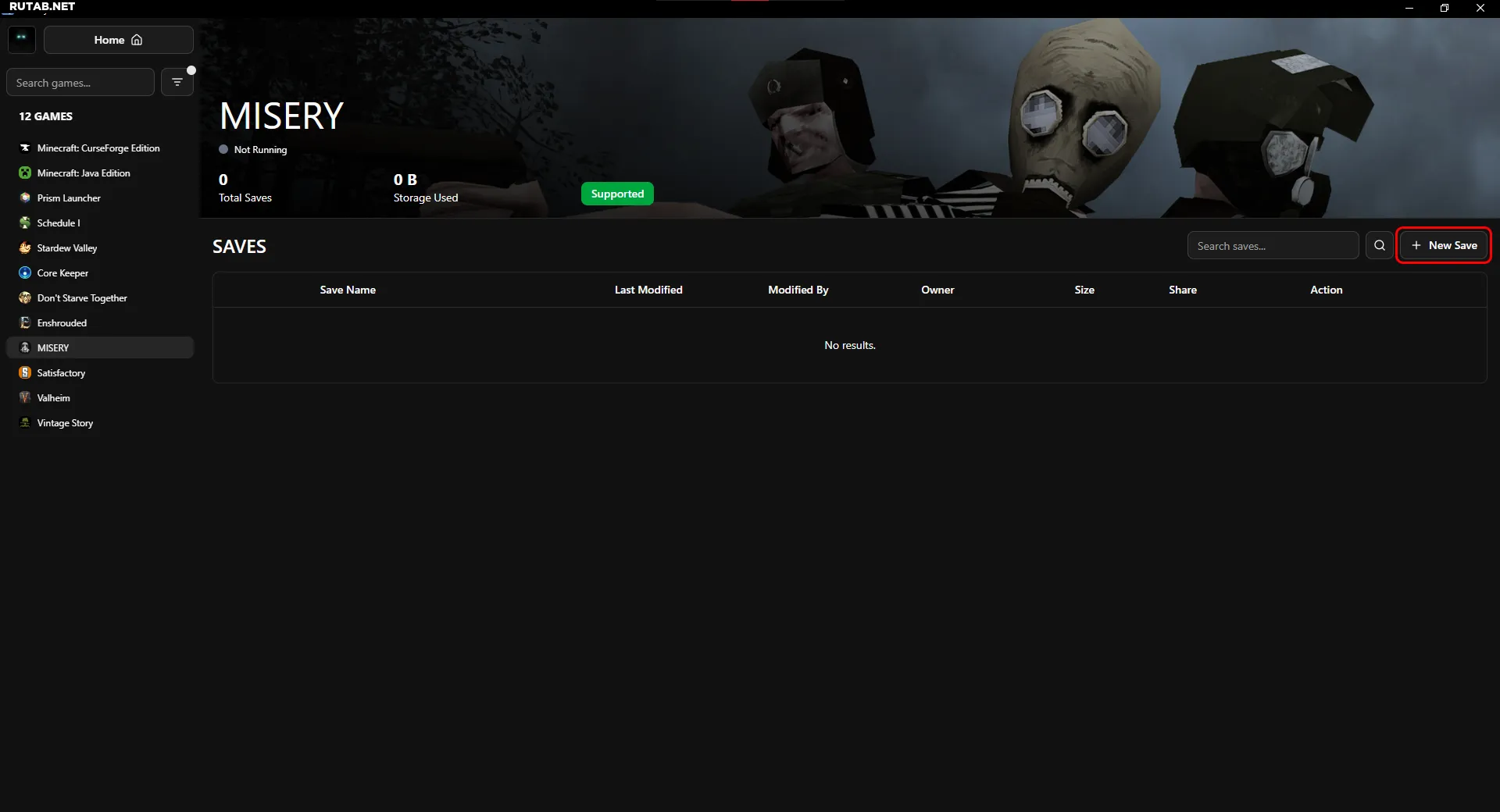 Нажмите на MISERY в списке слева, чтобы открыть страницу управления сохранениями.