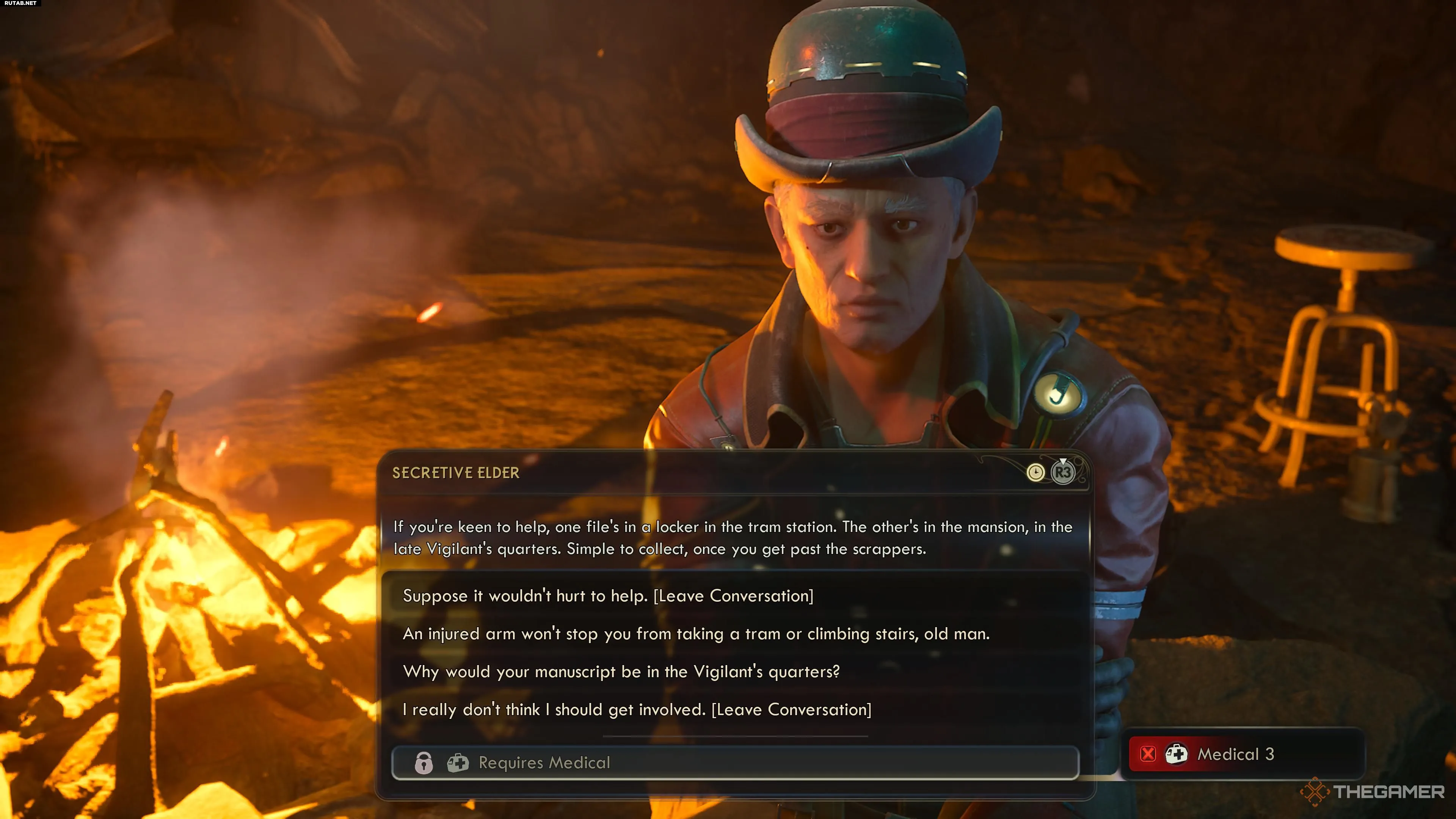 Перебравшись через реку, продолжайте путь на восток. Вы увидите небольшой костёр на холме и мужчину, сидящего рядом. Подойдите и заговорите с ним. Он объяснит, что остро нуждается в вашей помощи — нужно забрать его рукописи из поместья Стражей высоко в горах. Сам он не может этого сделать, так как травмировался во время подъёма.