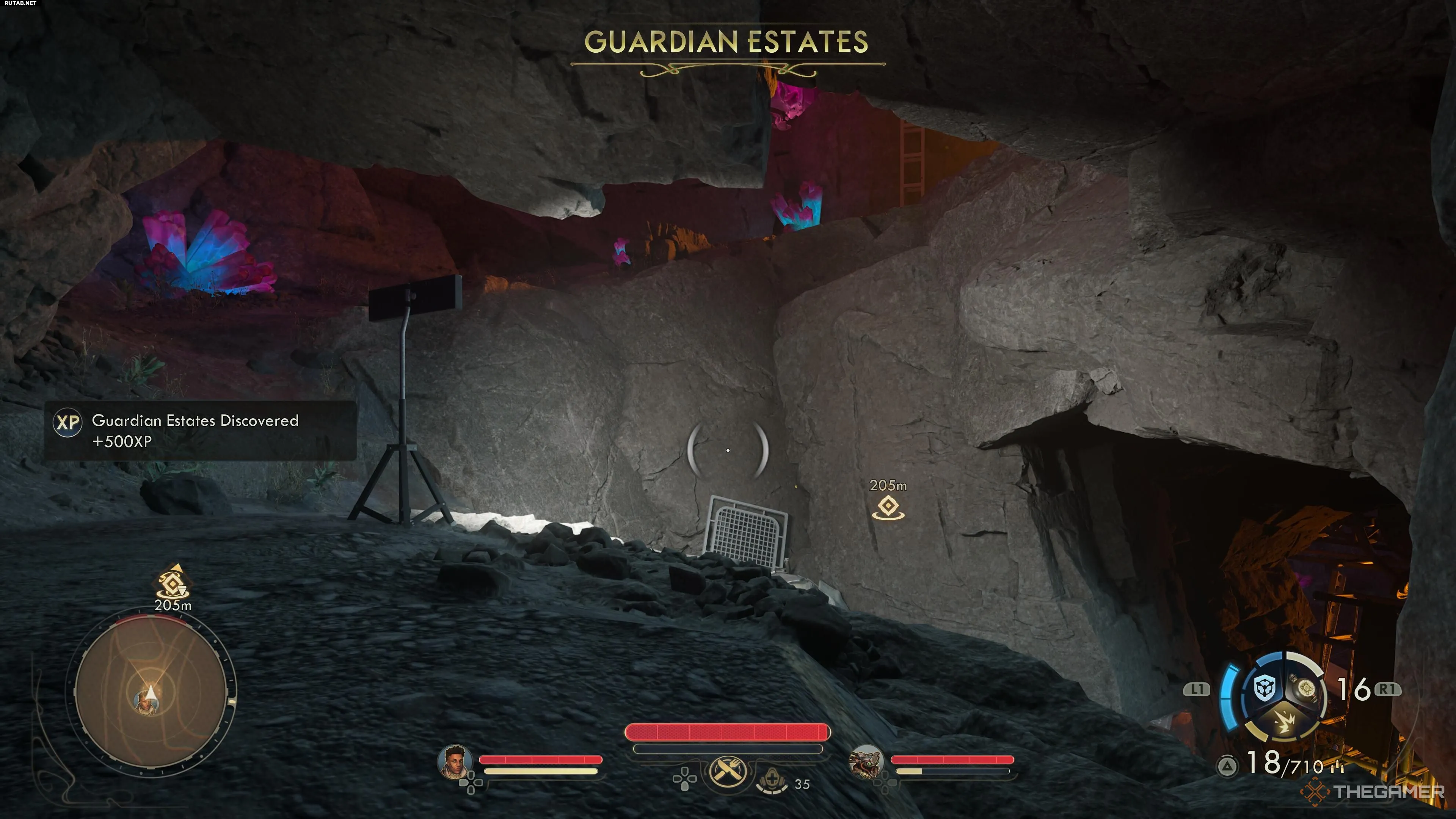 Поднявшись достаточно высоко, вы увидите, что путь продолжается вперёд, где вас ждут новые скрапперы. Рядом также есть группа камней, на которые можно взобраться — это приведёт вас ещё быстрее к самой вершине поместья Стражей. Выберите этот путь, если хотите избежать столкновения. Оказавшись здесь, вы попадёте в главный двор поместья. Исследовать нижние секции лагеря скрапперов вы всегда сможете позже, когда почувствуете себя готовыми.