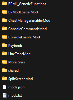 CheatManagerEnablerMod : 1 ConsoleCommandsMod : 1 ConsoleEnablerMod : 1 SplitScreenMod : 0 LineTraceMod : 1 BPML_GenericFunctions : 1 BPModLoaderMod : 1 MoreRVers : 1 ; Built-in keybinds, do not move up! Keybinds : 1