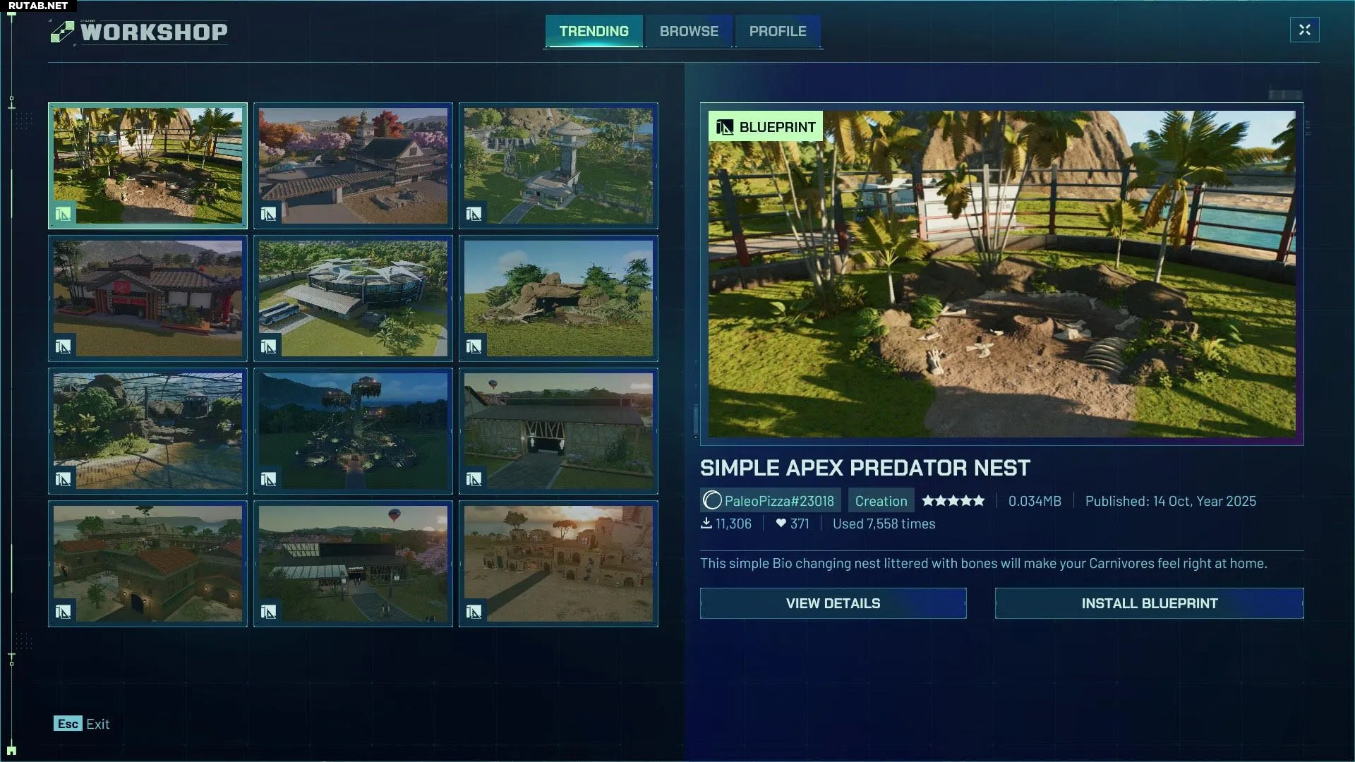 Если вы хотите сразу приступить к делу, используйте чертежи. Это предварительно спроектированные макеты парков, которые позволяют пропустить утомительную подготовительную работу и мгновенно разместить функционирующие объекты. С помощью Frontier Workshop вы найдёте множество готовых вариантов.